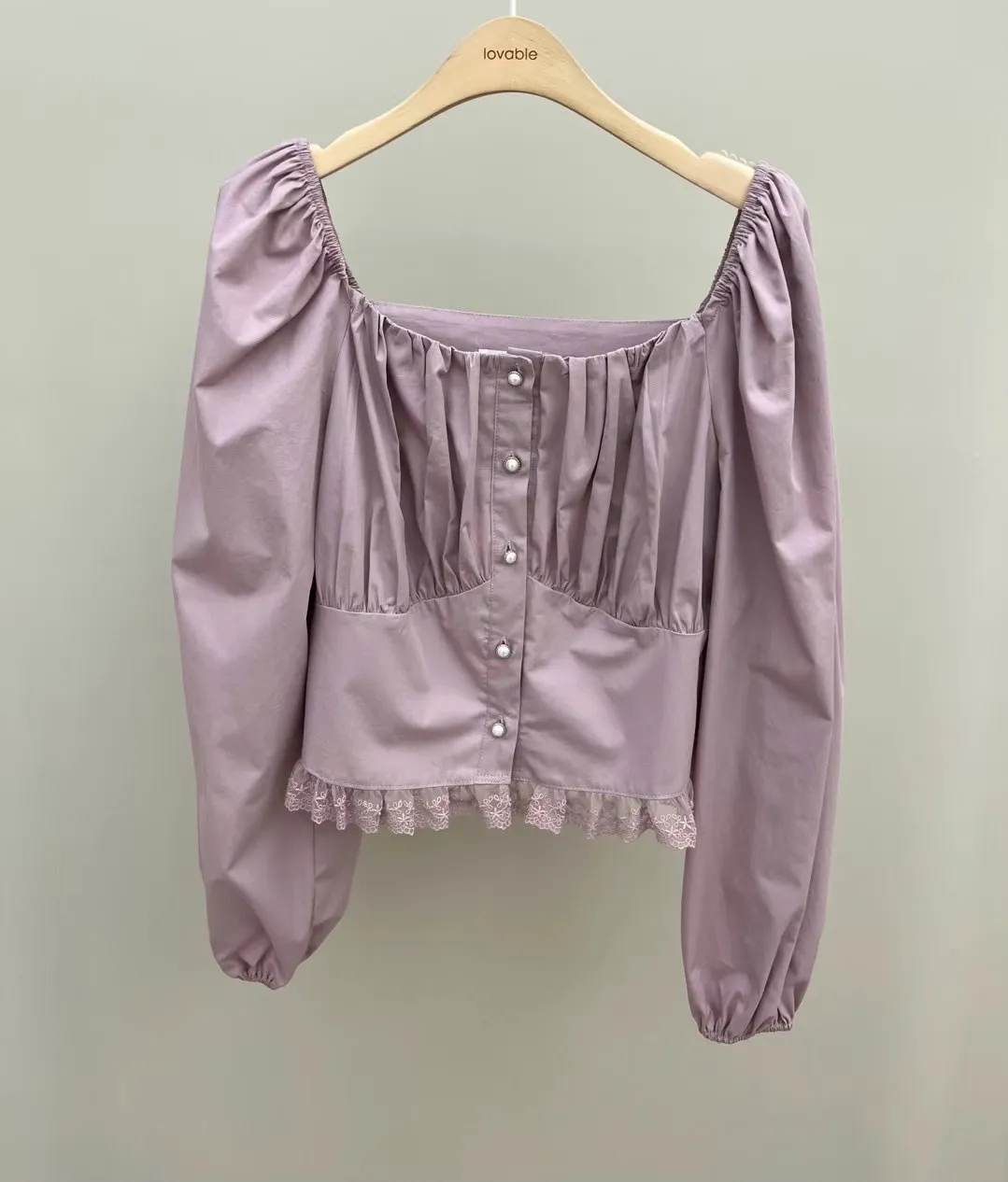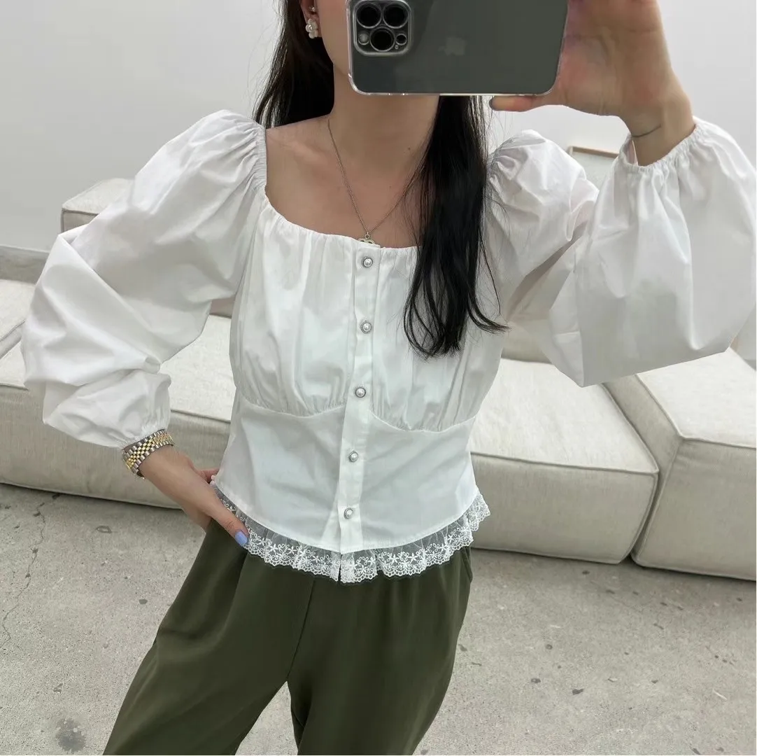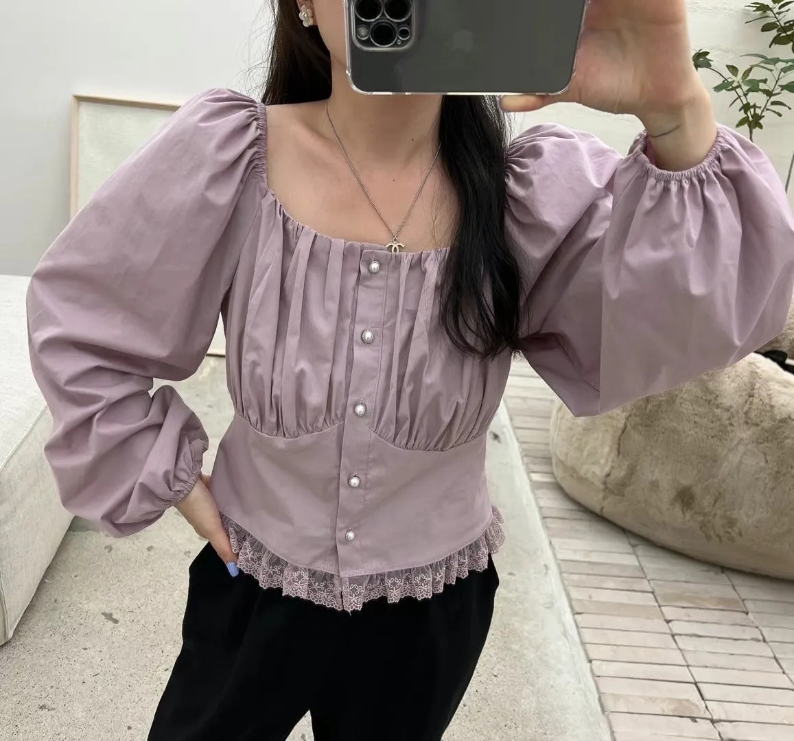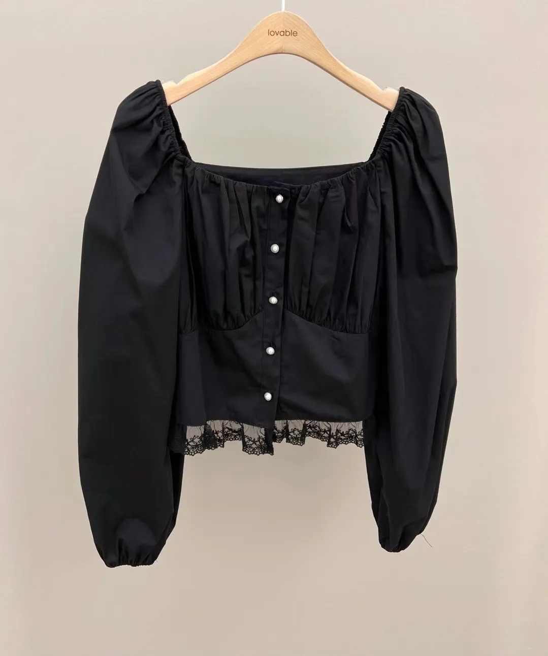 方領單排扣蕾絲襯衫