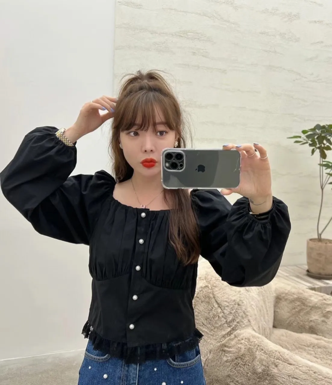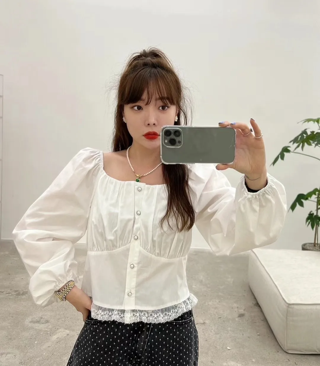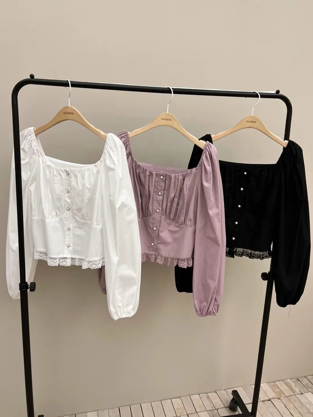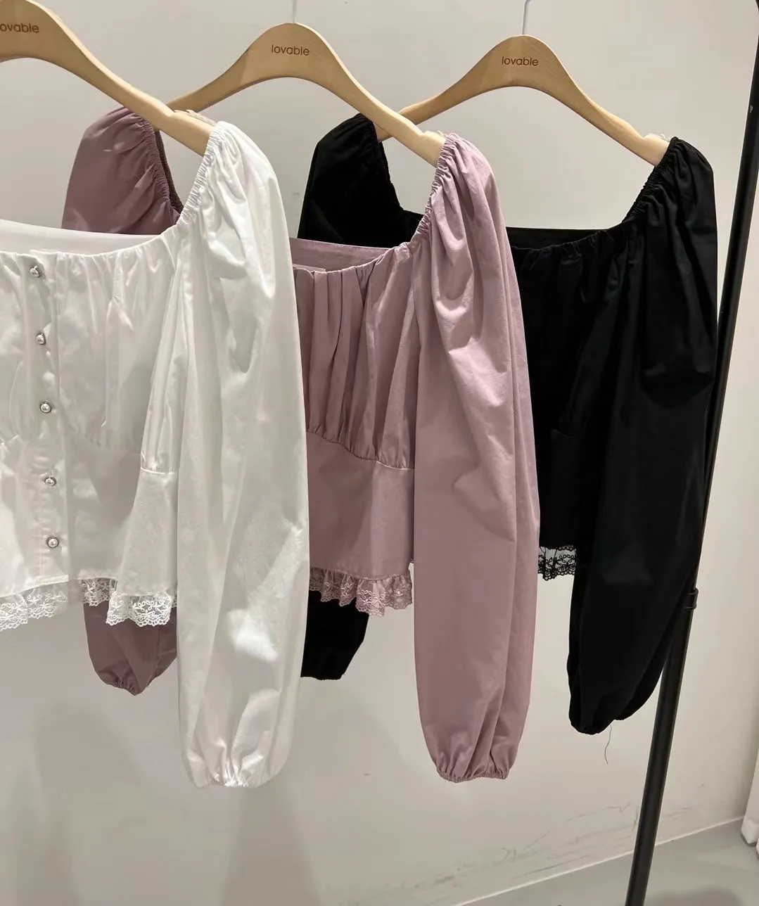 方領單排扣蕾絲襯衫