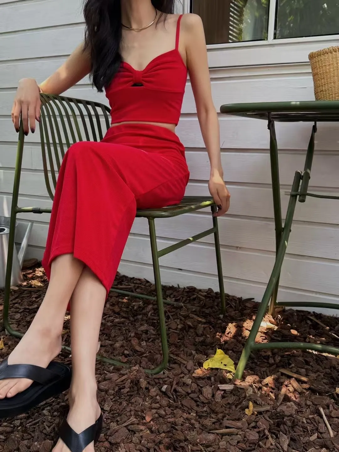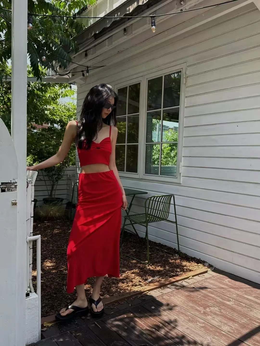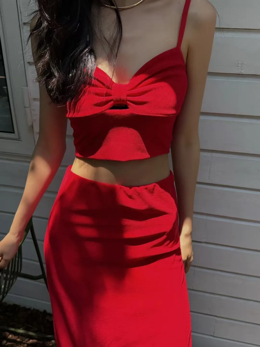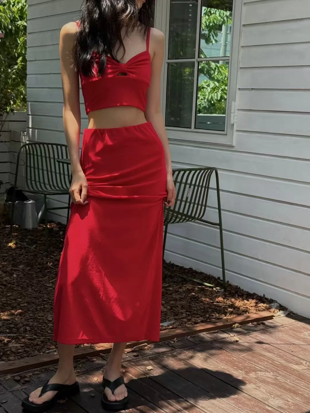 #兩件式套裝 #短版背心 #中長裙 #抓皺設計 #後開衩裙 #紅黑兩色 #度假穿搭 #日常時尚 #顯瘦套裝 #夏日穿搭靈感