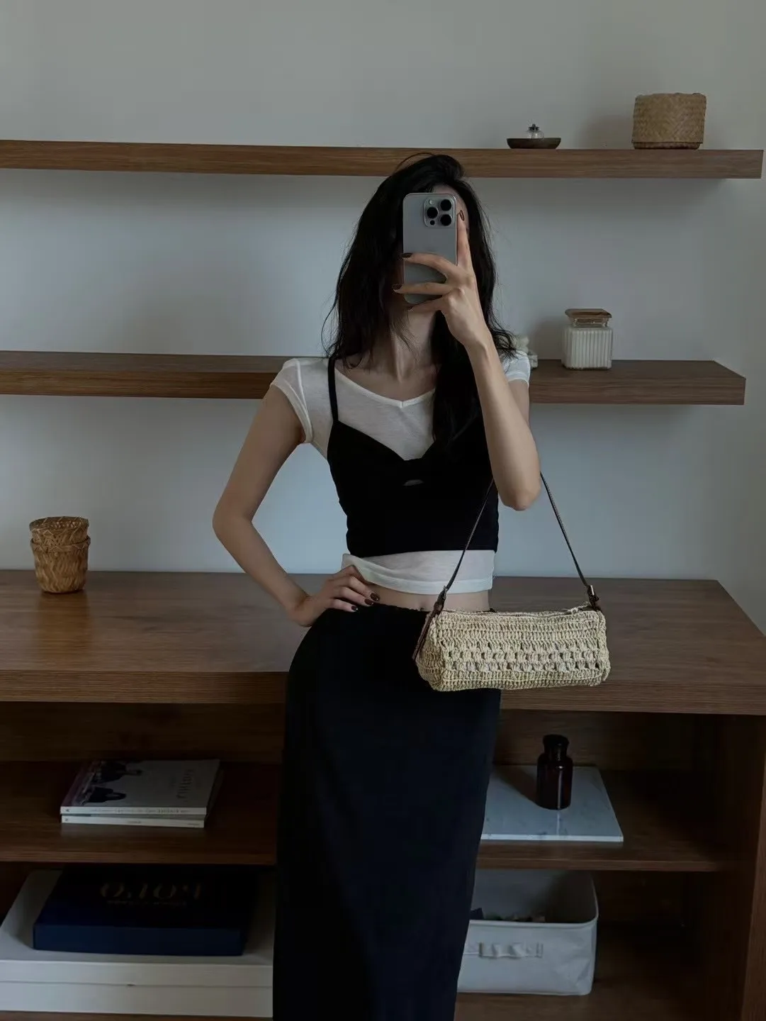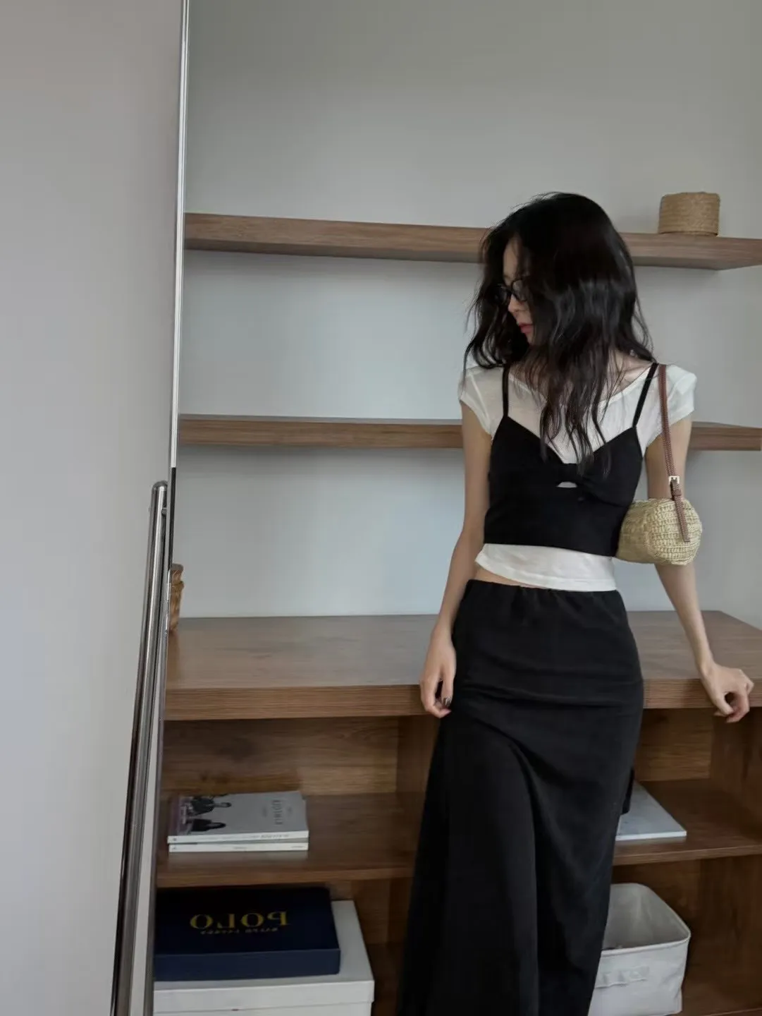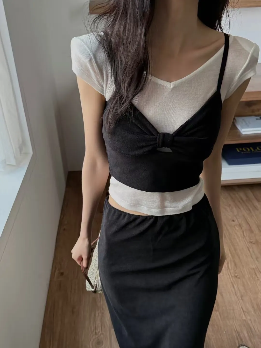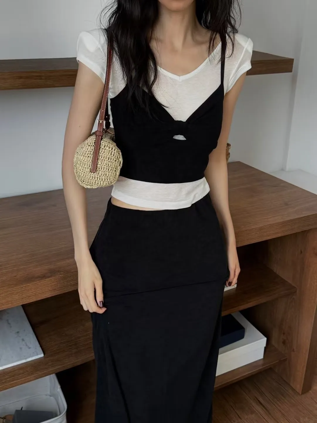 #兩件式套裝 #短版背心 #中長裙 #抓皺設計 #後開衩裙 #紅黑兩色 #度假穿搭 #日常時尚 #顯瘦套裝 #夏日穿搭靈感
