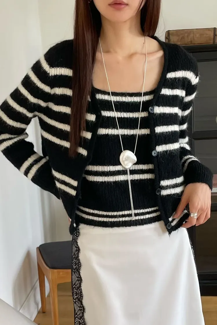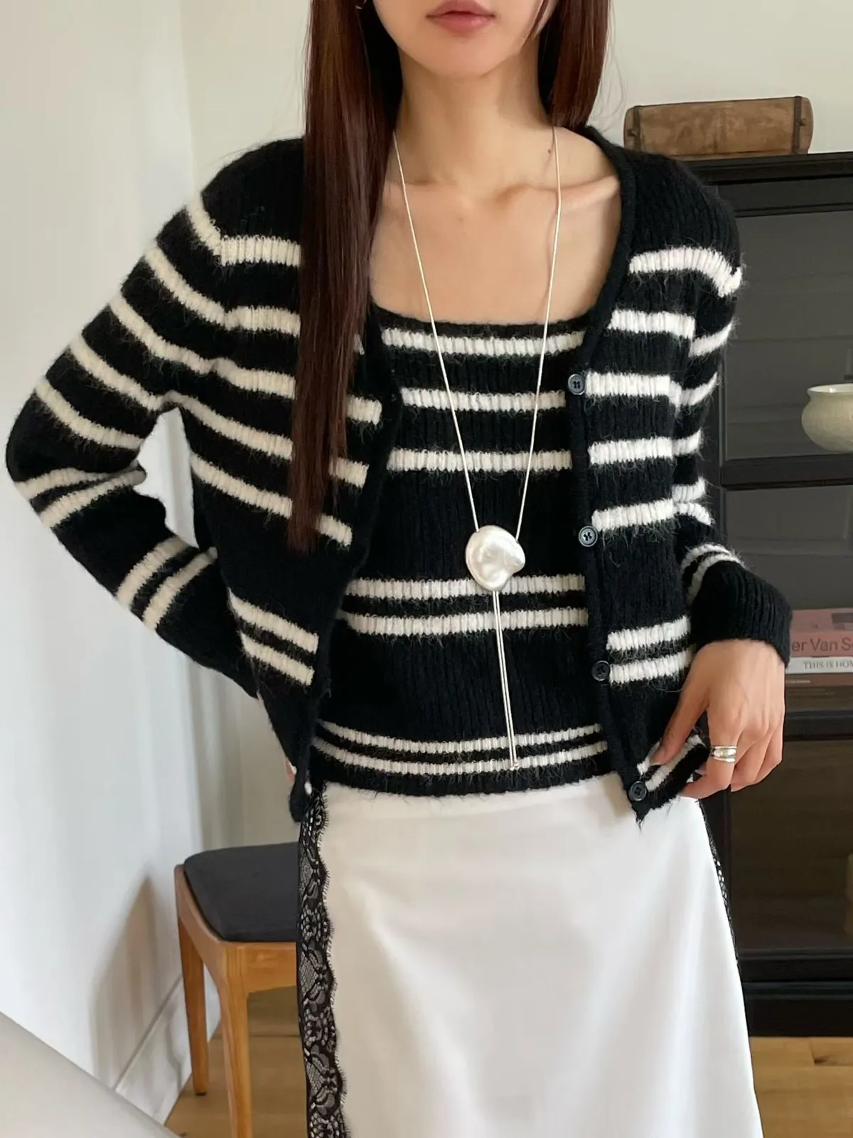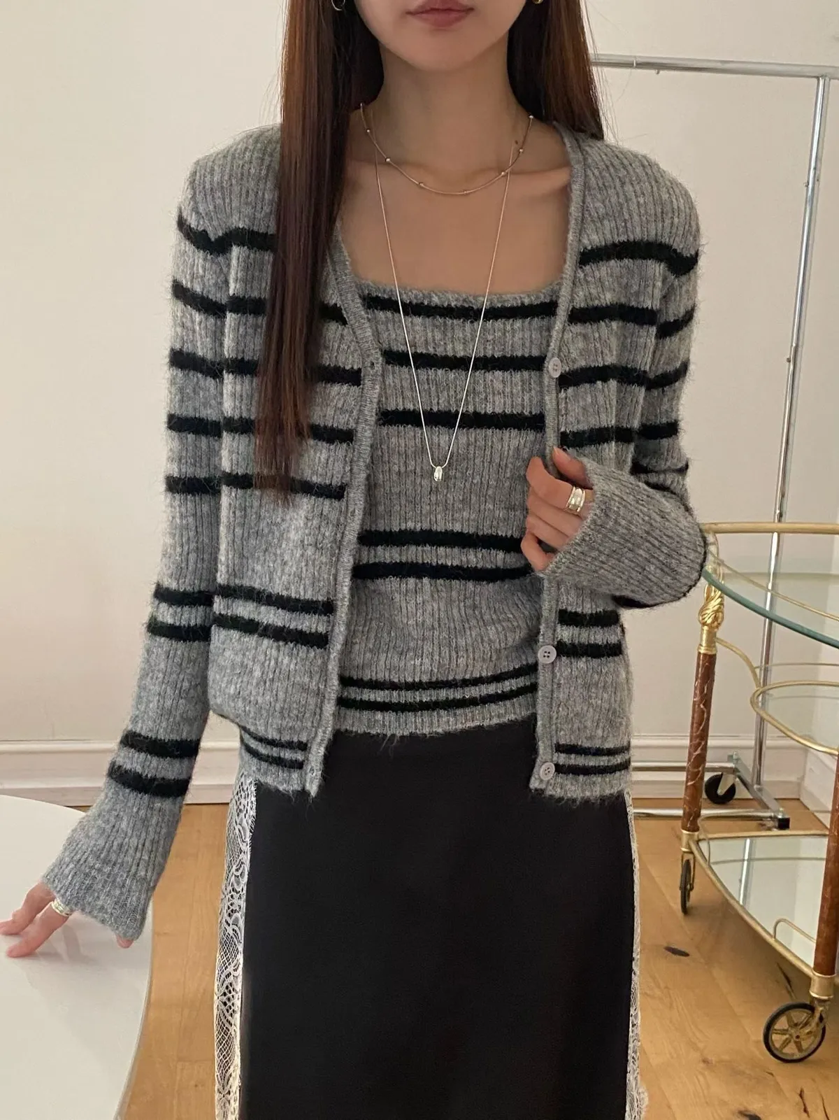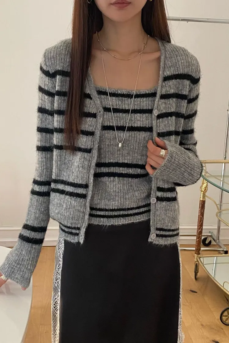 條紋毛絨感針織套裝(外套+背心兩件組)