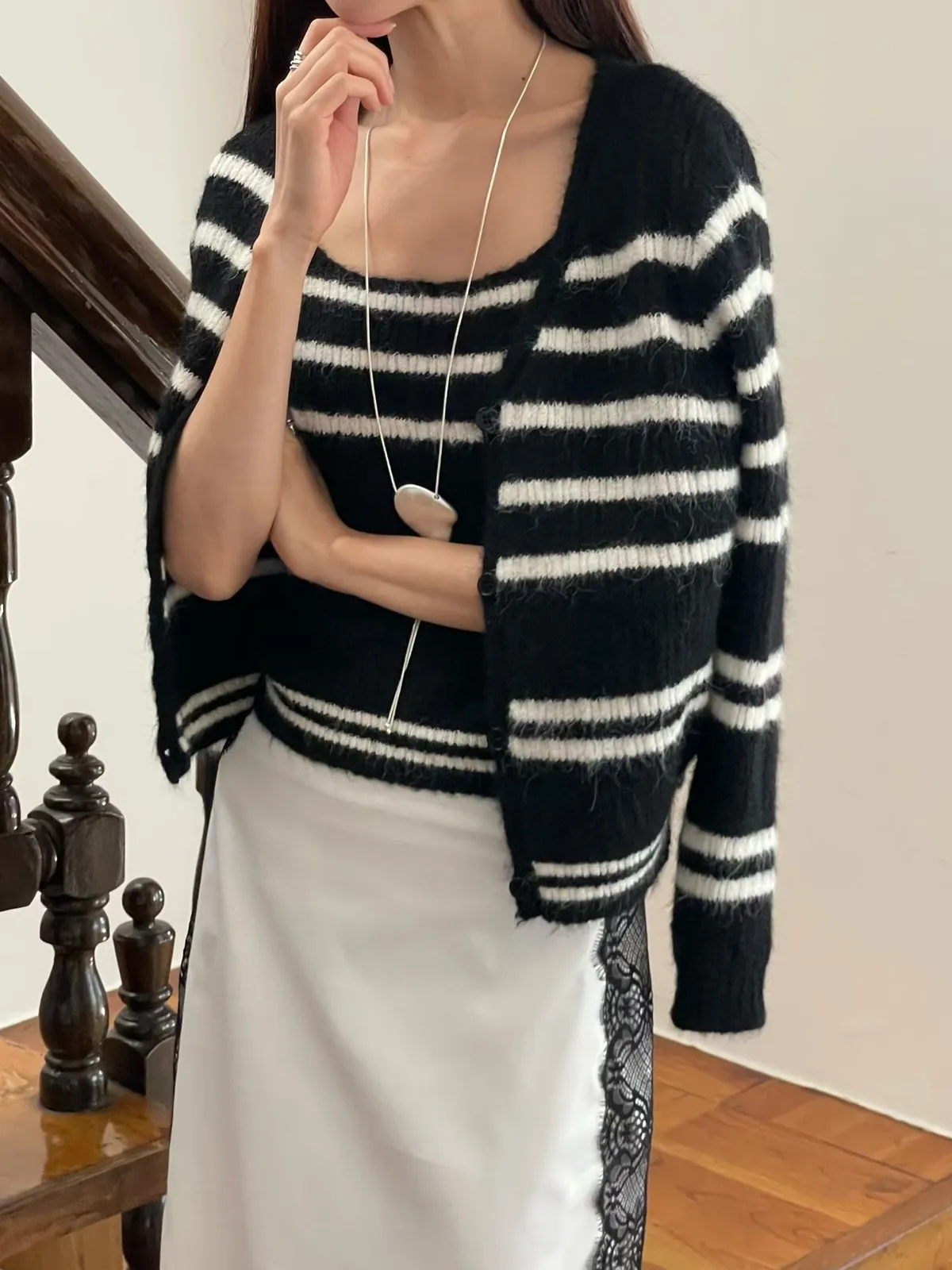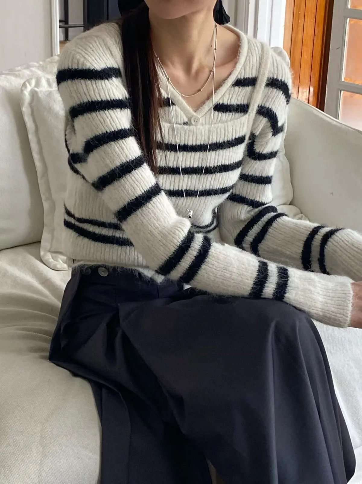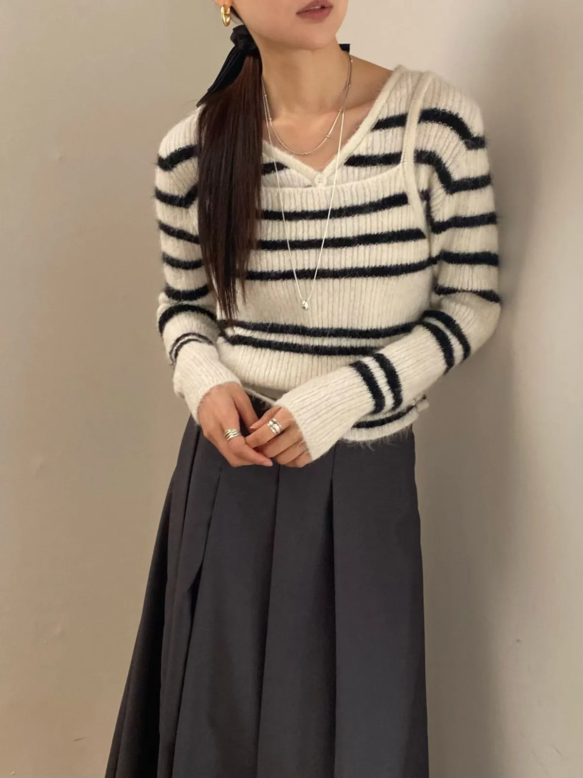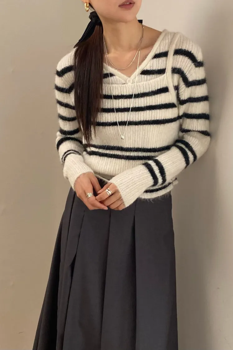 條紋毛絨感針織套裝(外套+背心兩件組)