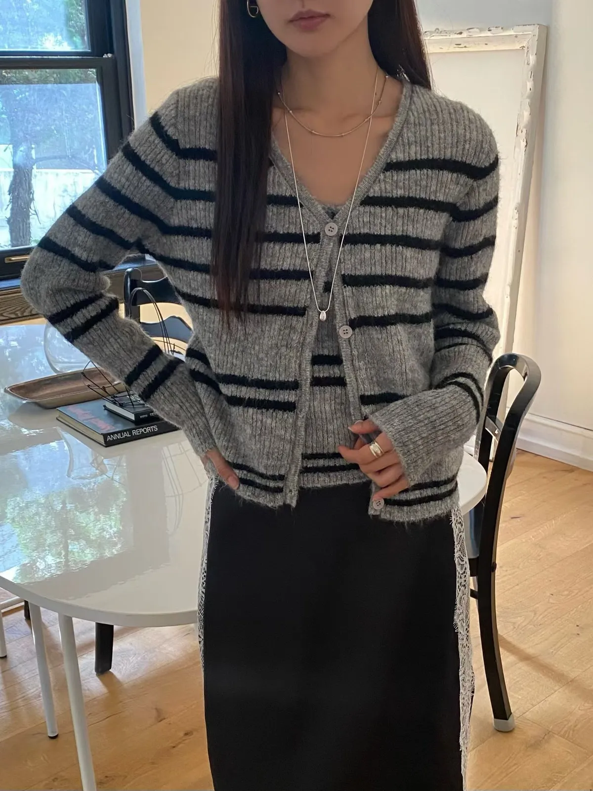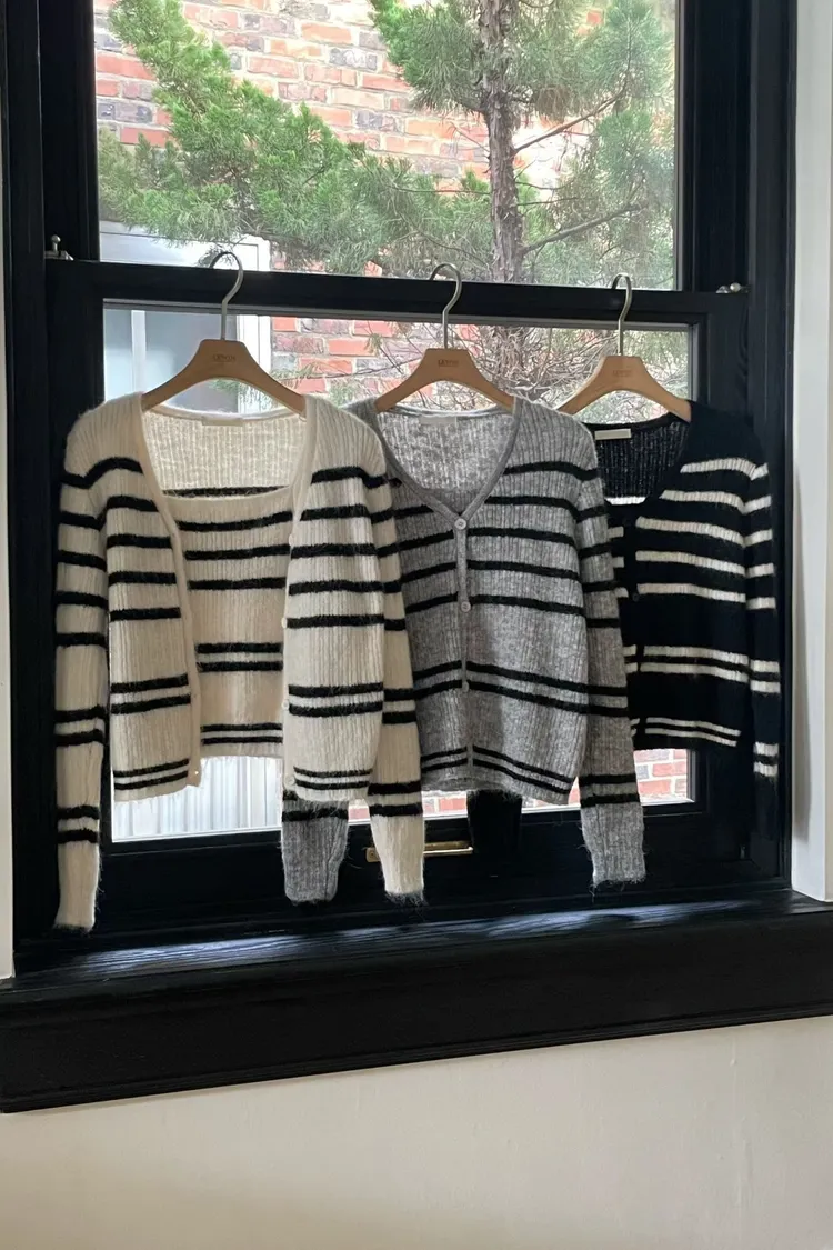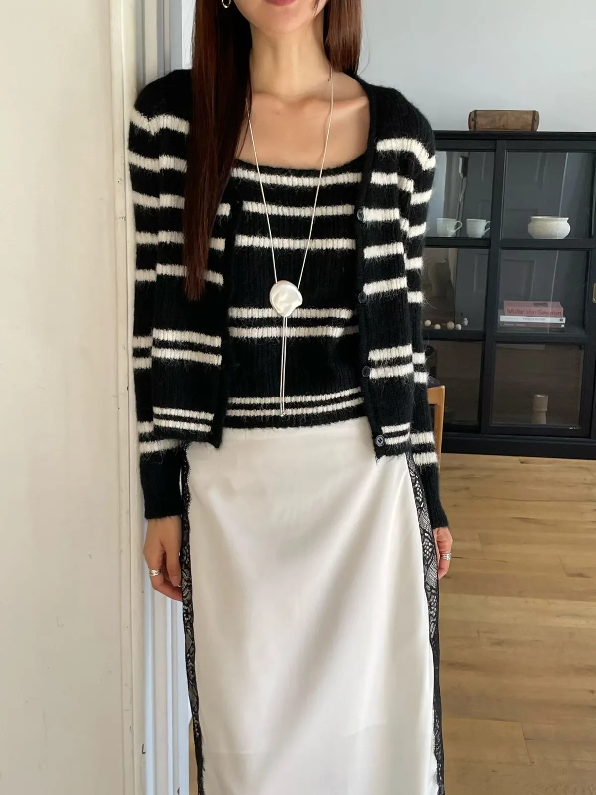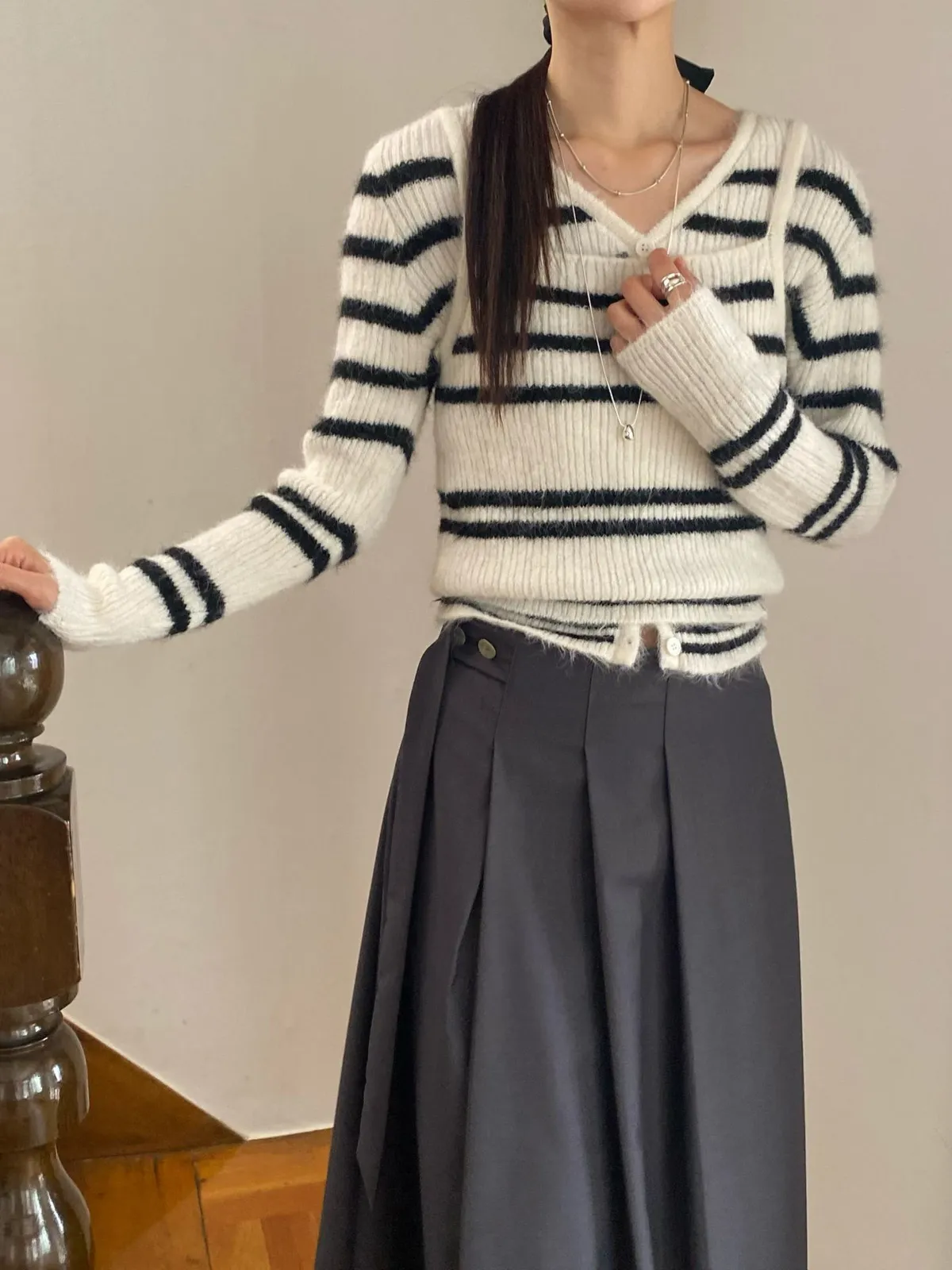 條紋毛絨感針織套裝(外套+背心兩件組)