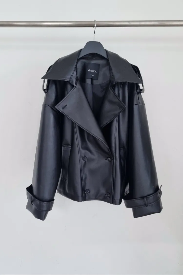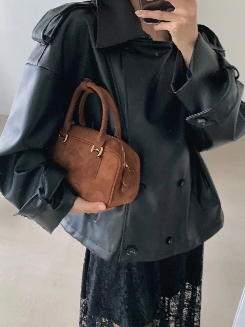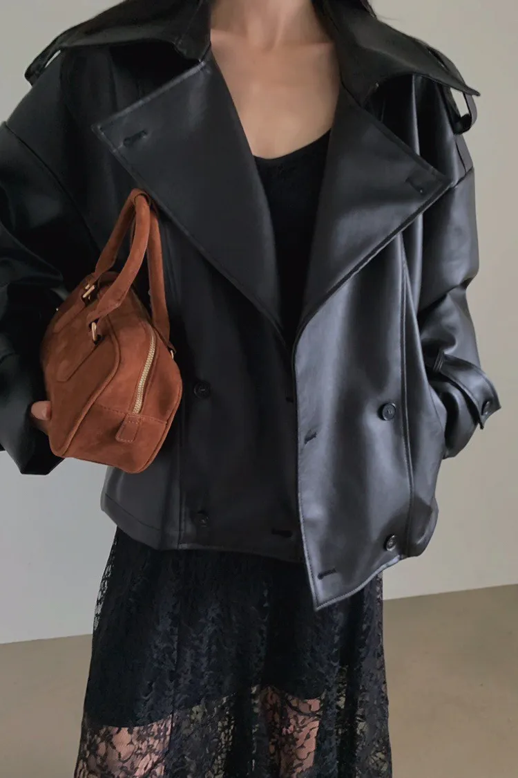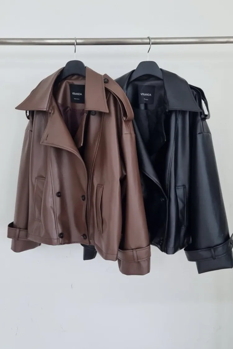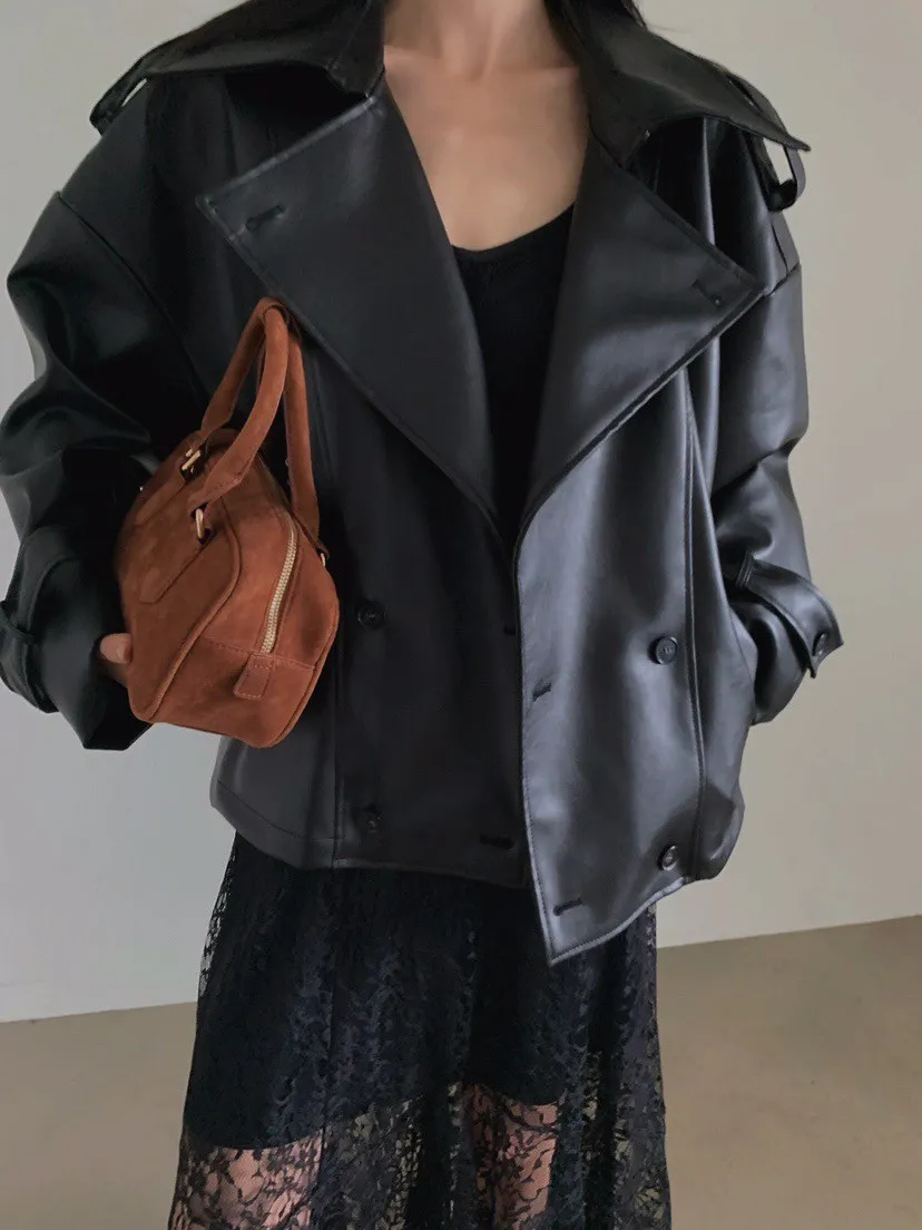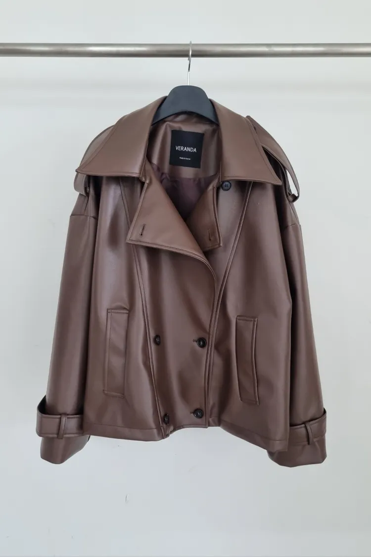 皮革感翻領短版風衣外套