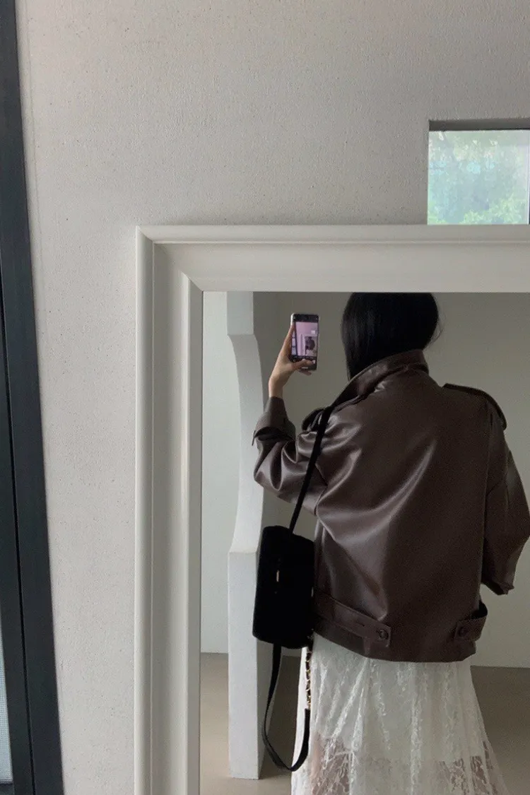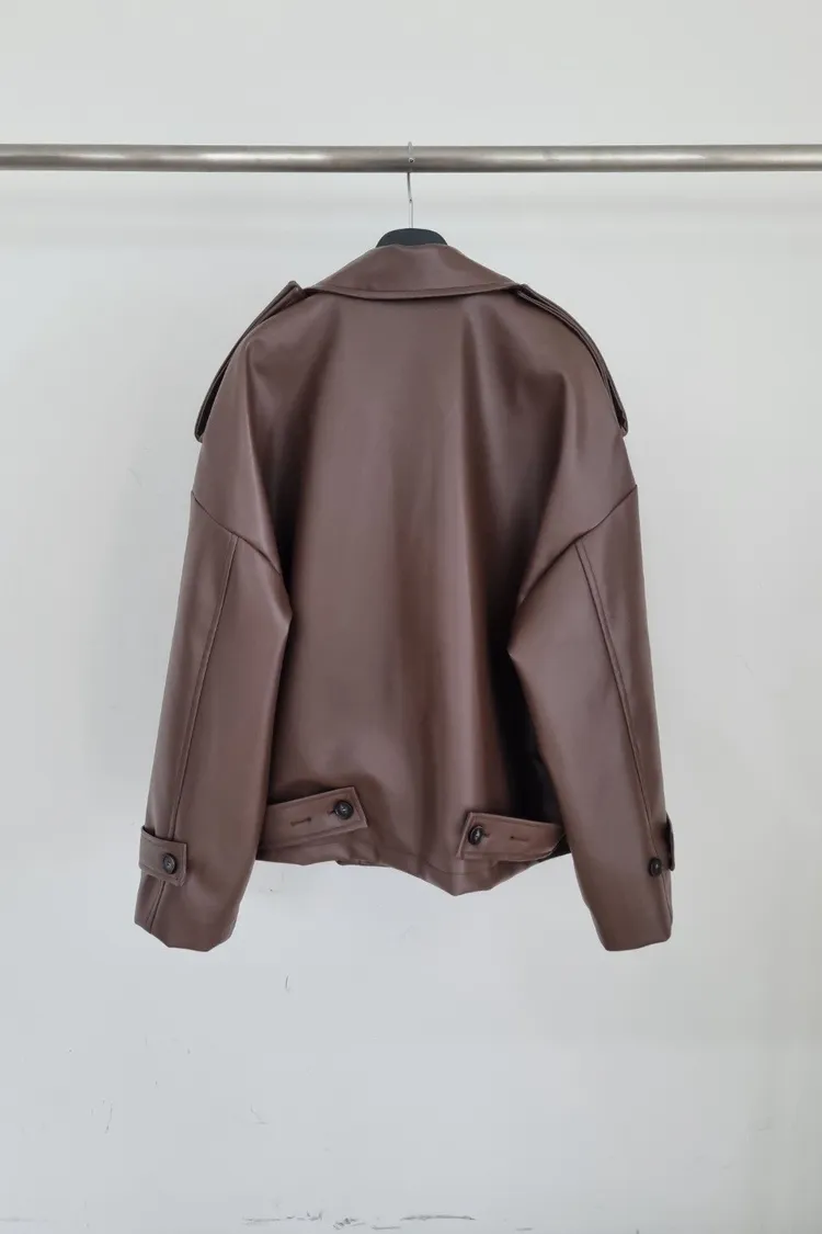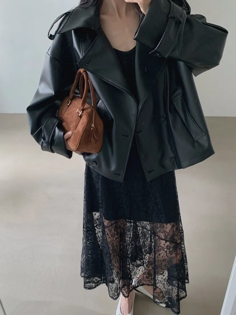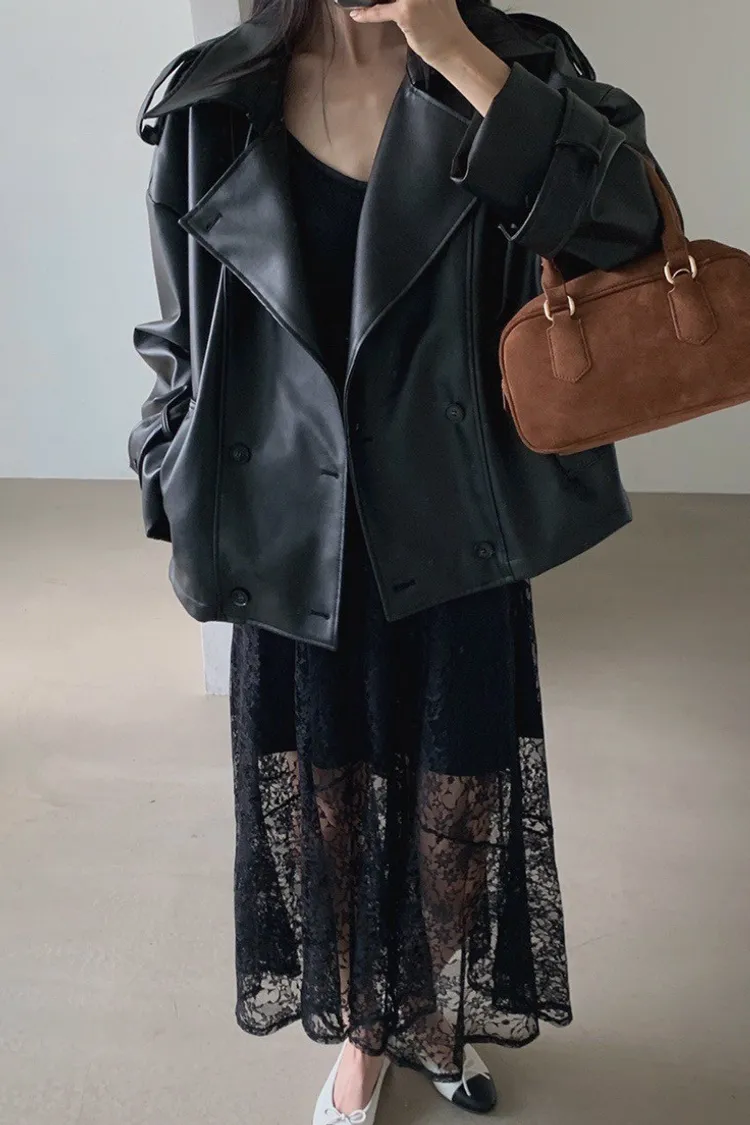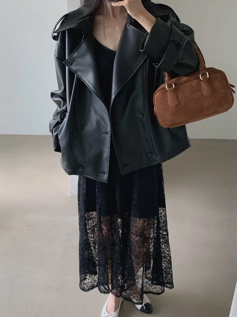 皮革感翻領短版風衣外套