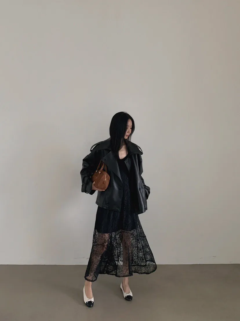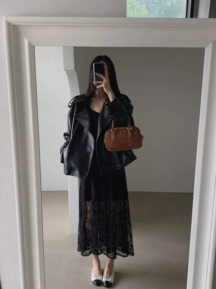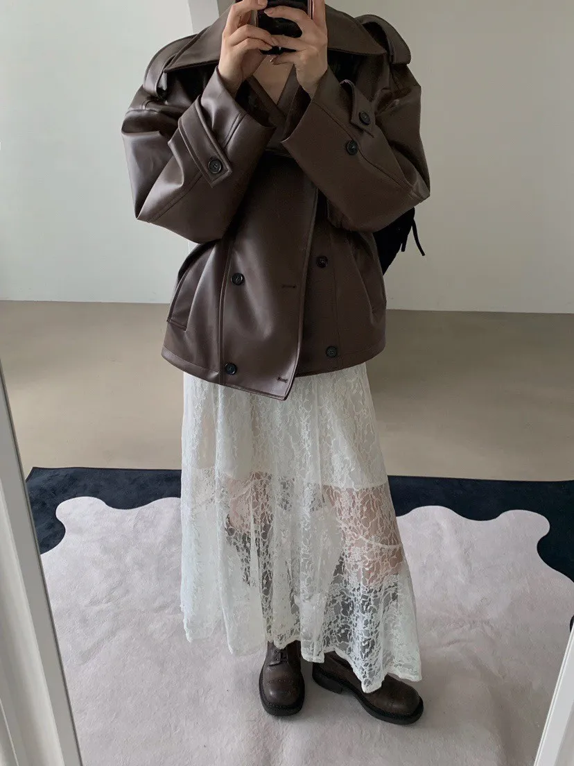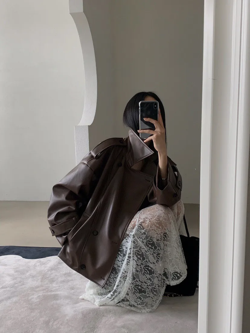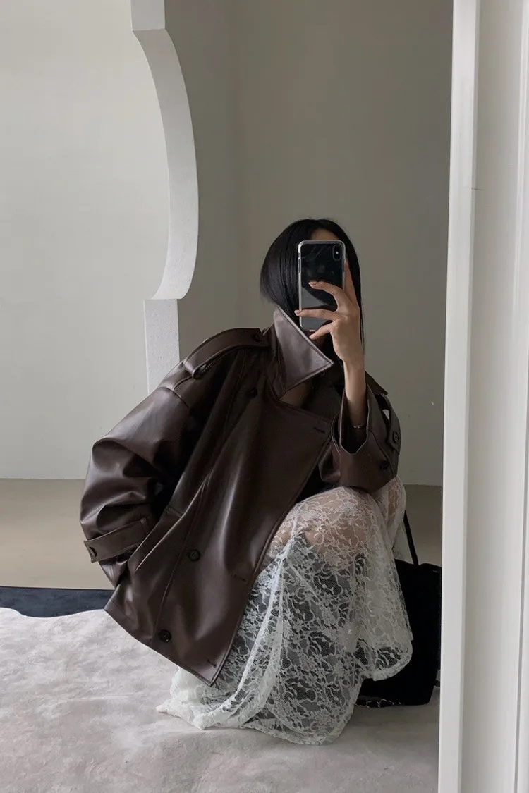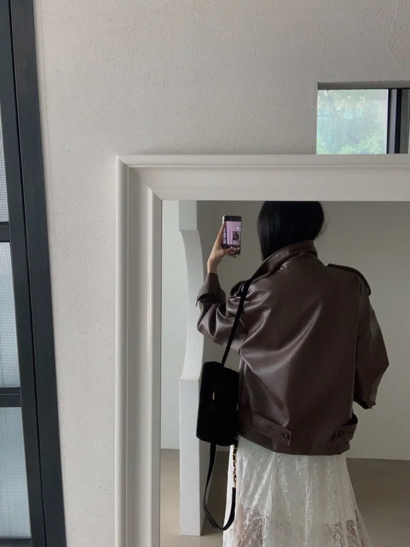 皮革感翻領短版風衣外套