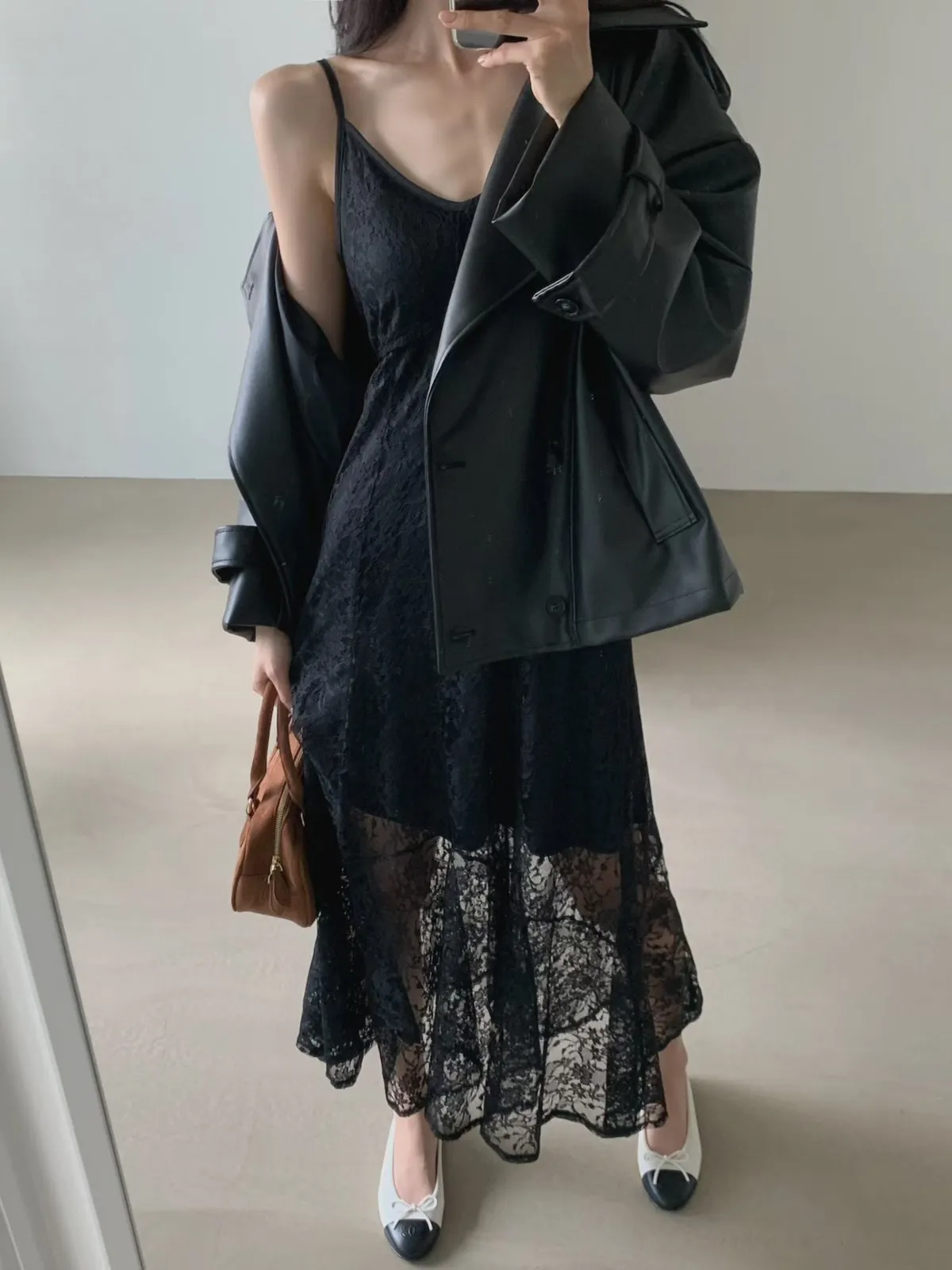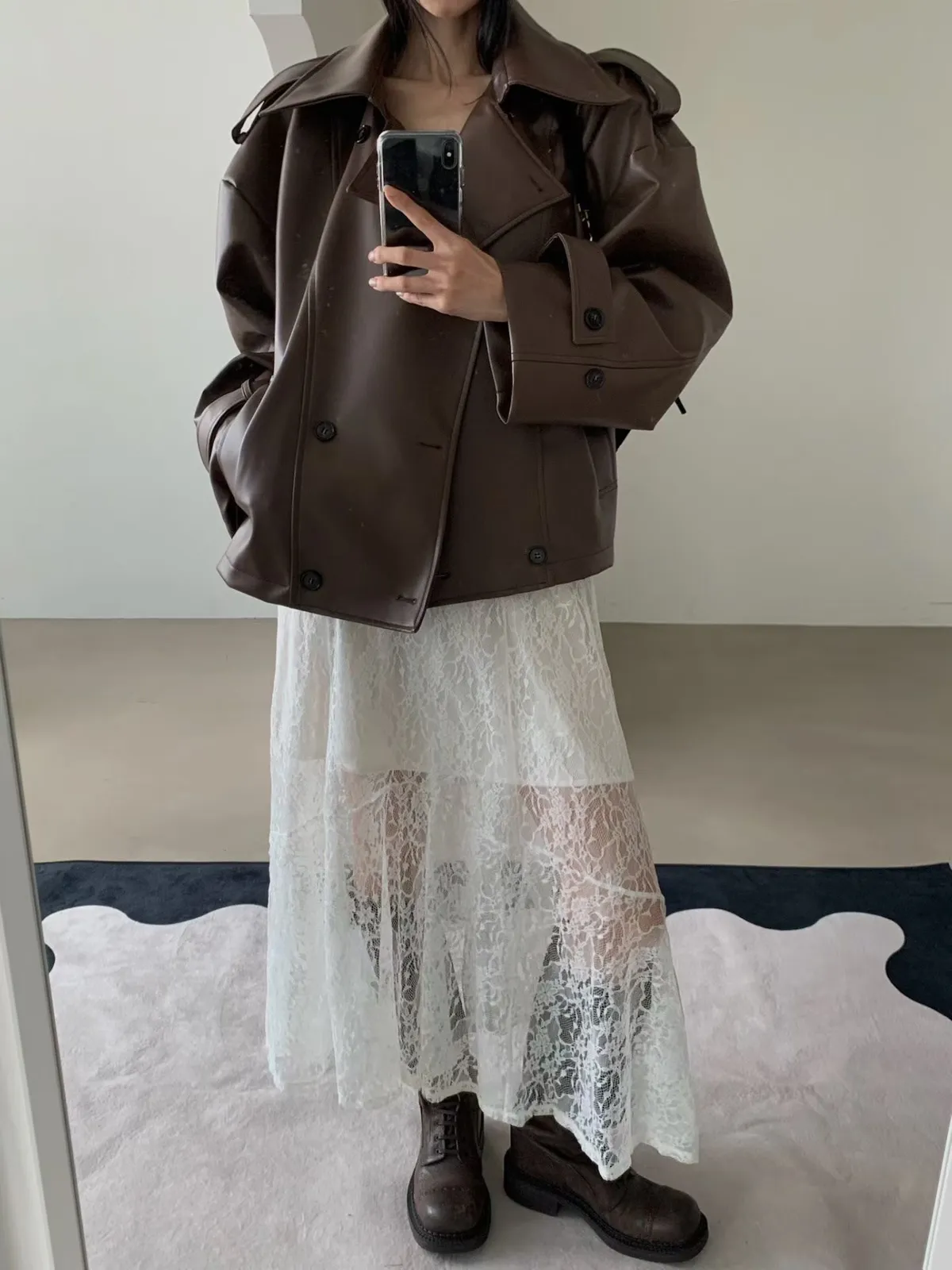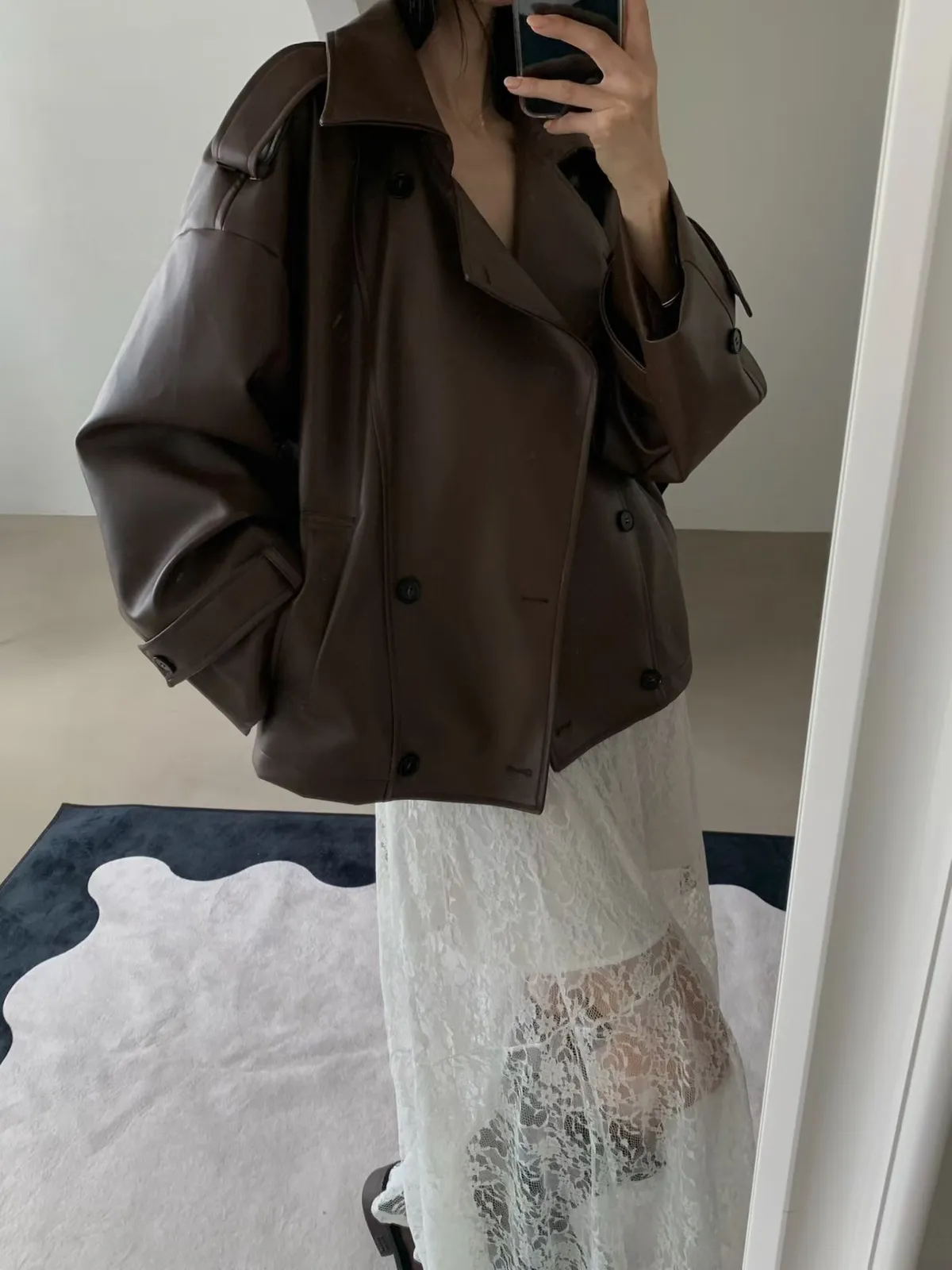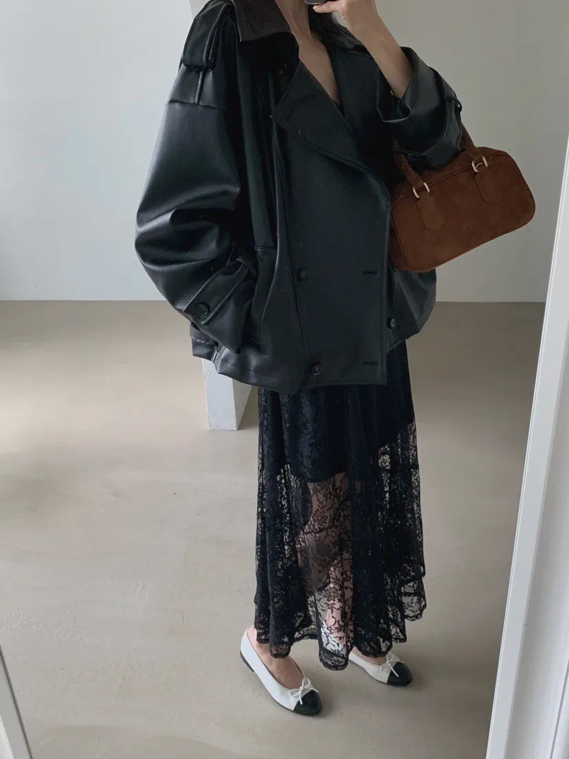 皮革感翻領短版風衣外套