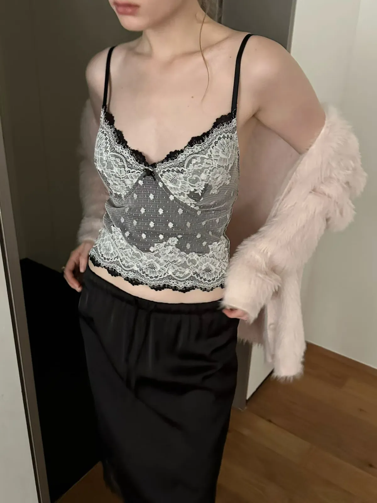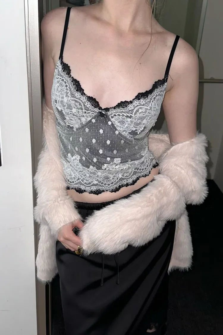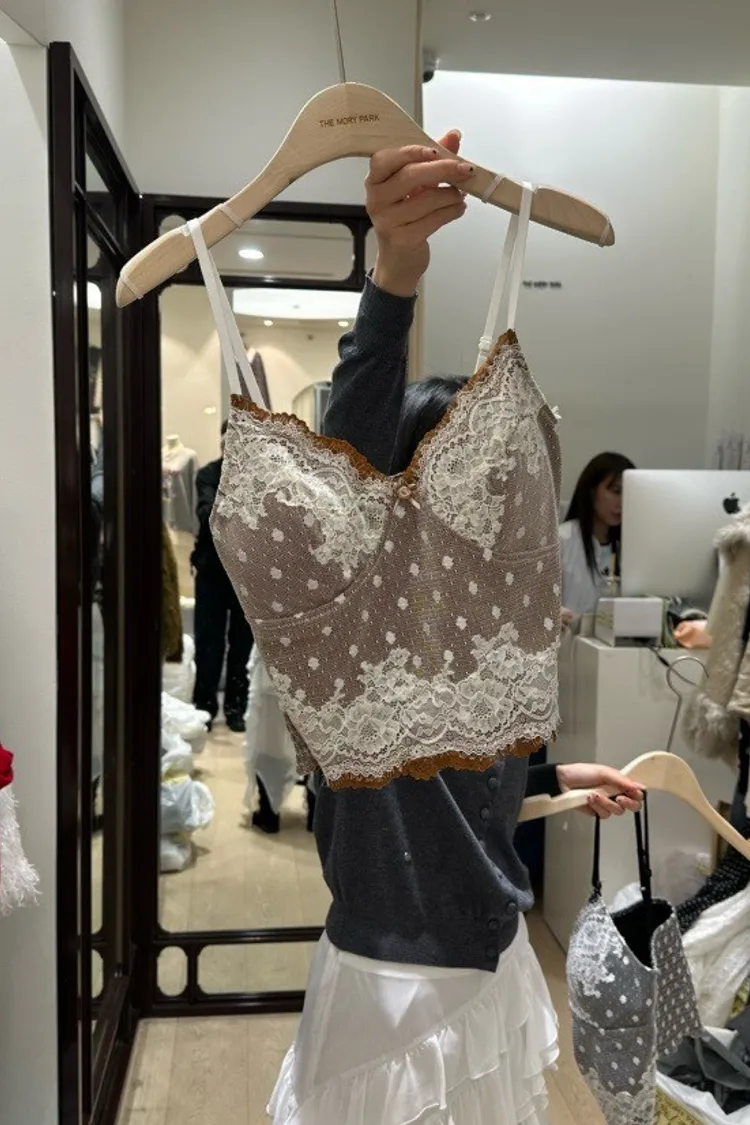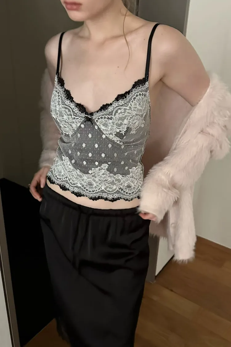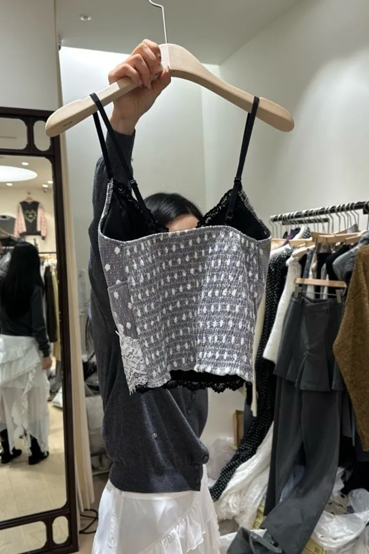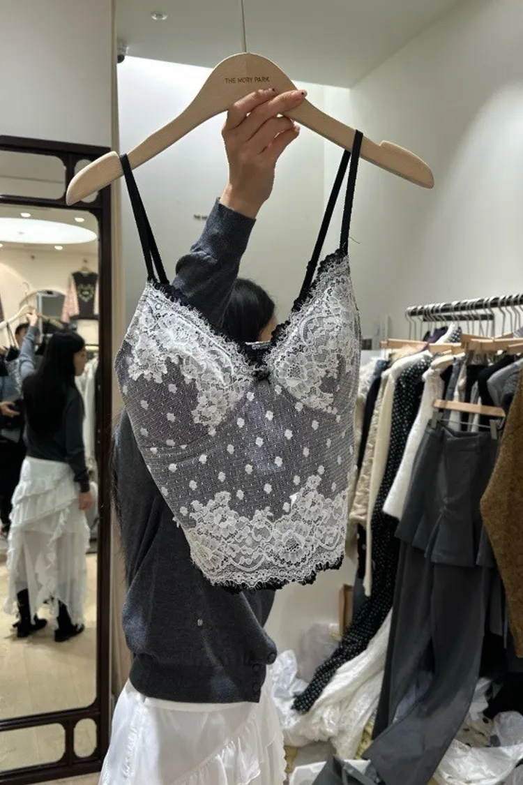 法式性感波點蕾絲拼接細肩小可愛