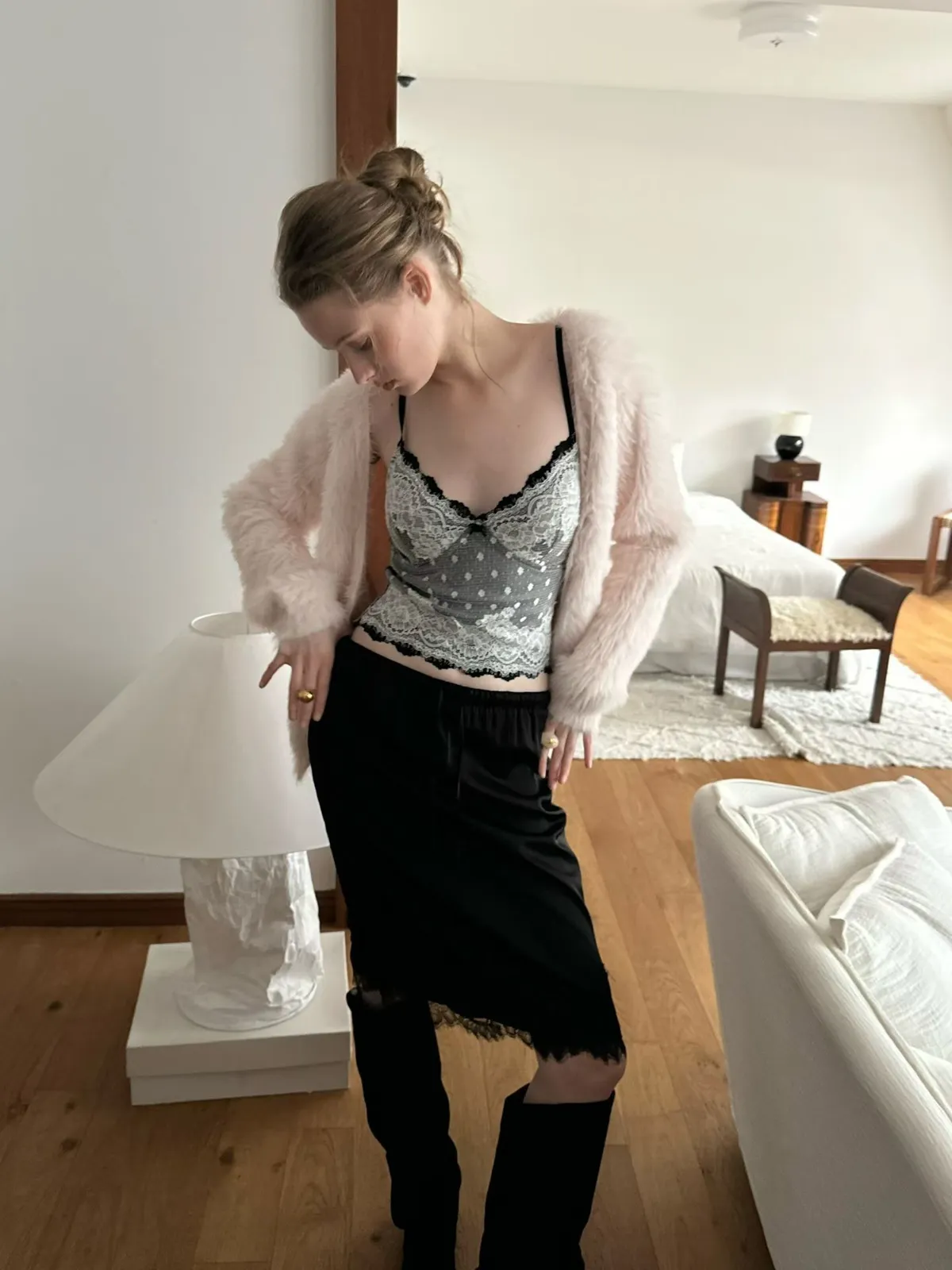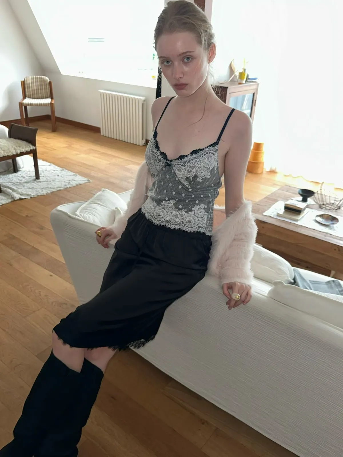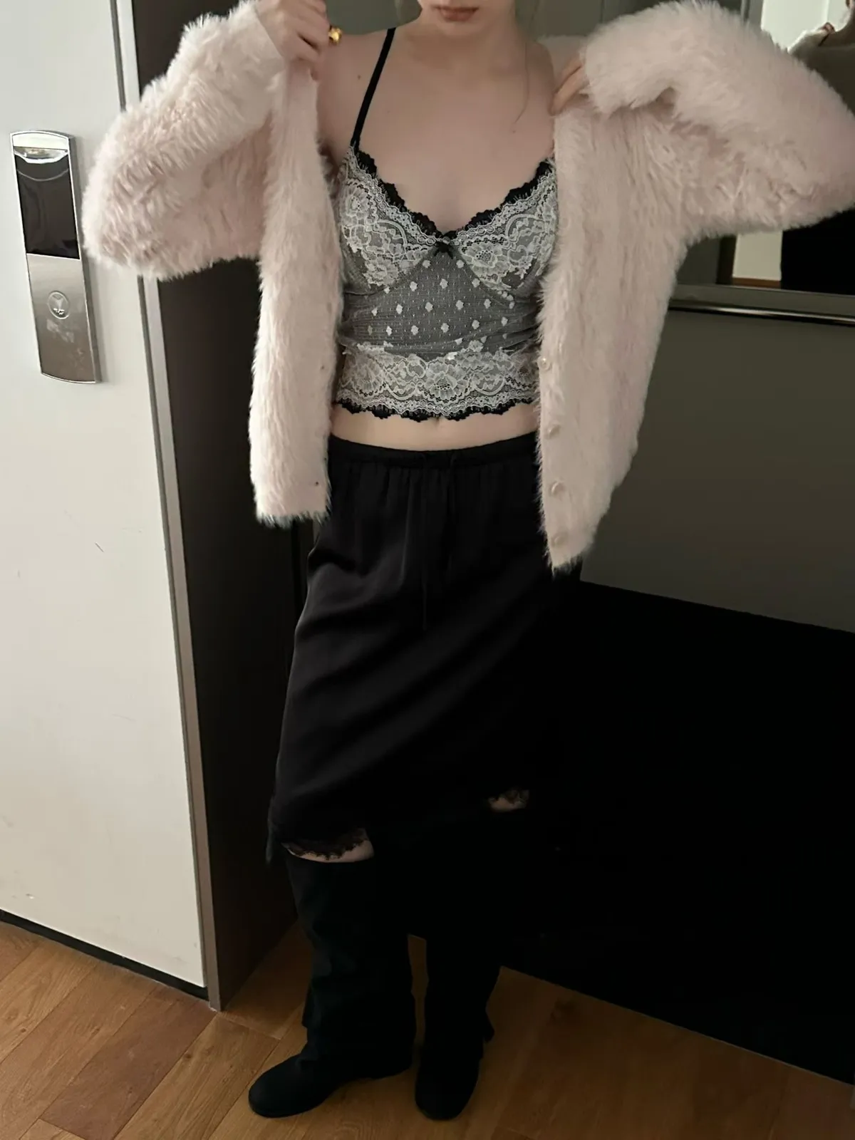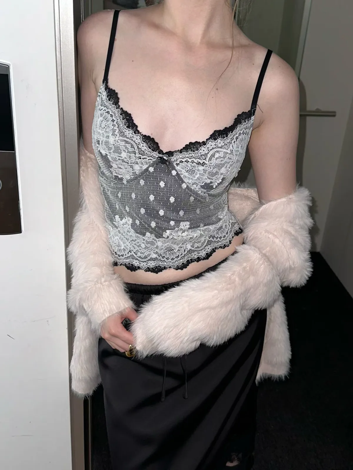 法式性感波點蕾絲拼接細肩小可愛