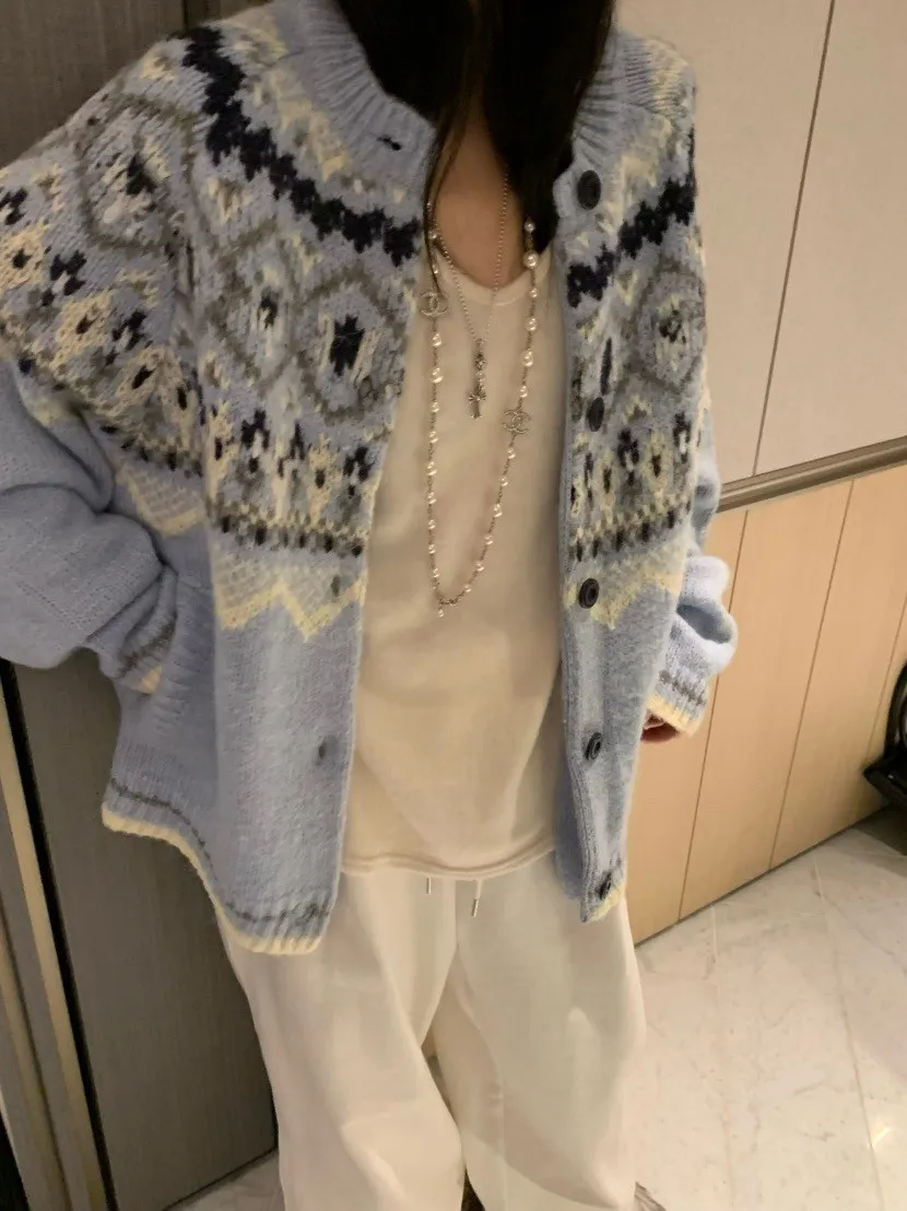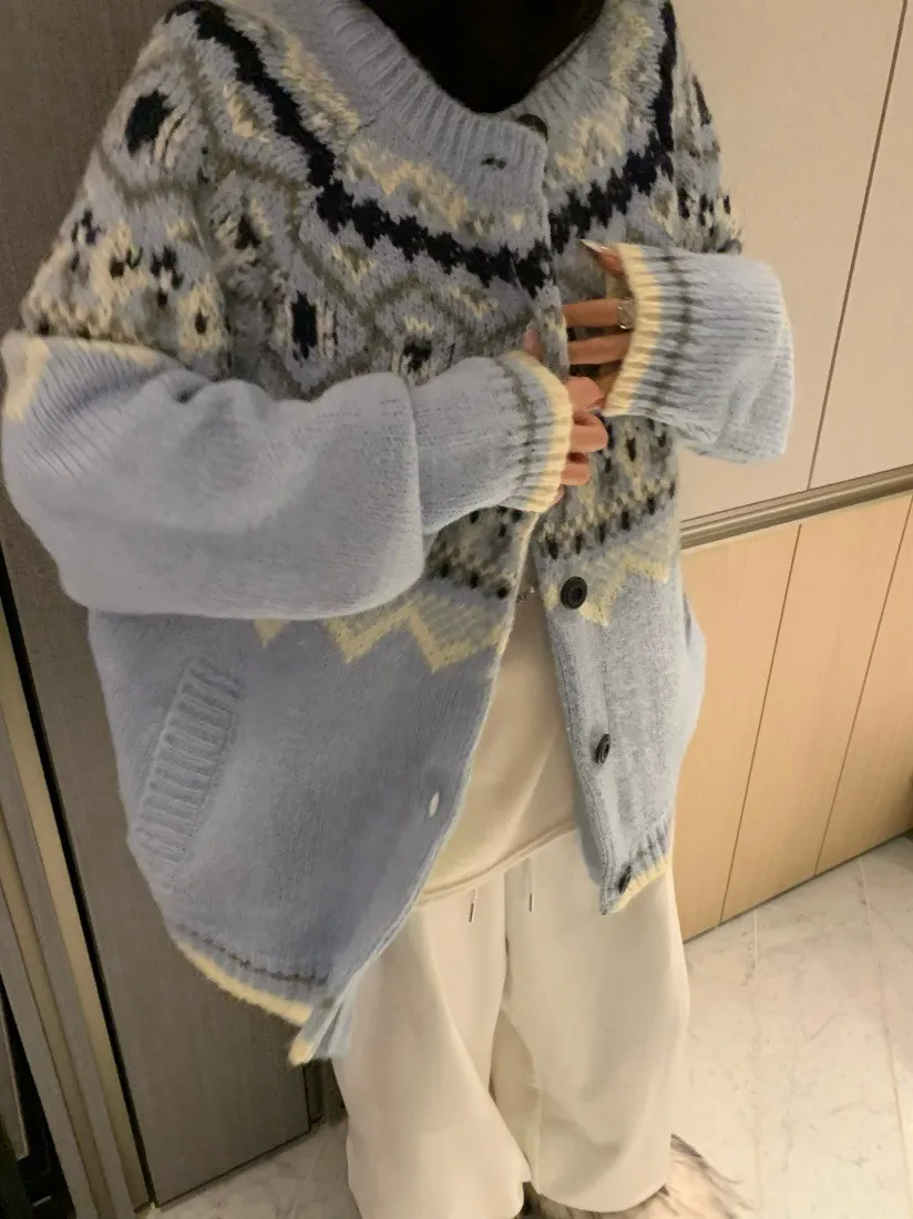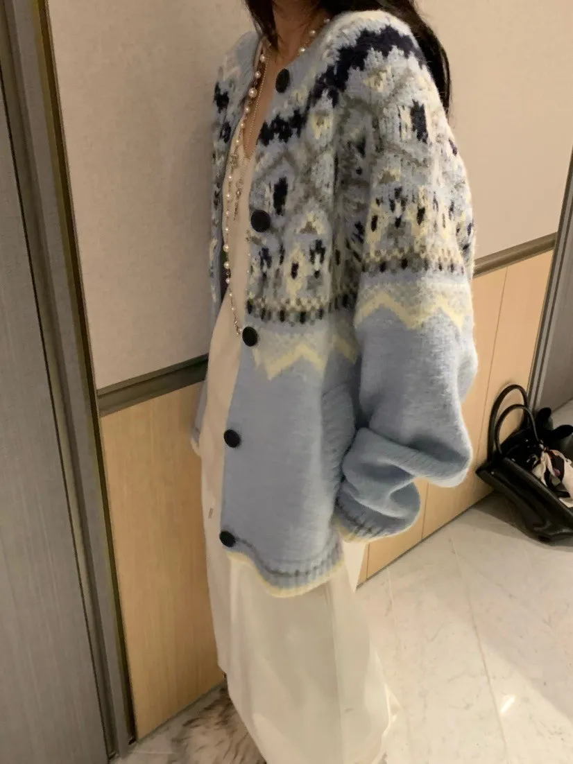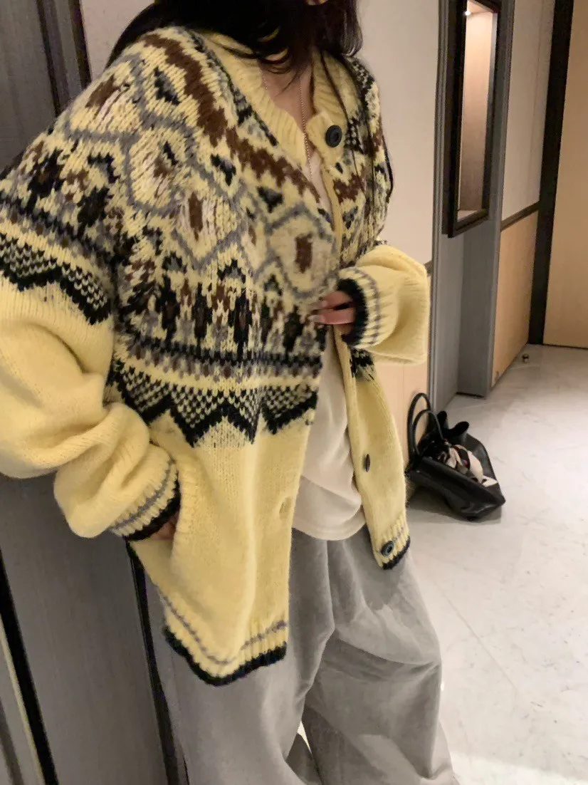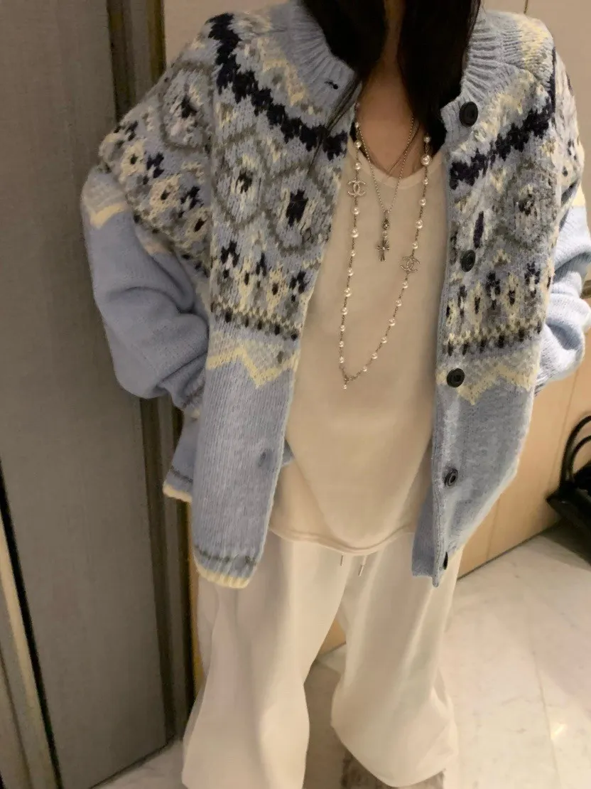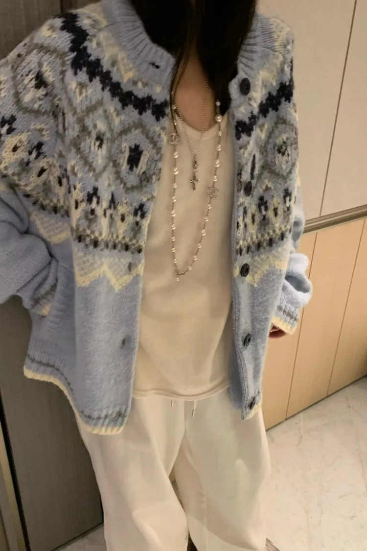 北歐風幾何織紋厚針織開襟外套