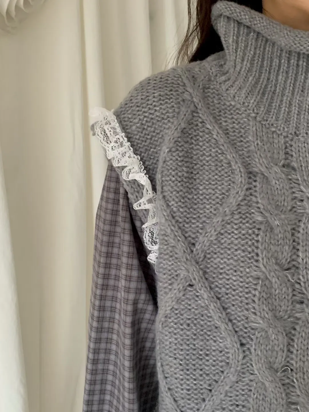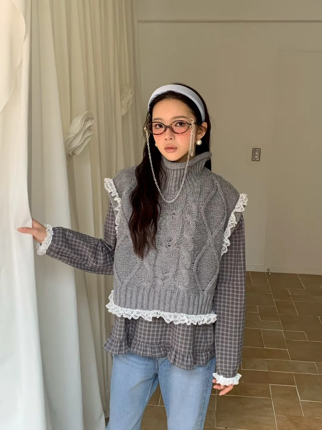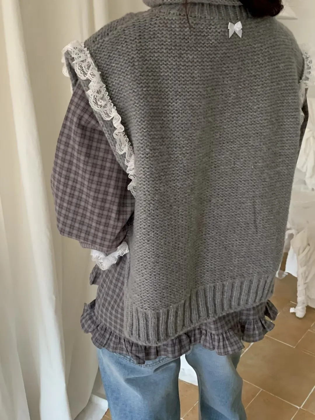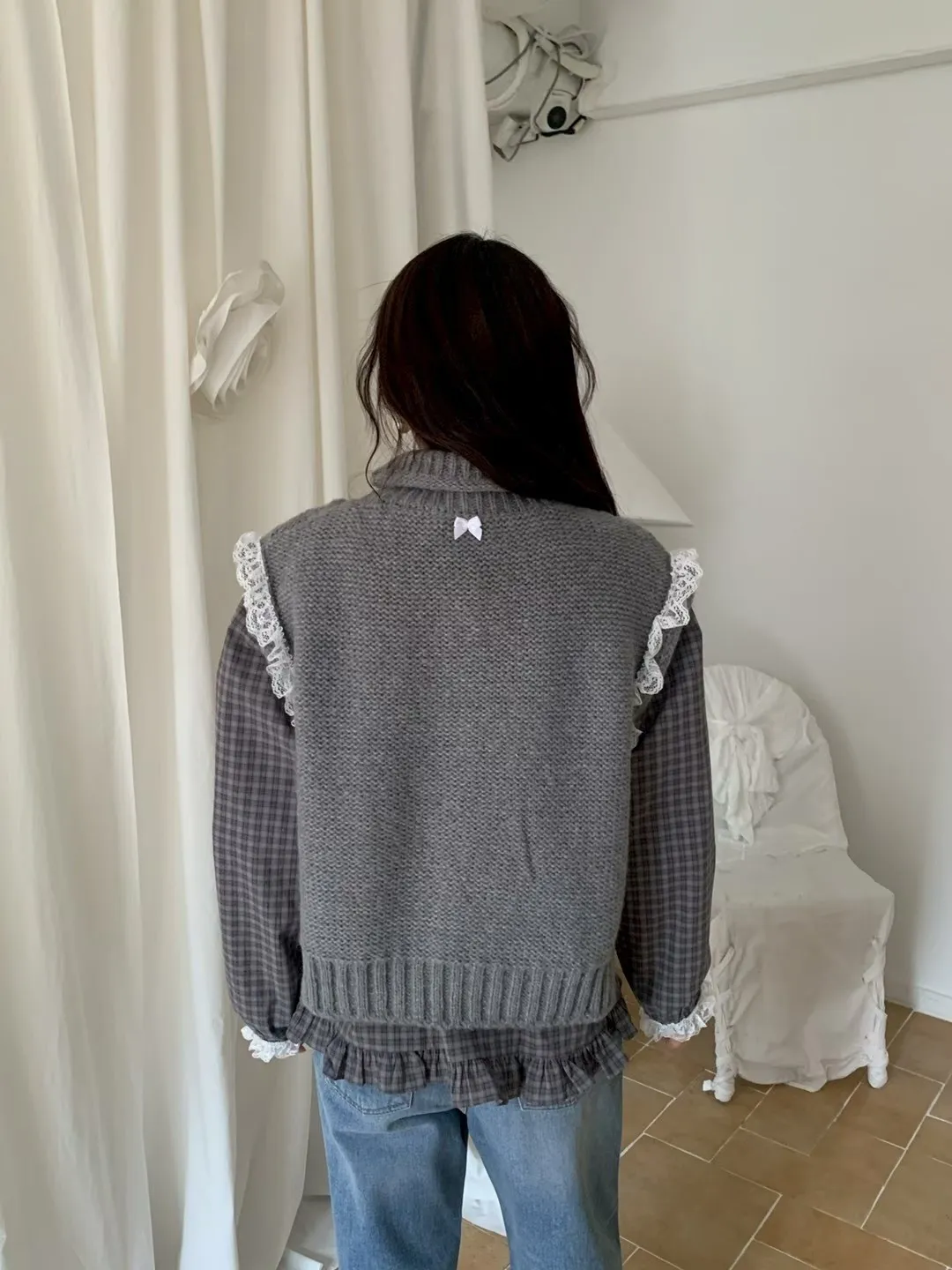 蝴蝶結綁帶拼接蕾絲荷葉邊襯衫上衣
