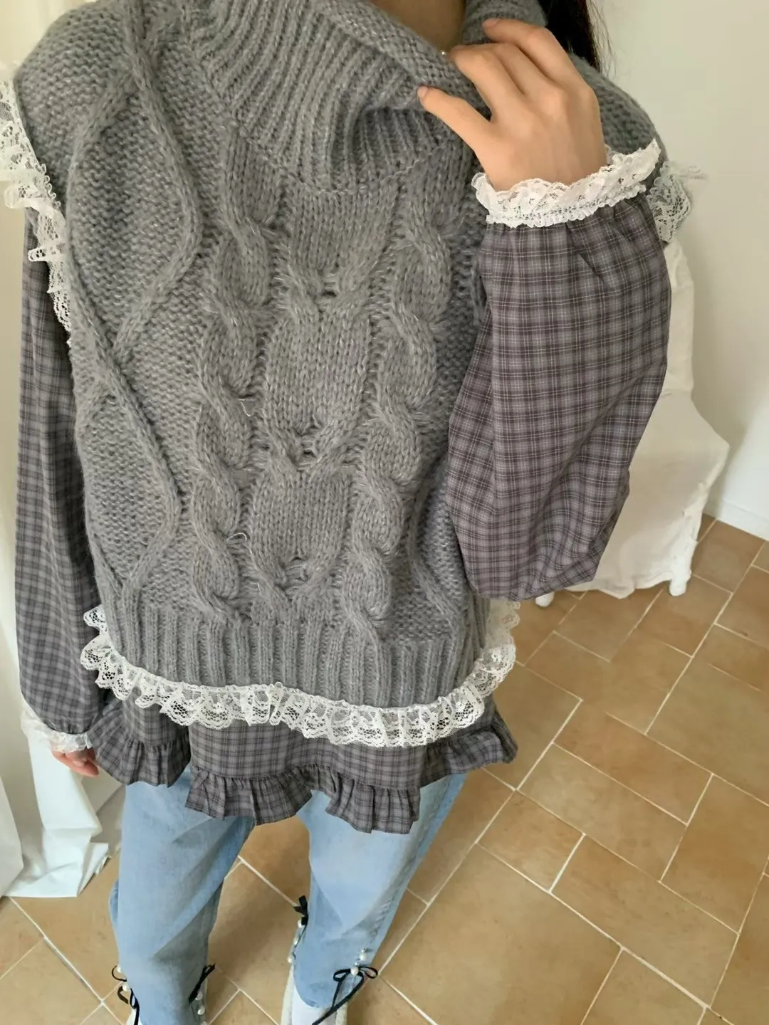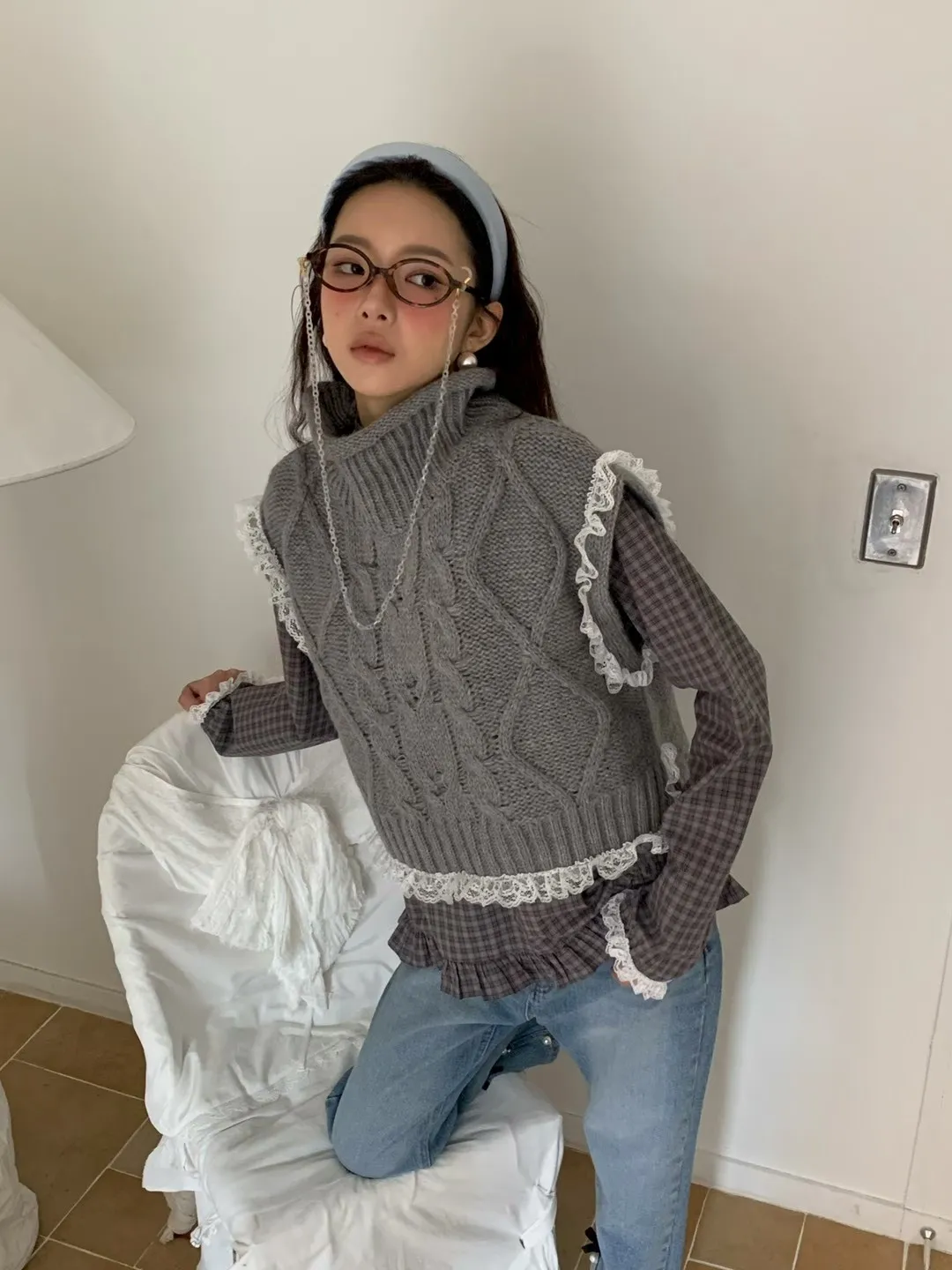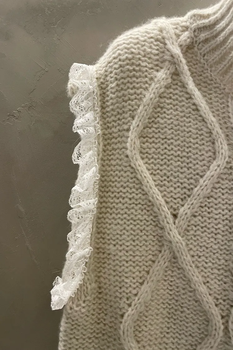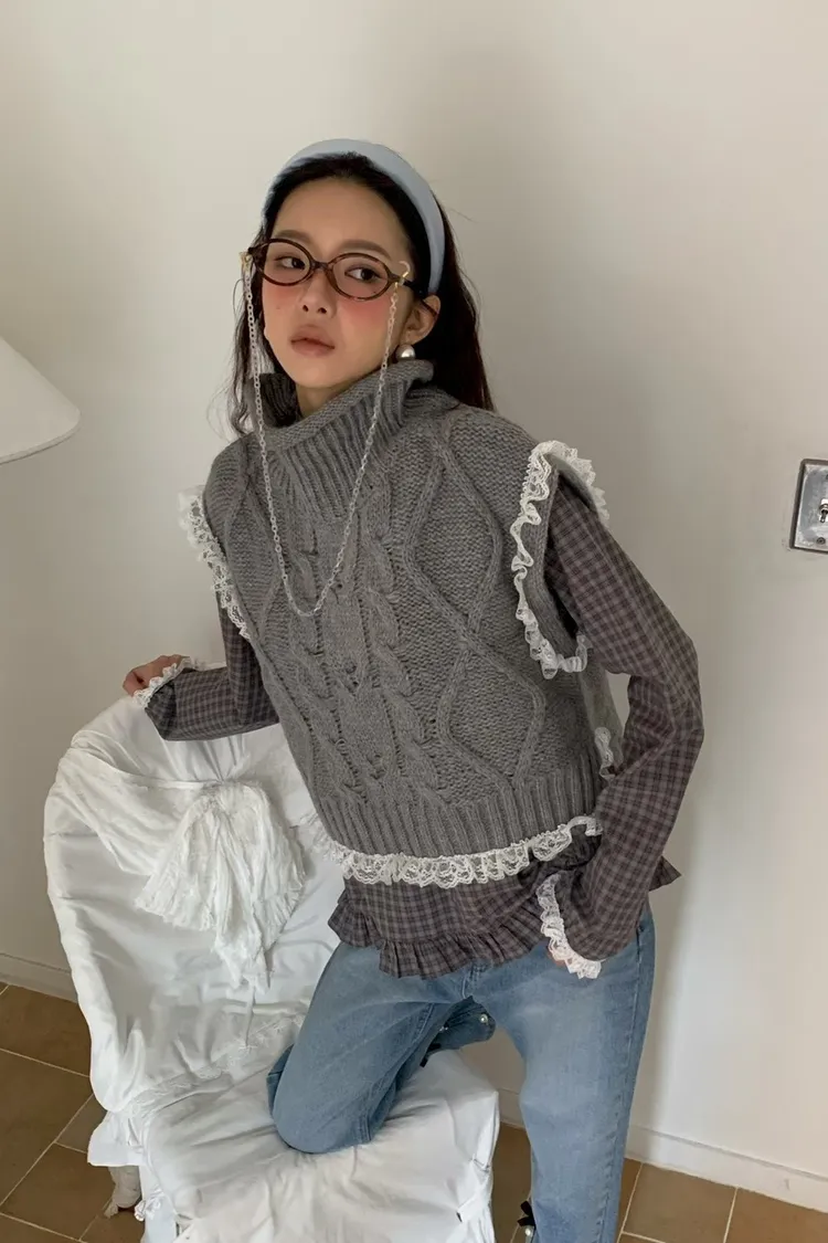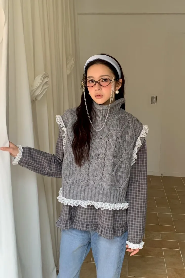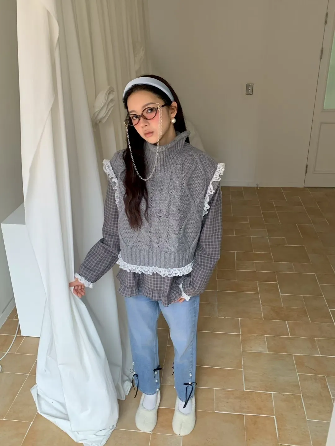 蝴蝶結綁帶拼接蕾絲荷葉邊襯衫上衣