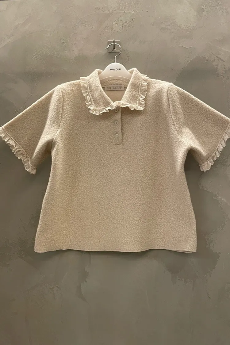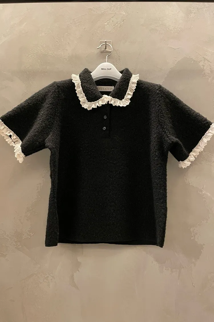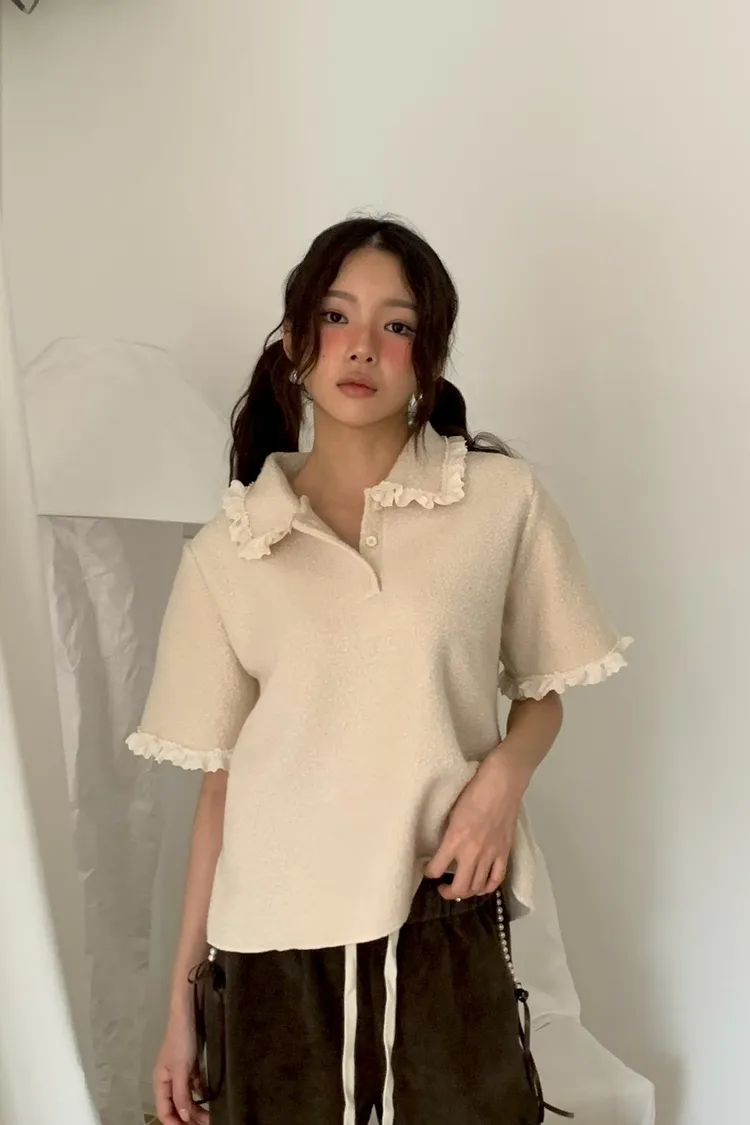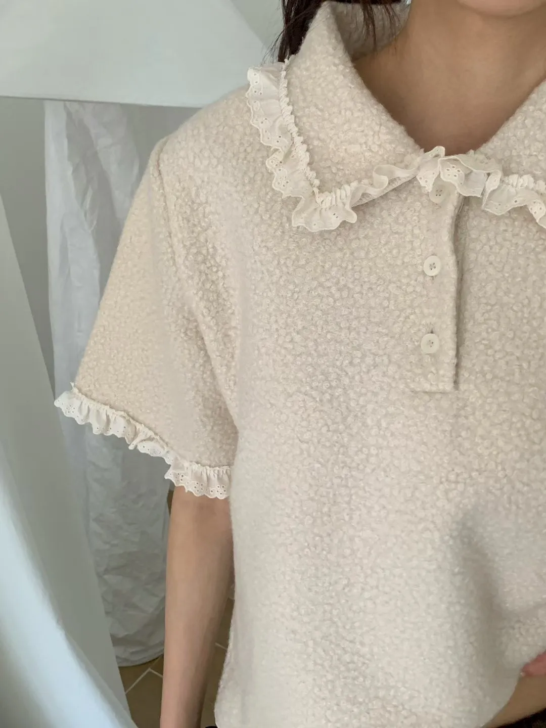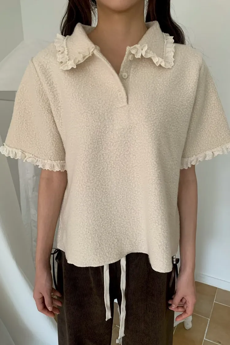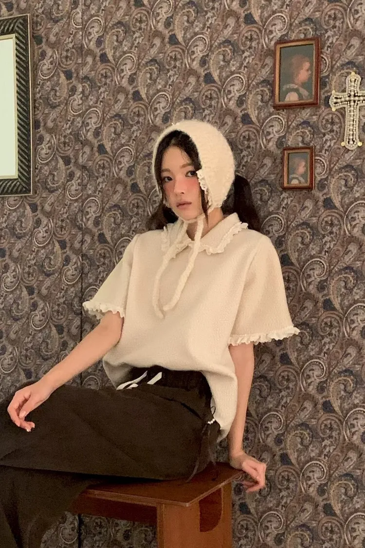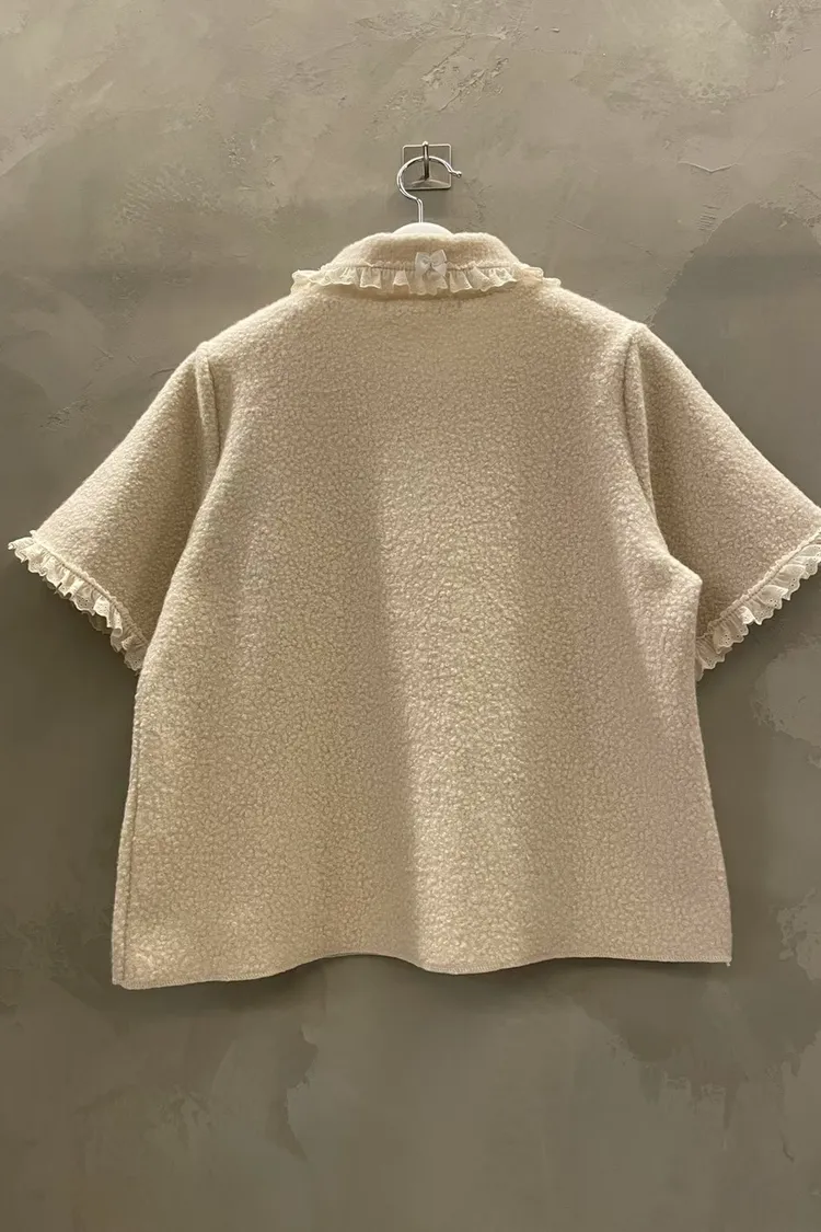 蕾絲荷葉娃娃領毛呢短袖上衣