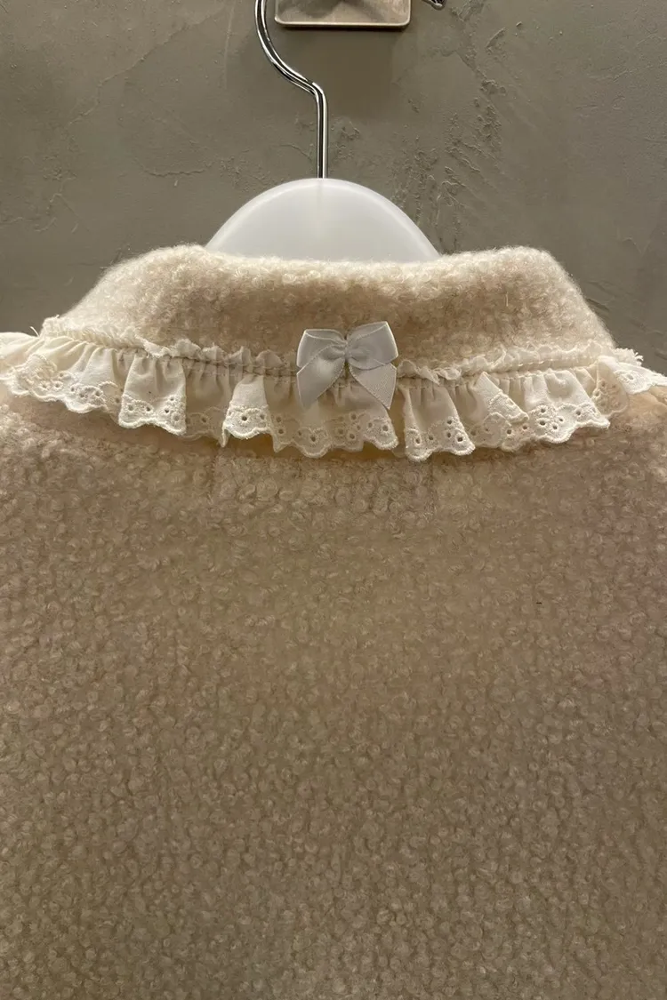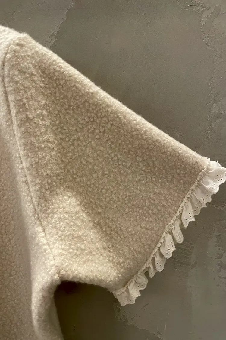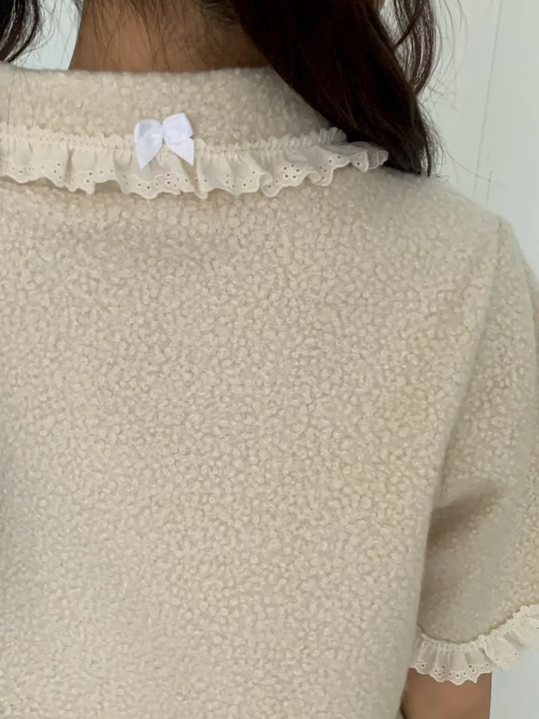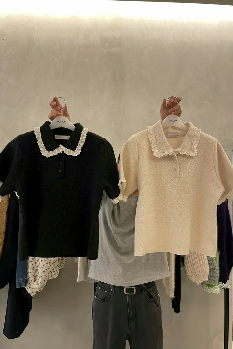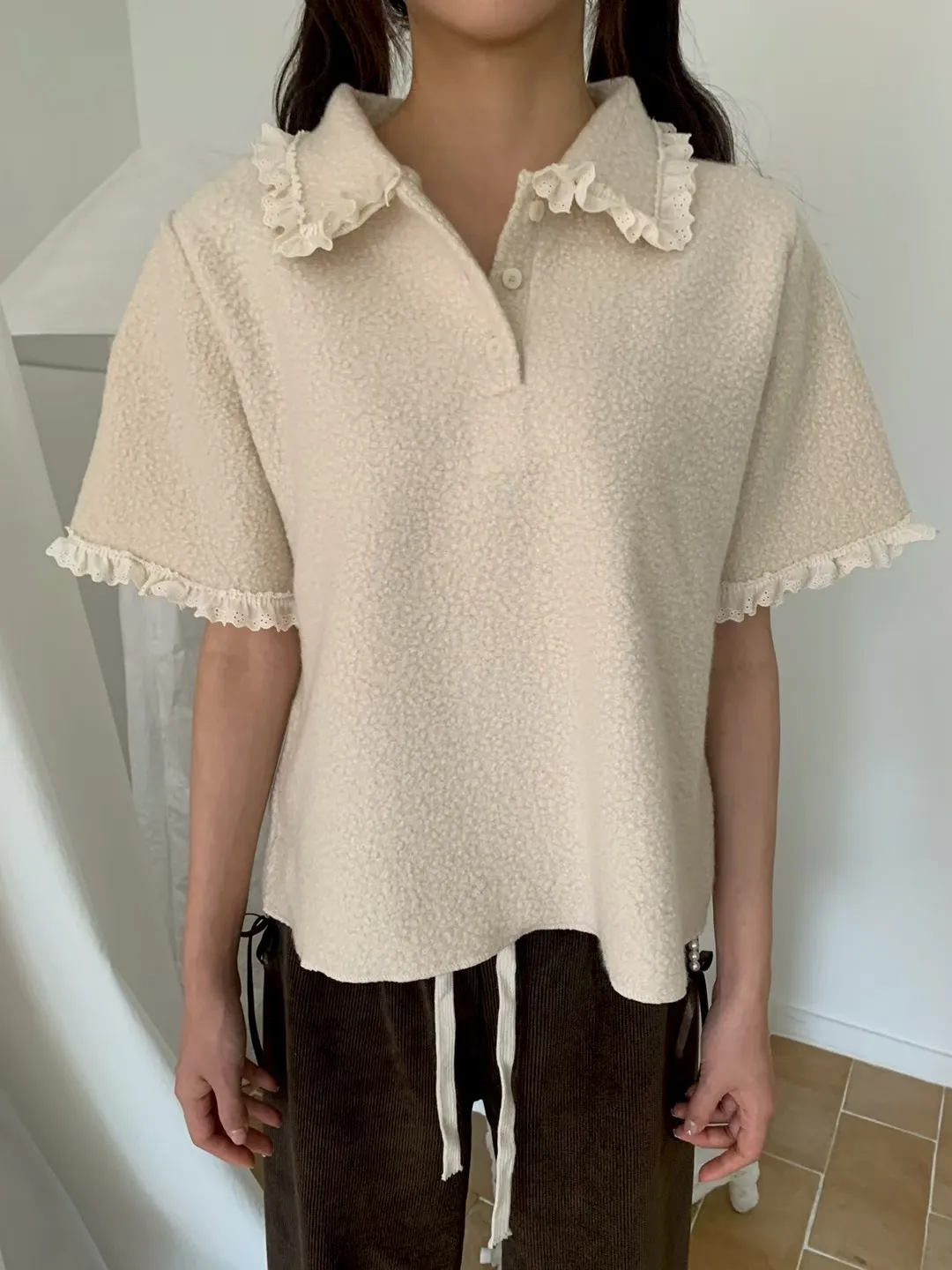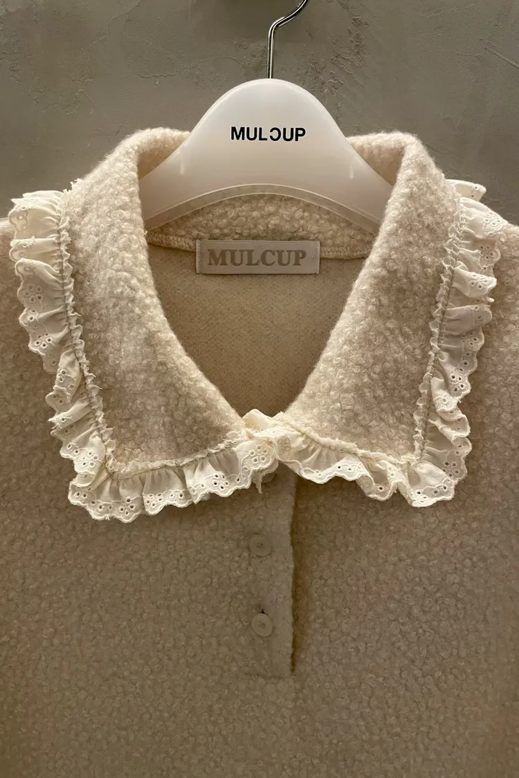 蕾絲荷葉娃娃領毛呢短袖上衣