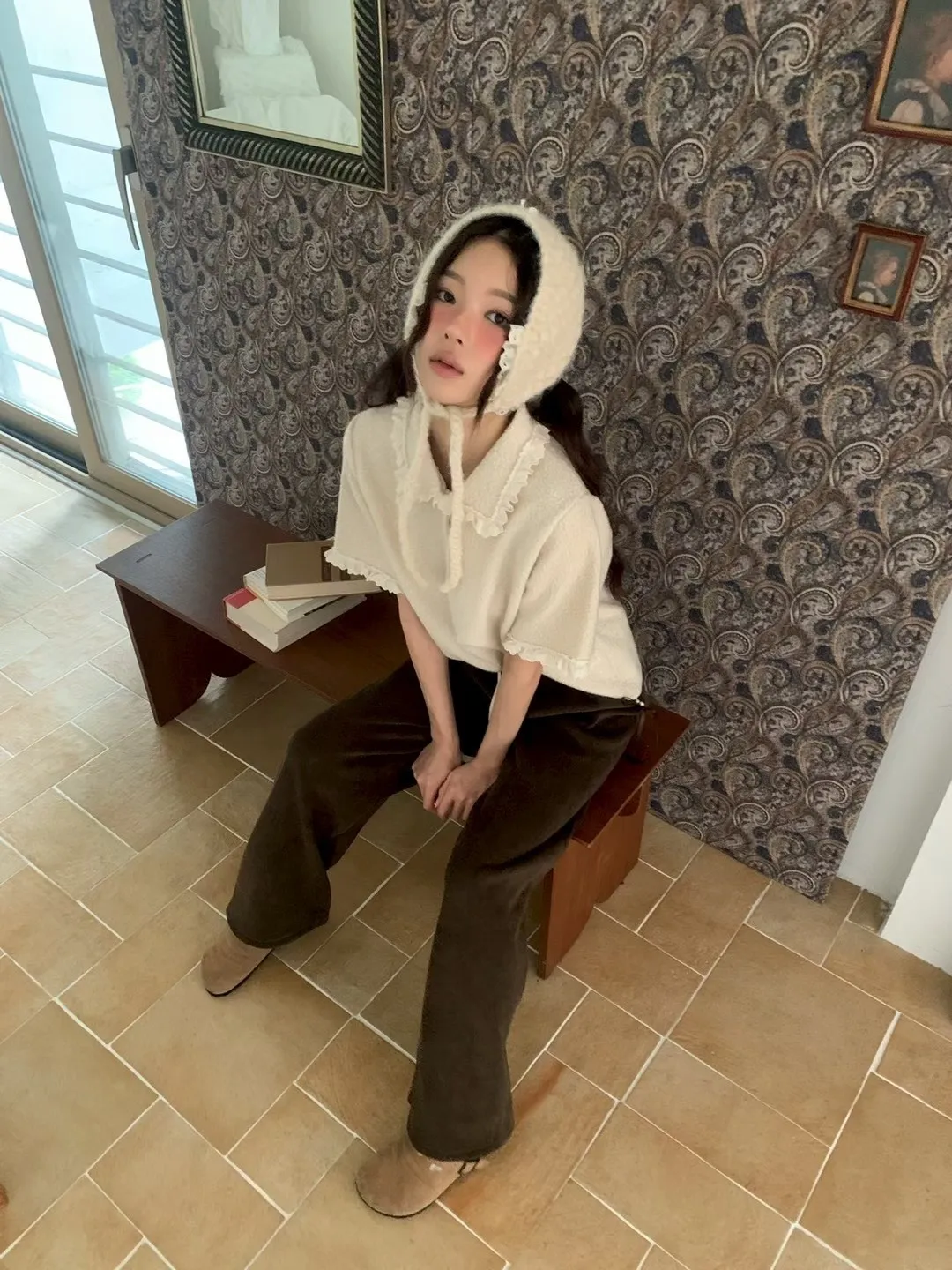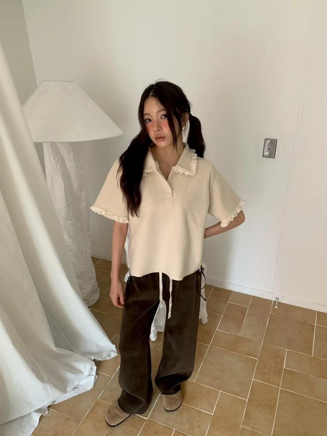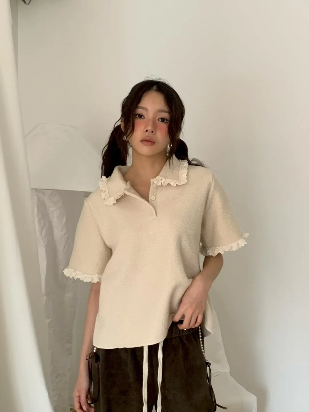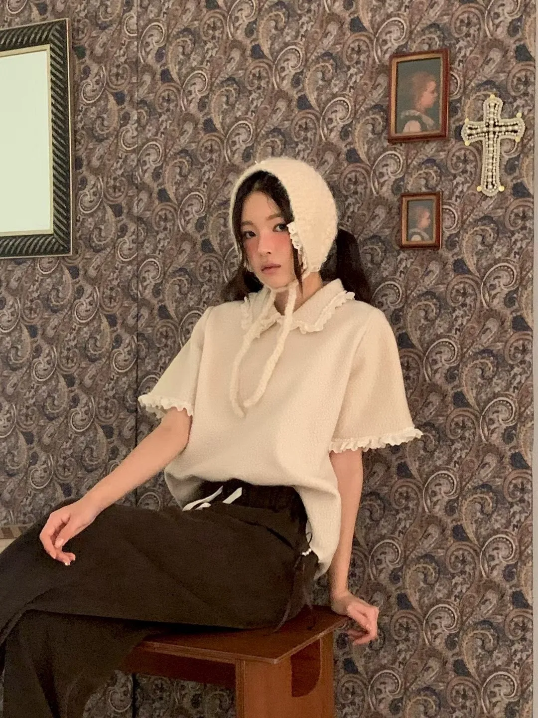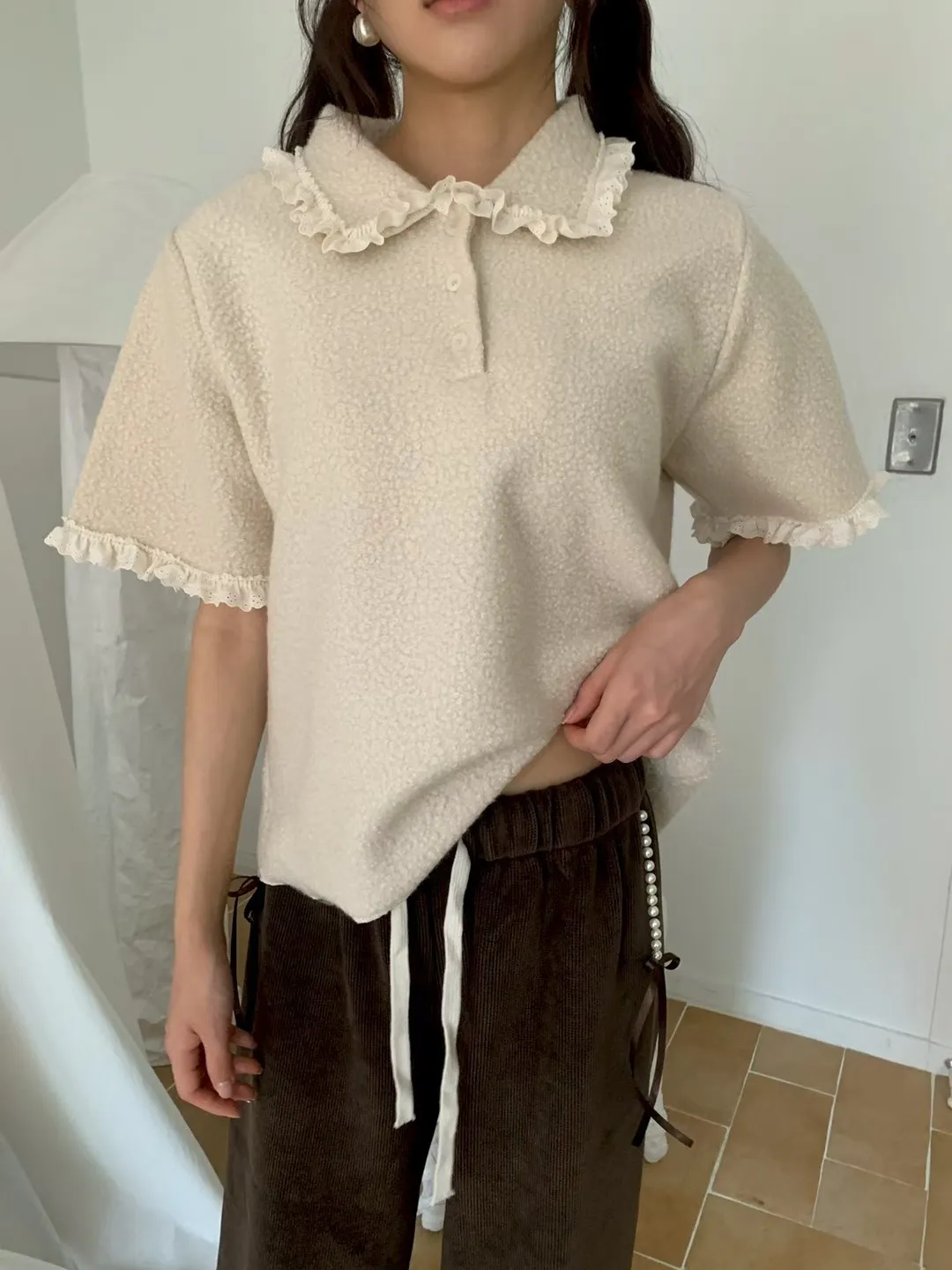 蕾絲荷葉娃娃領毛呢短袖上衣