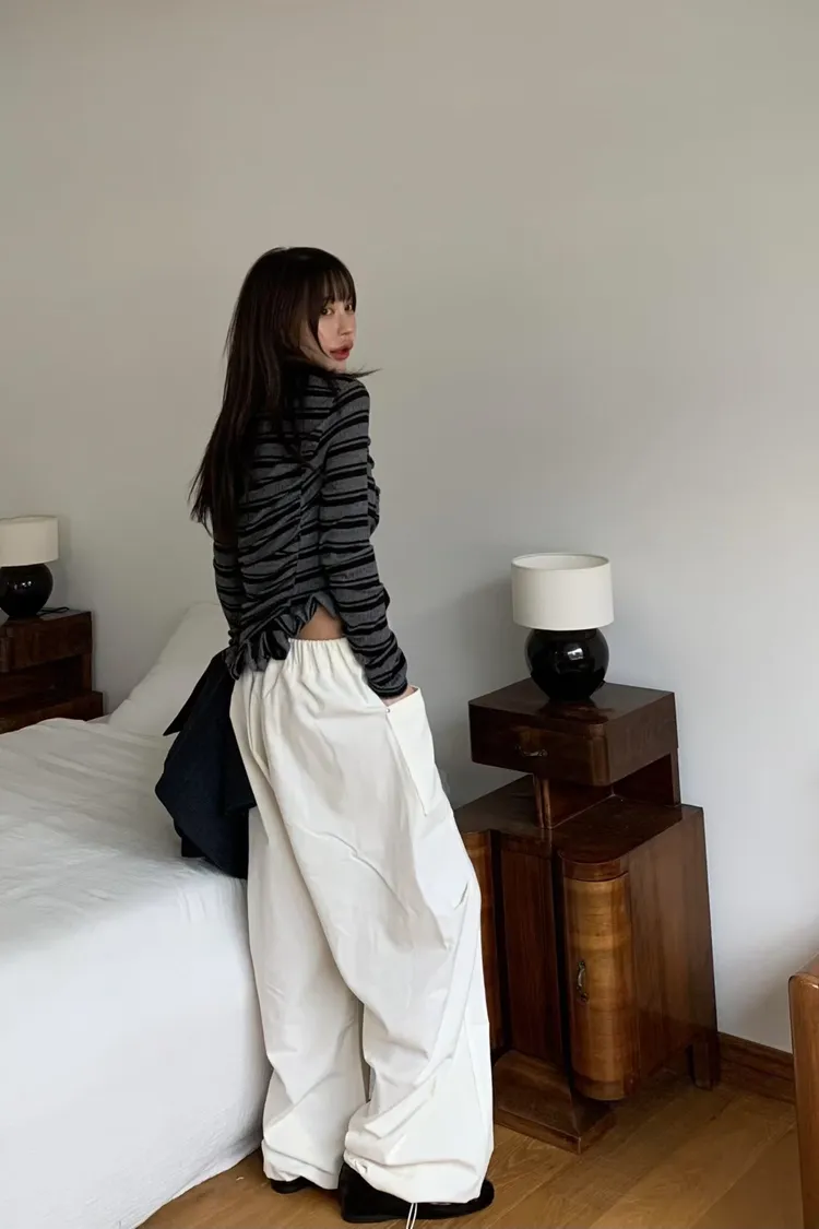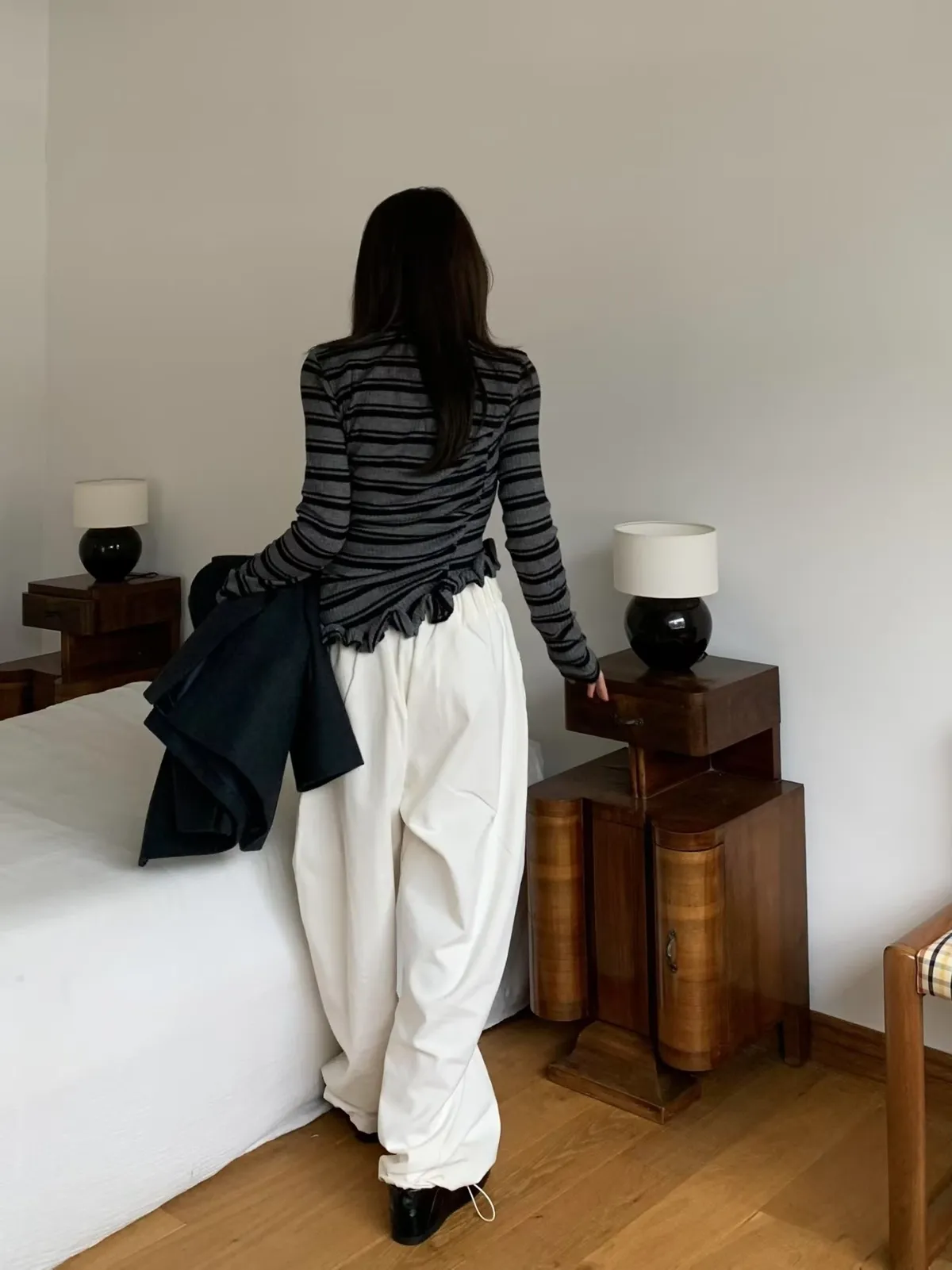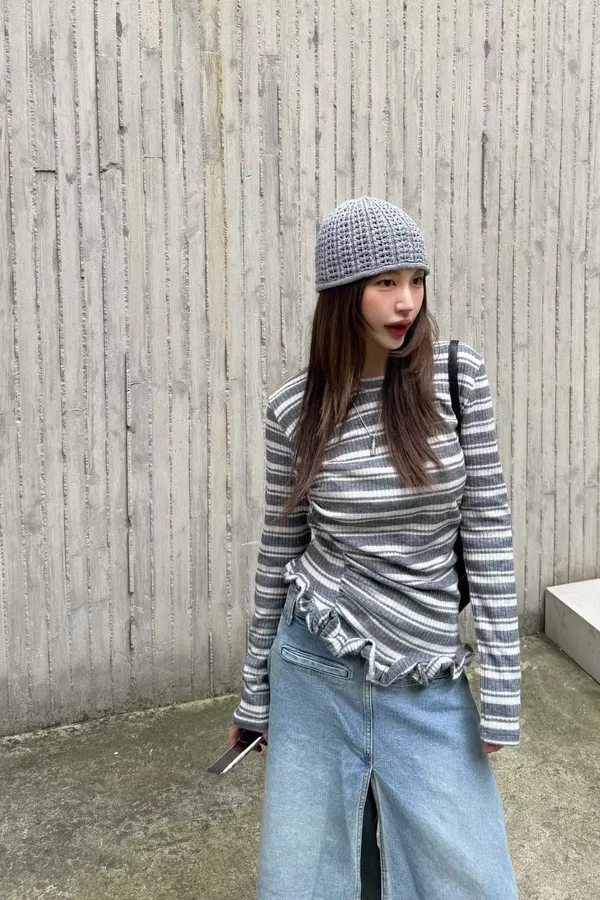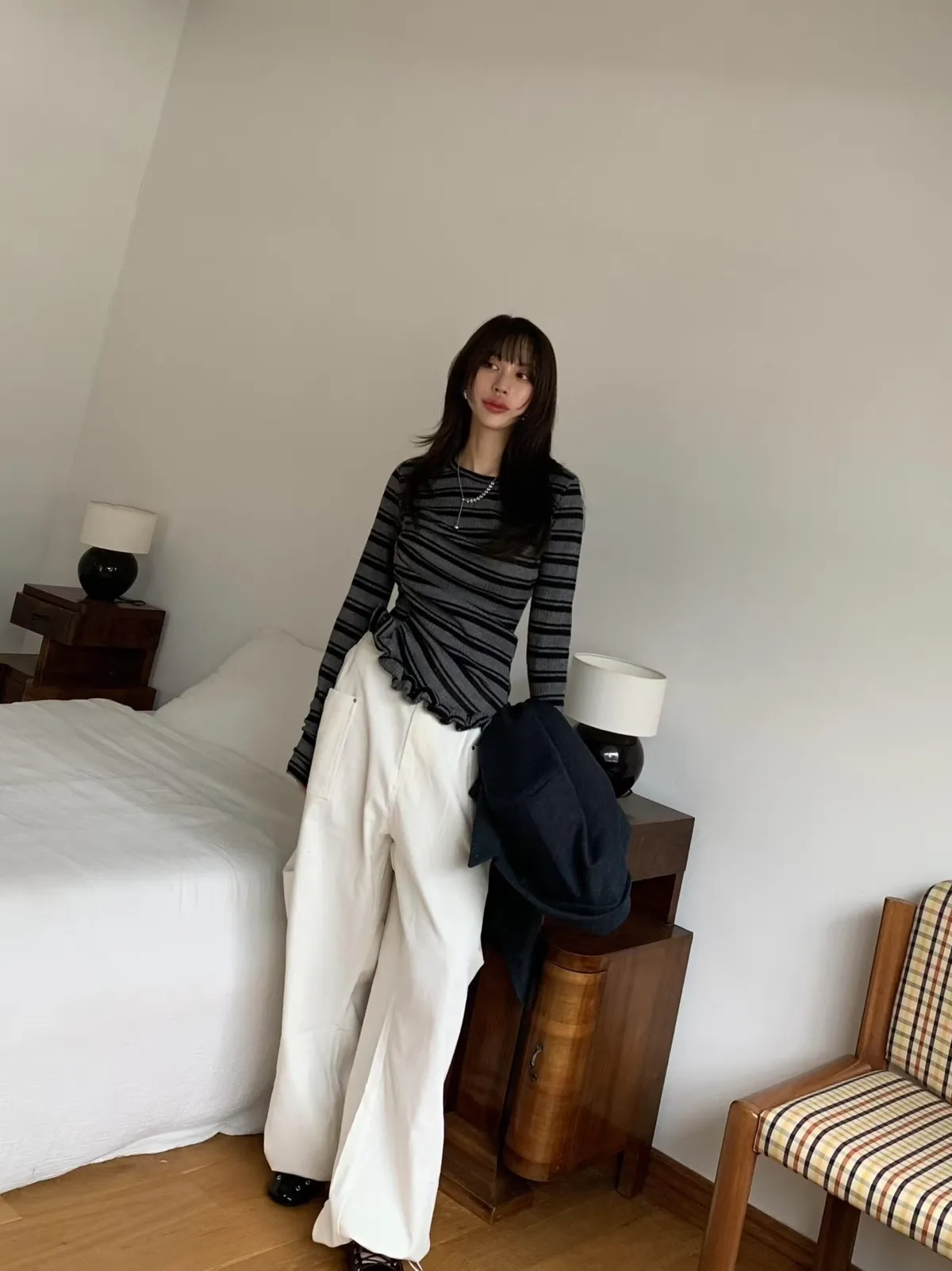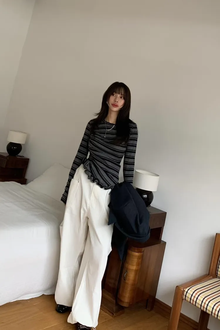 不對稱抓皺抽皺條紋棉上衣(下擺波浪設計)