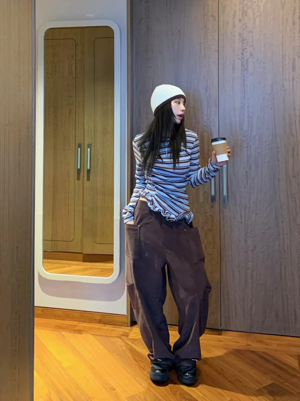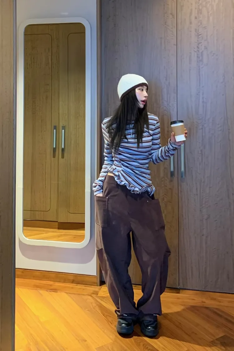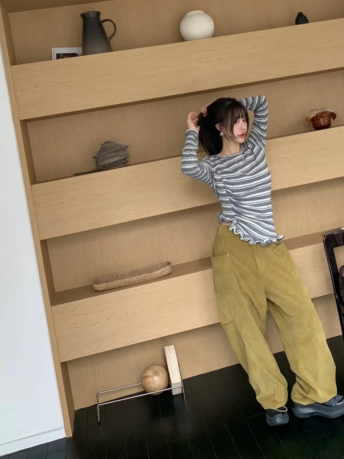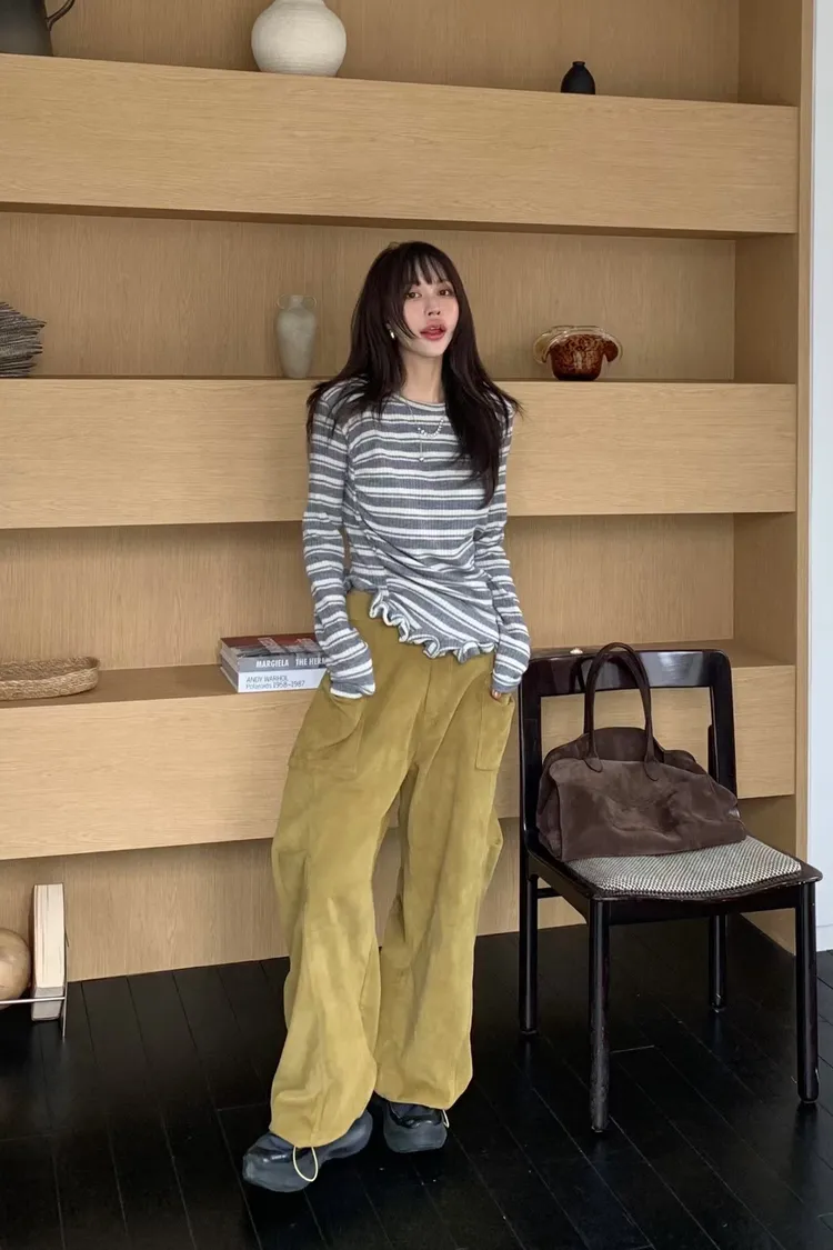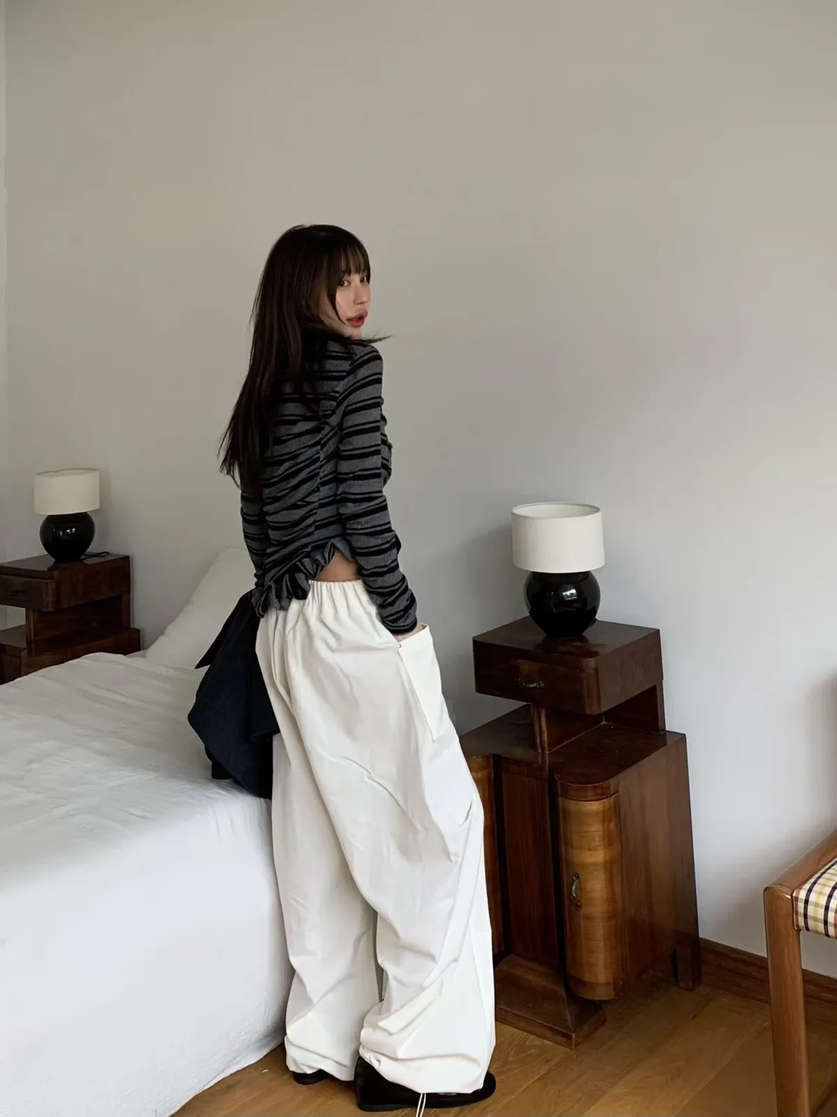 不對稱抓皺抽皺條紋棉上衣(下擺波浪設計)