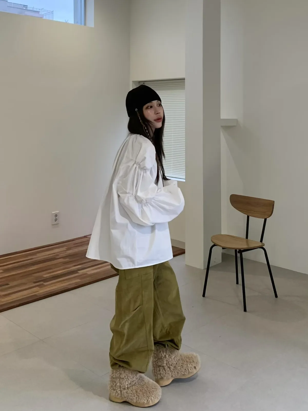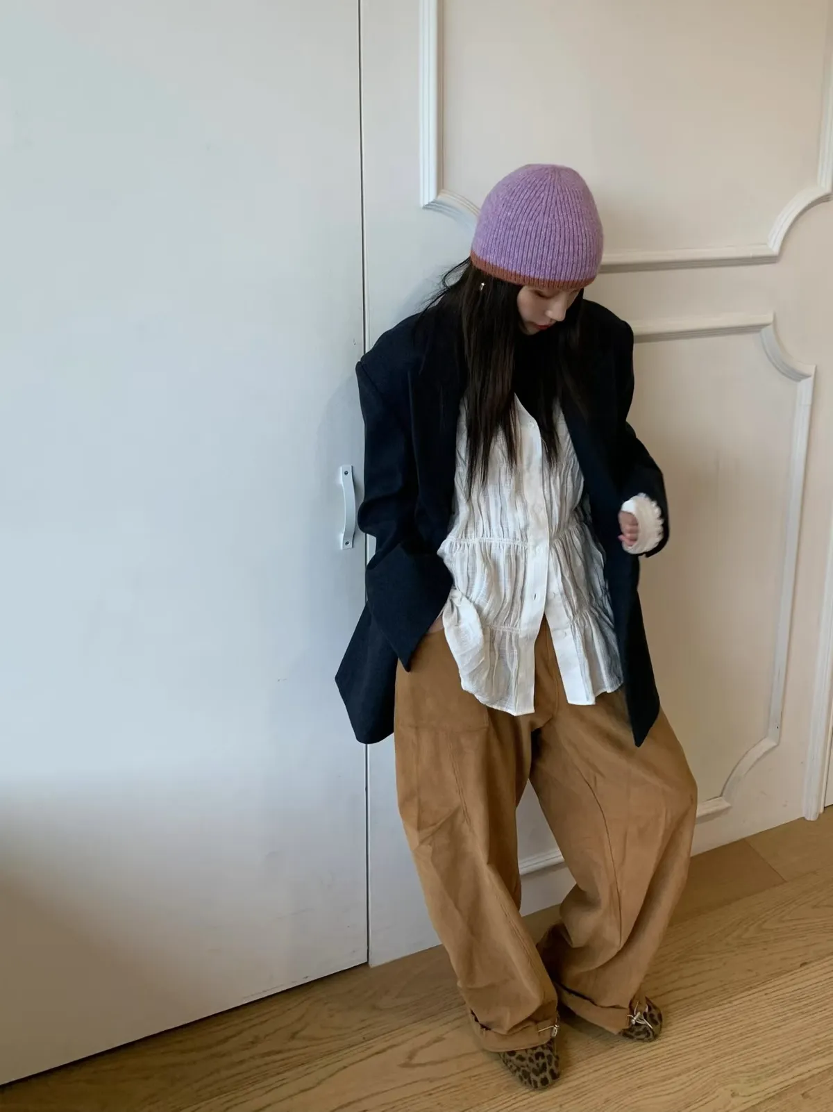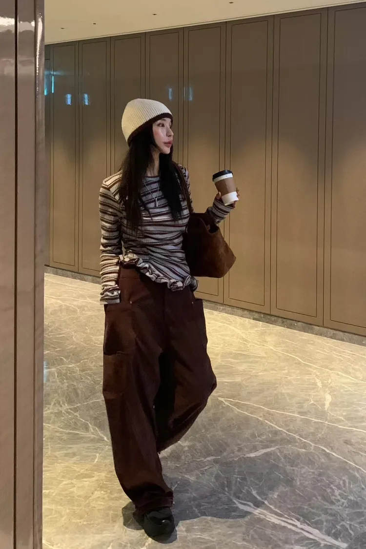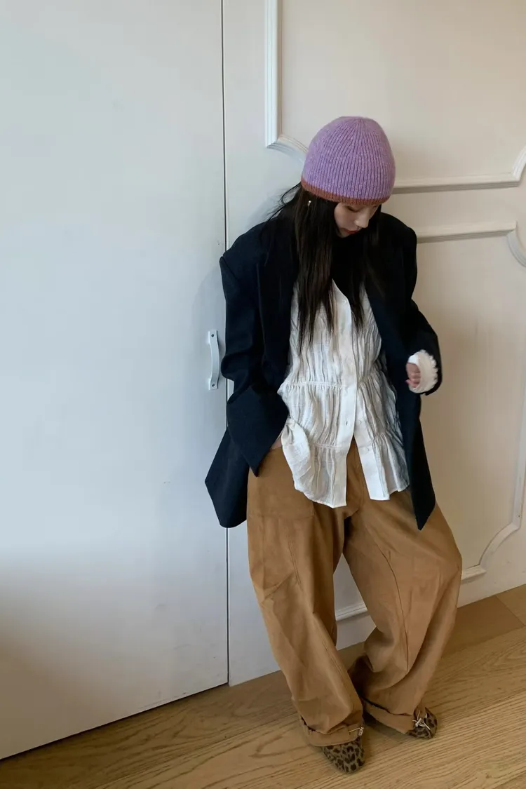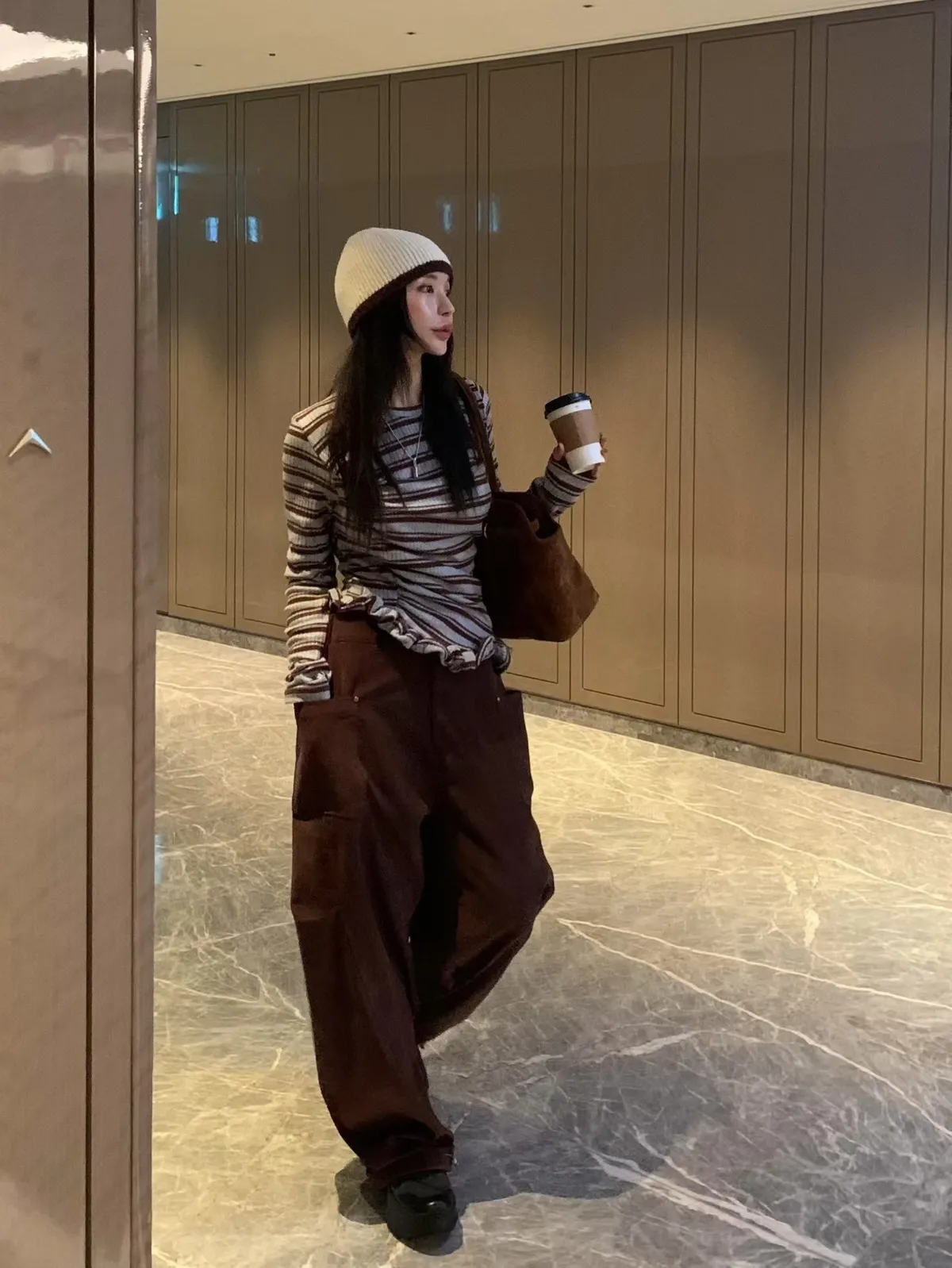 不對稱抓皺抽皺條紋棉上衣(下擺波浪設計)