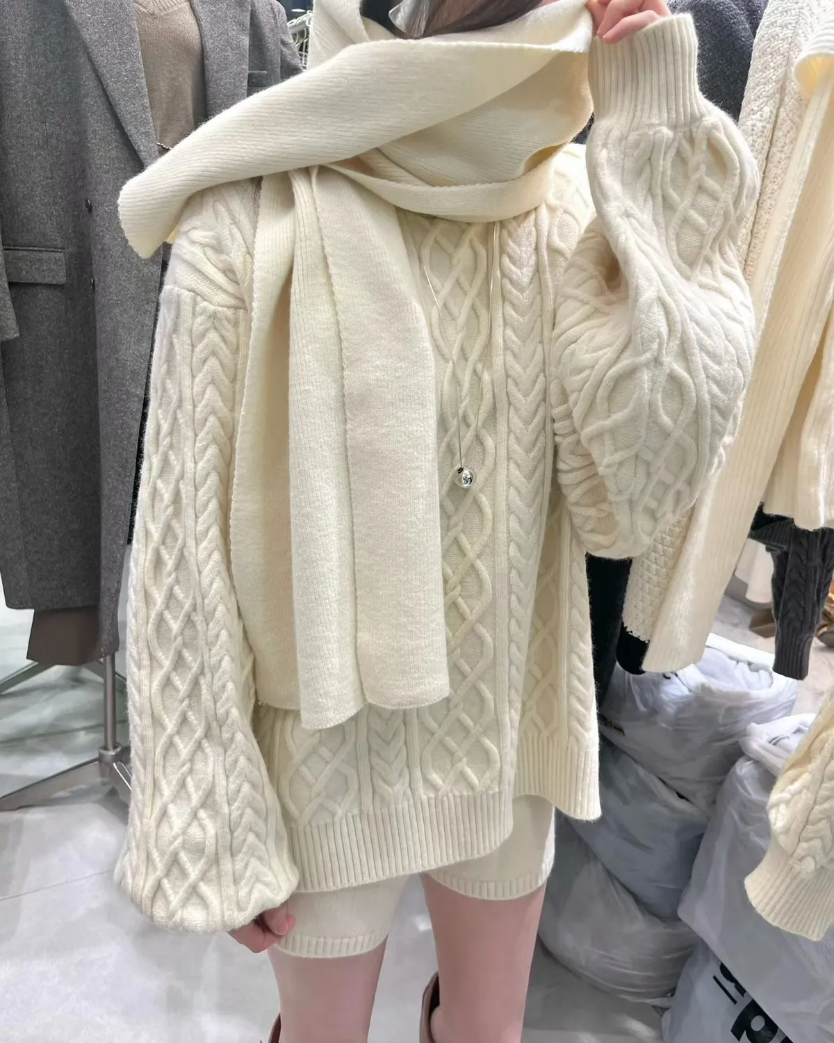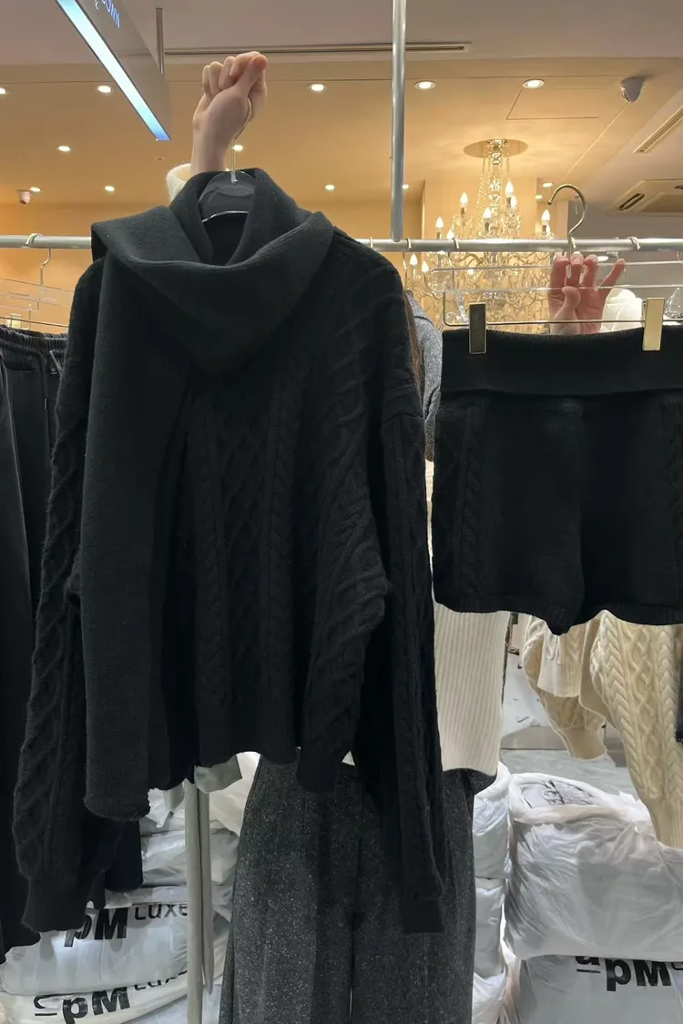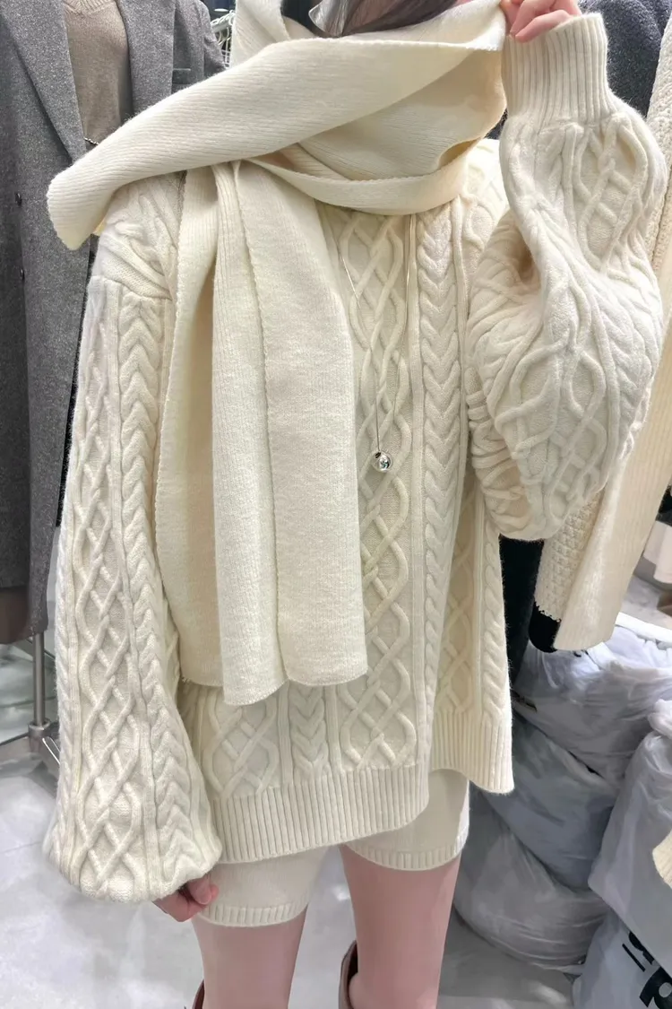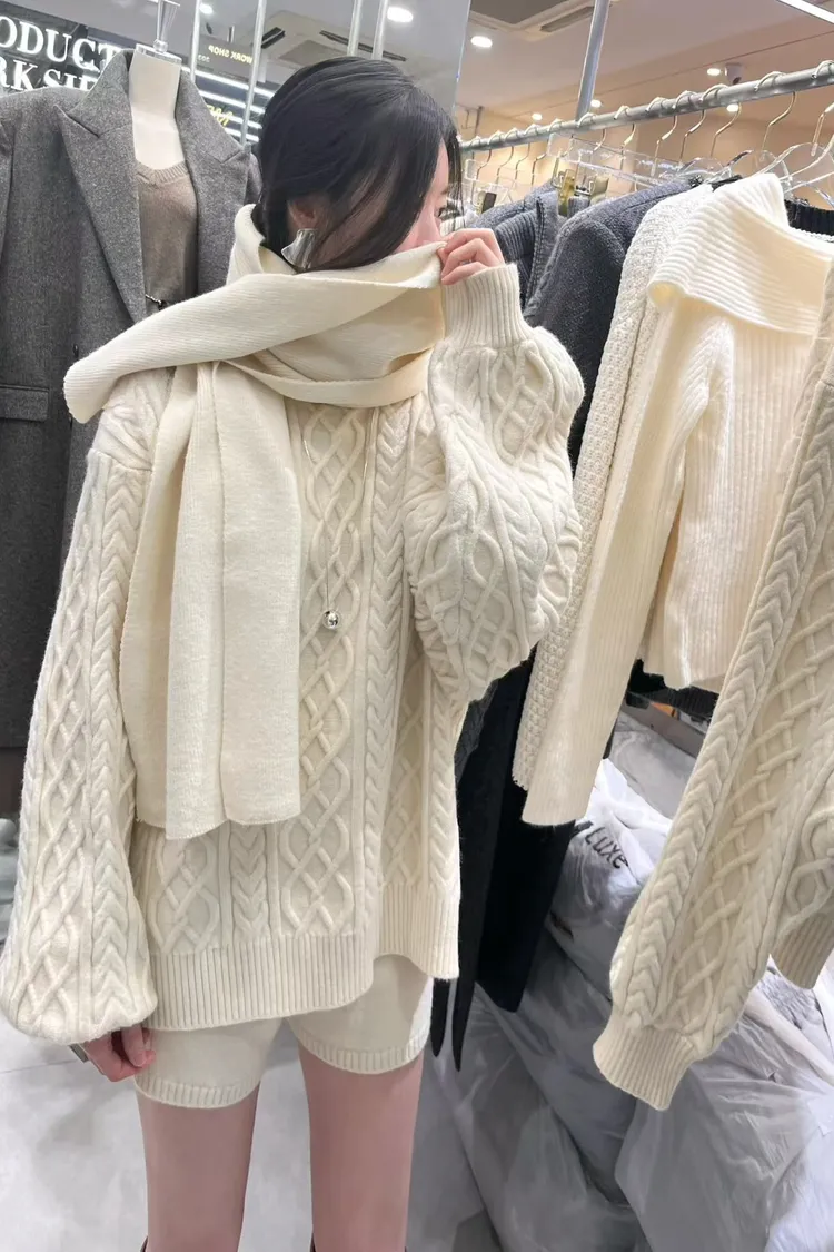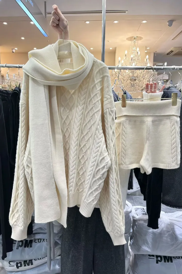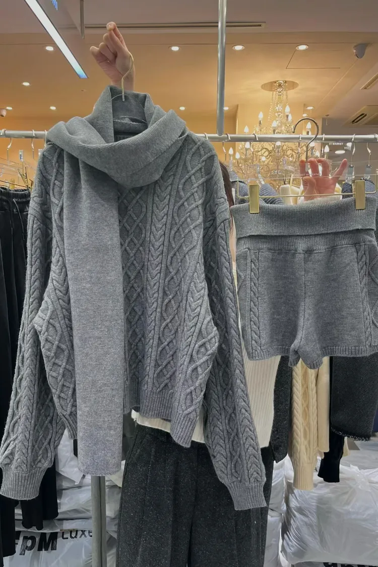 慵懶感麻花毛衣+短褲+同色圍巾套裝