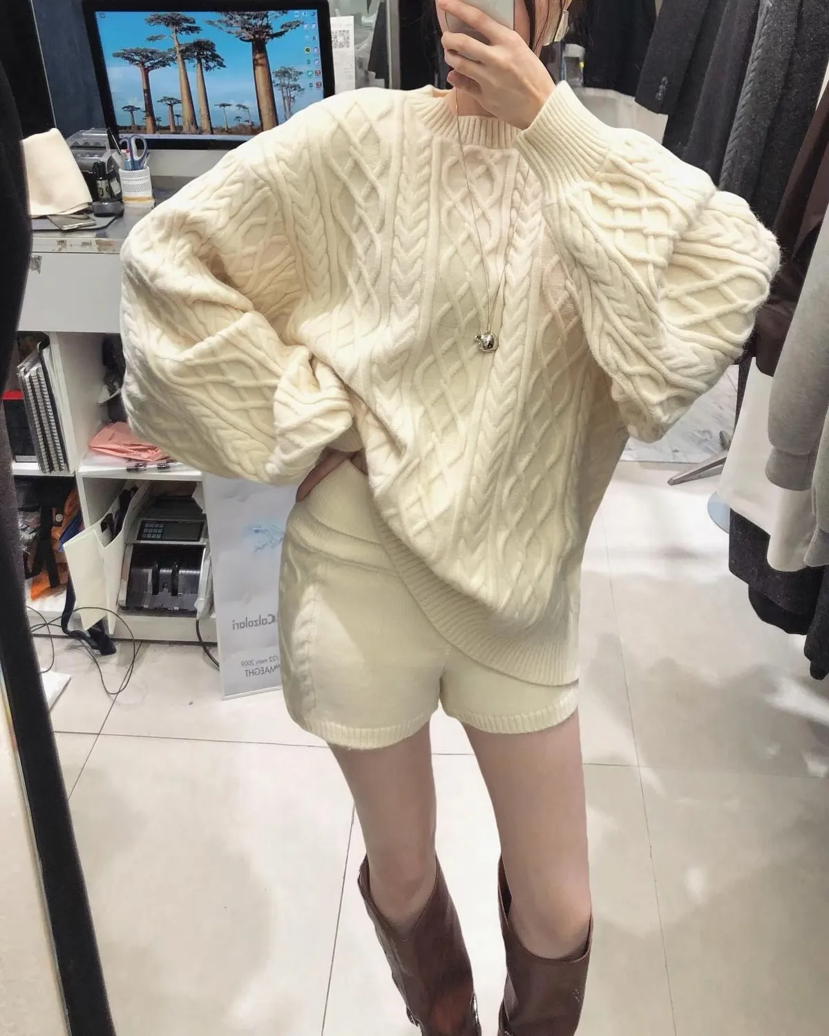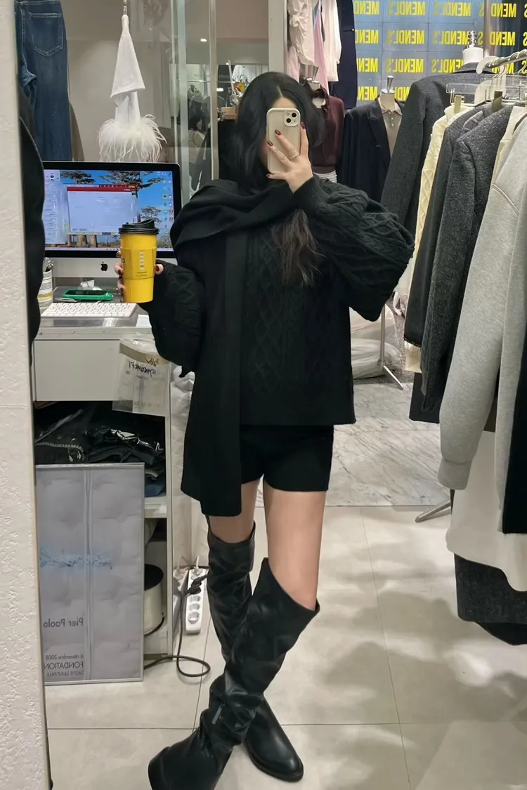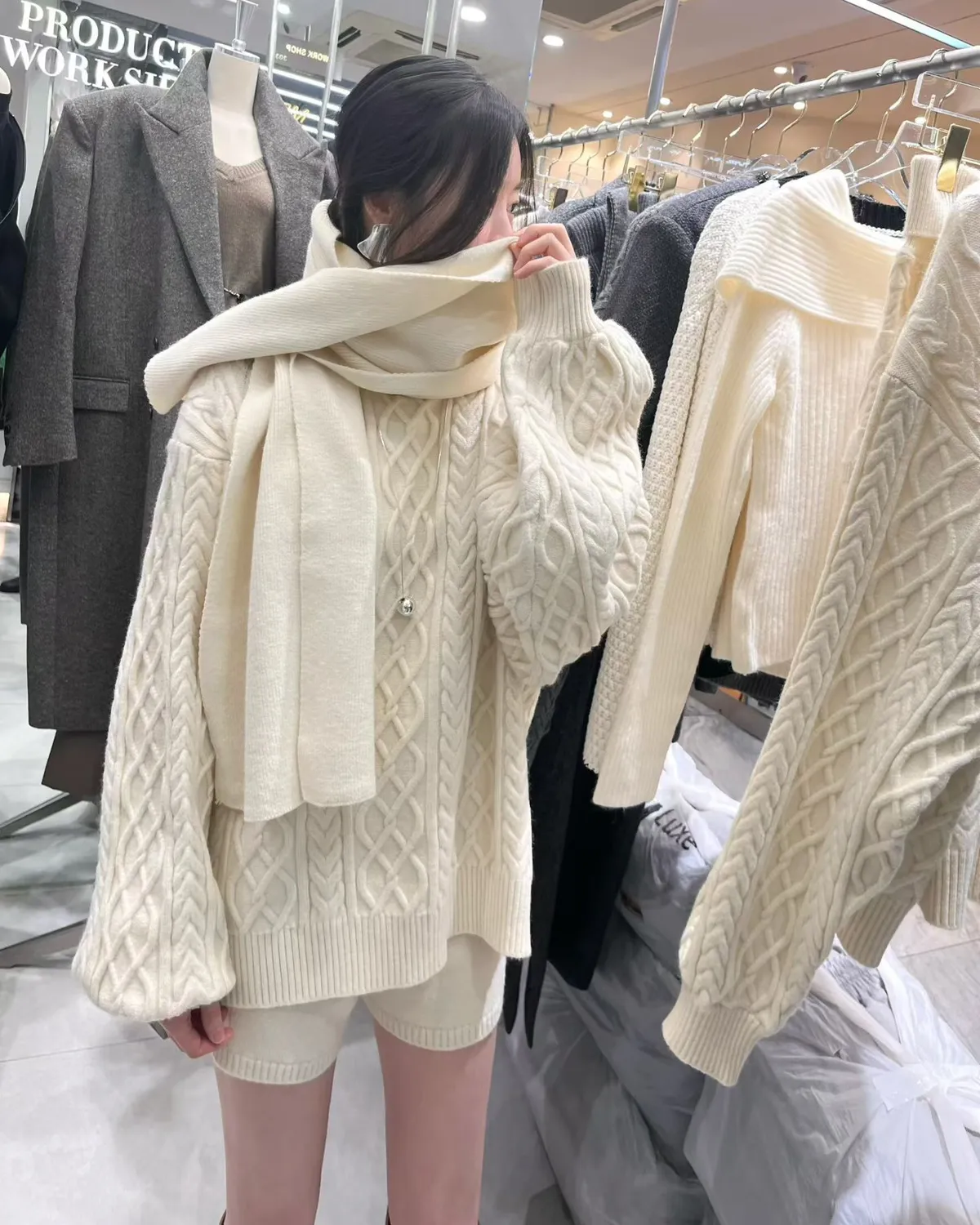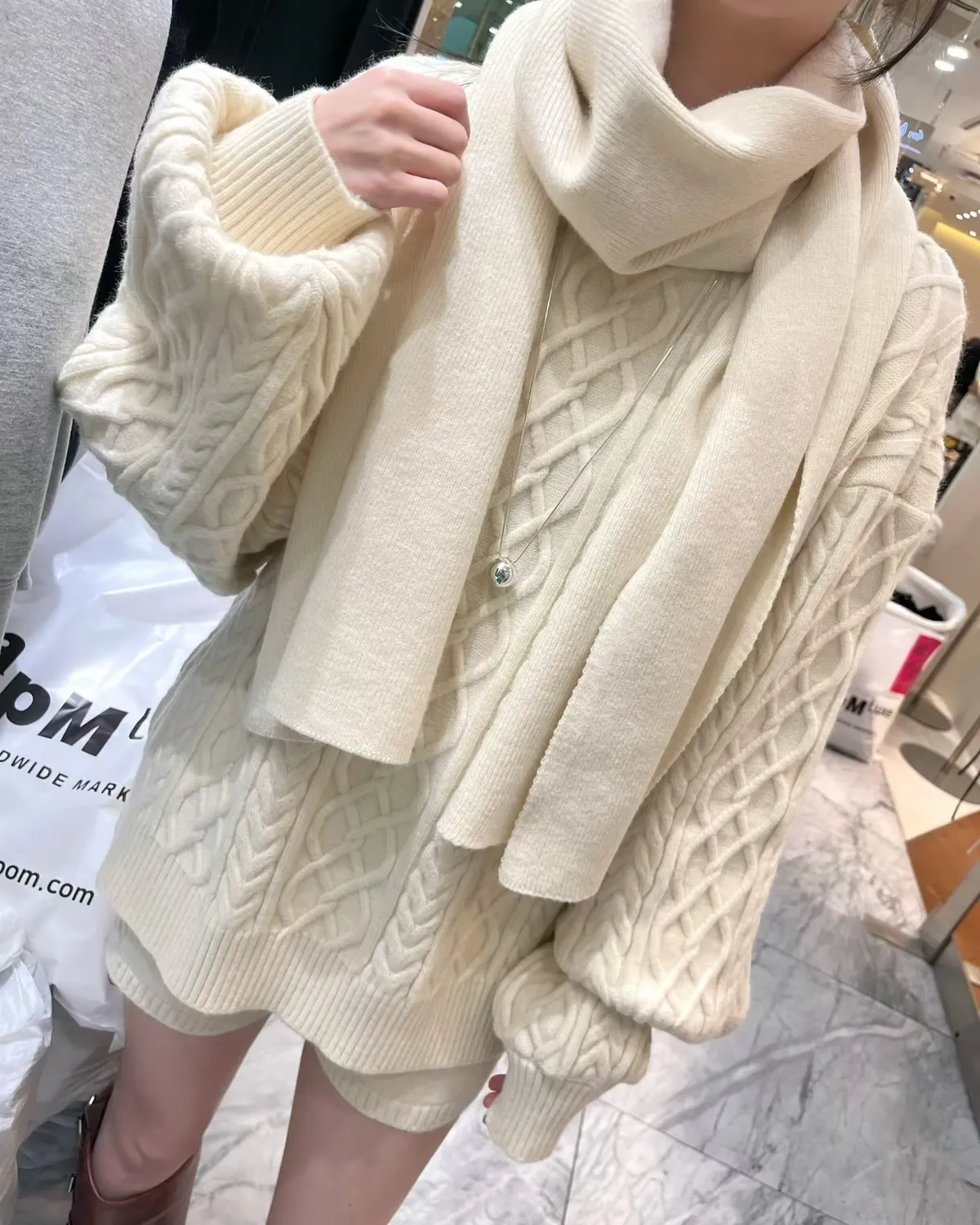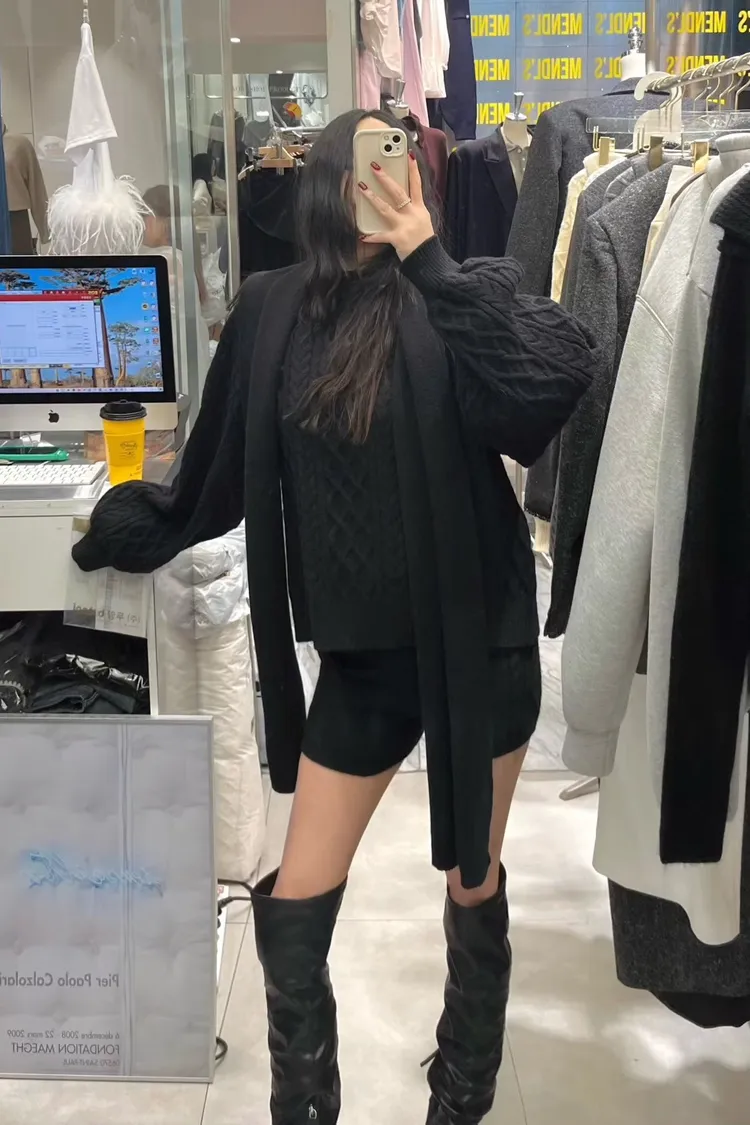 慵懶感麻花毛衣+短褲+同色圍巾套裝