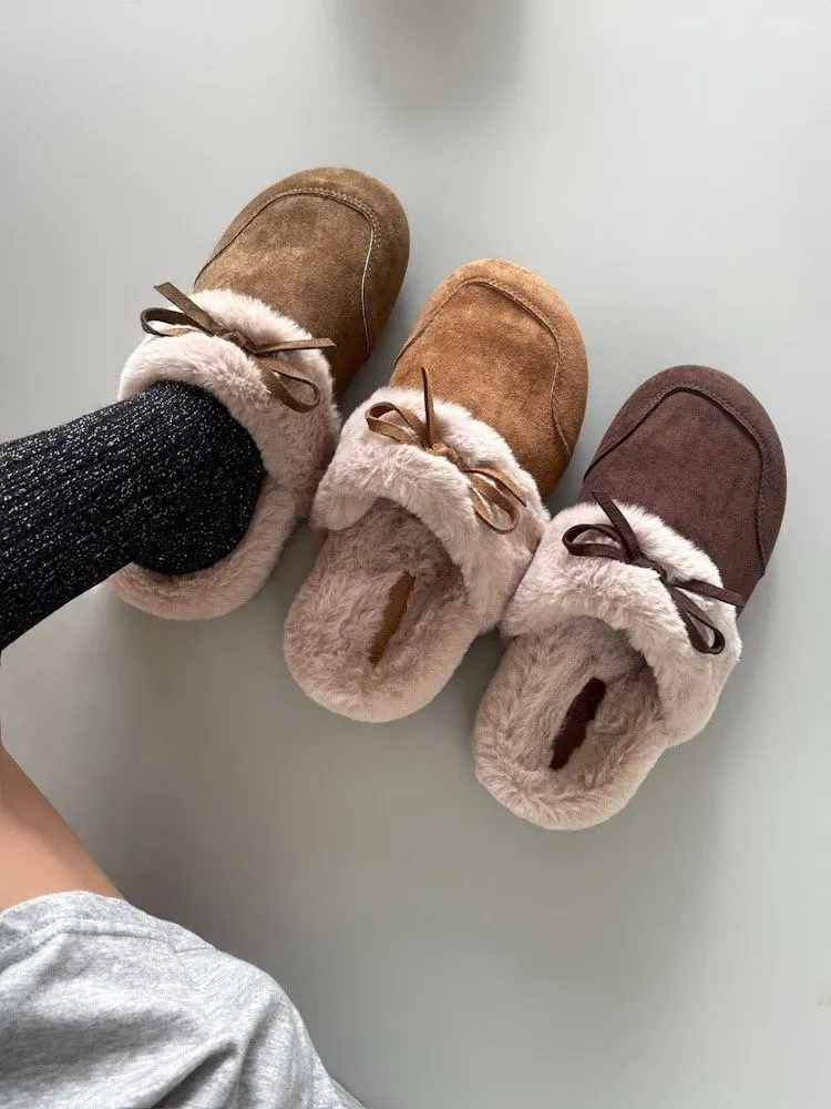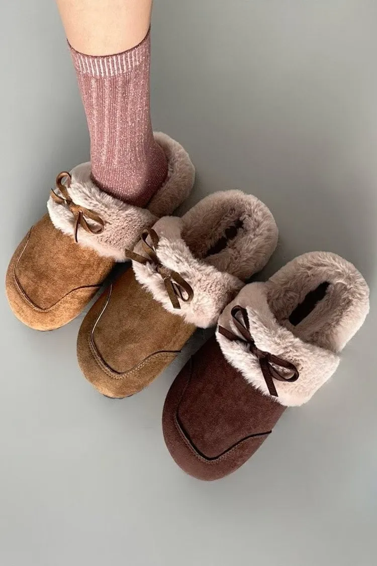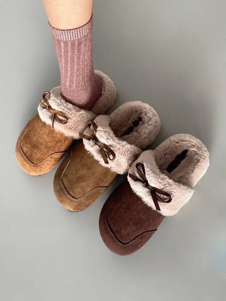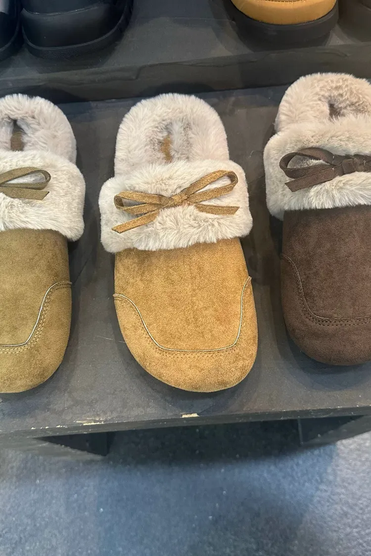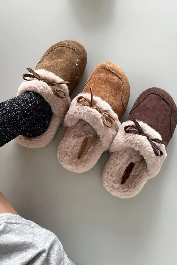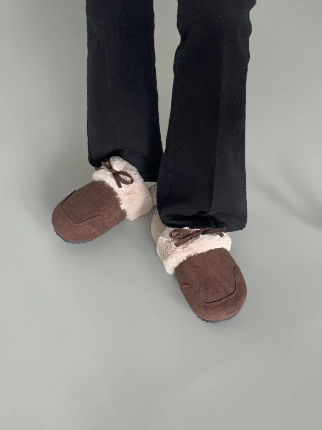 柔軟麂皮拼接蝴蝶結毛毛拖