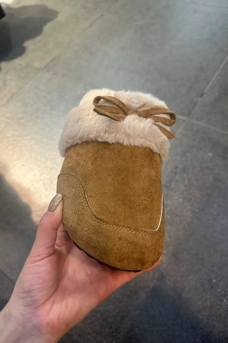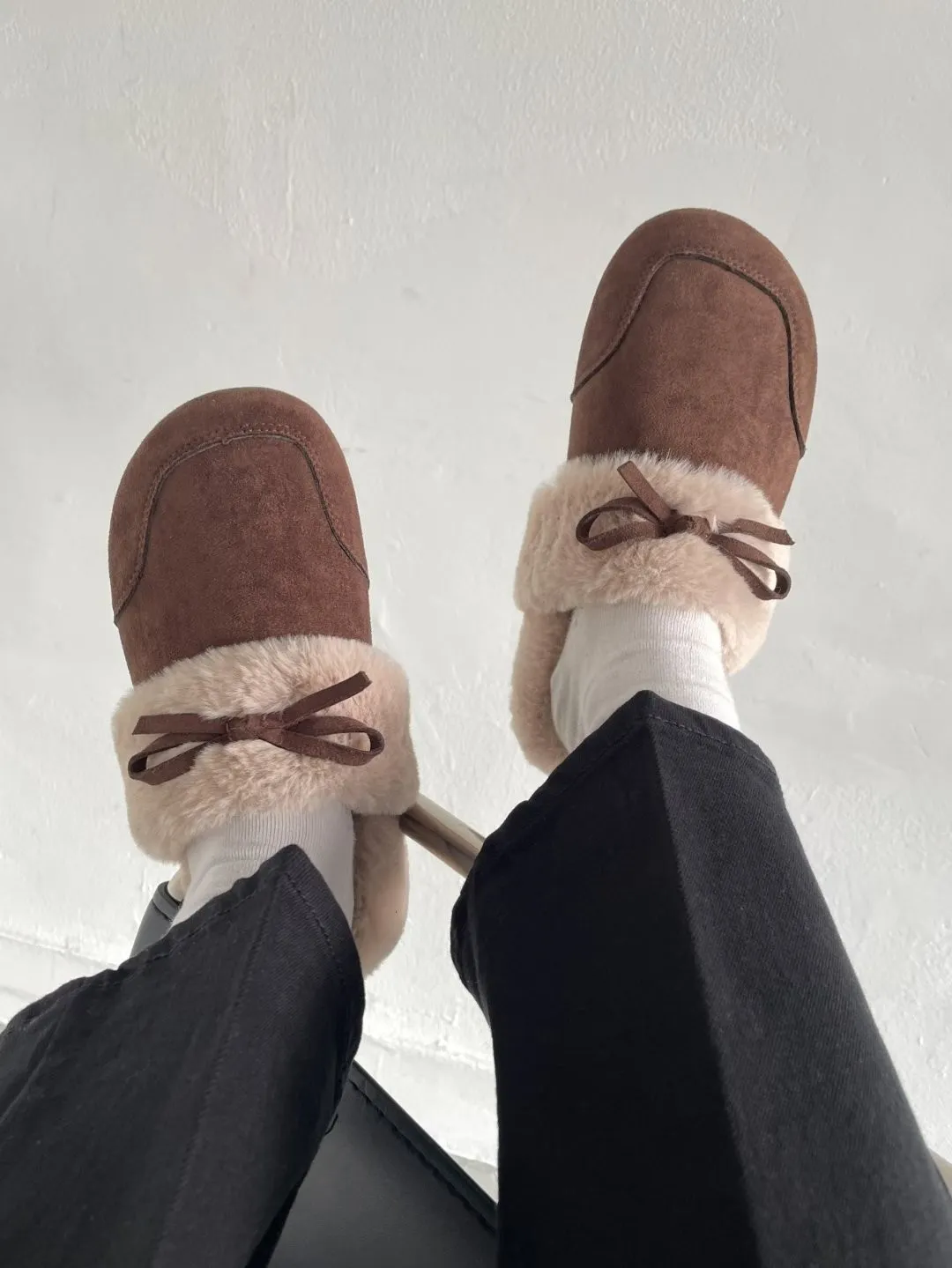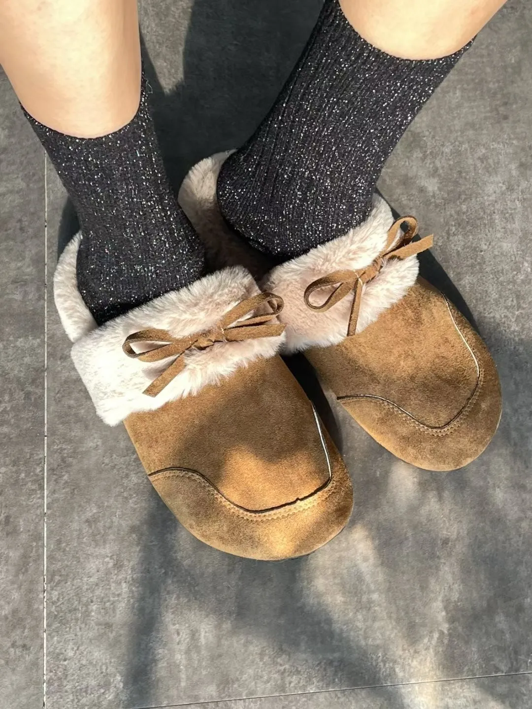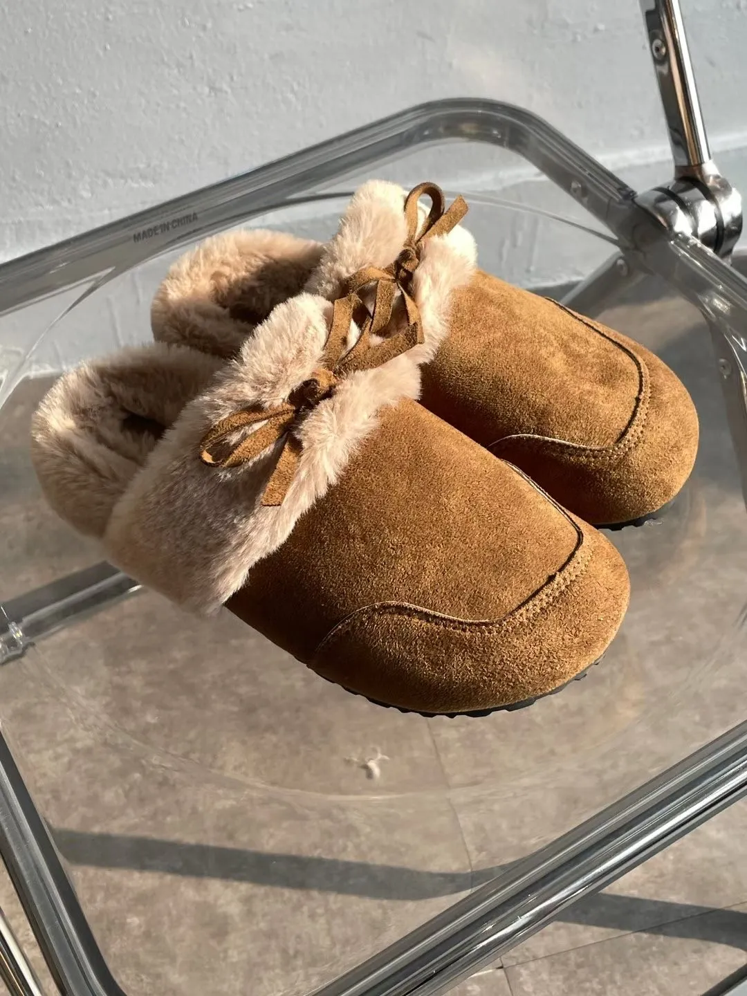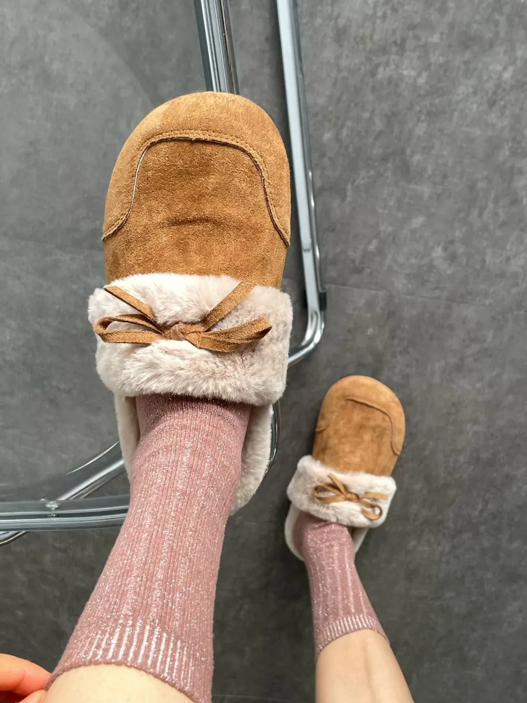 柔軟麂皮拼接蝴蝶結毛毛拖