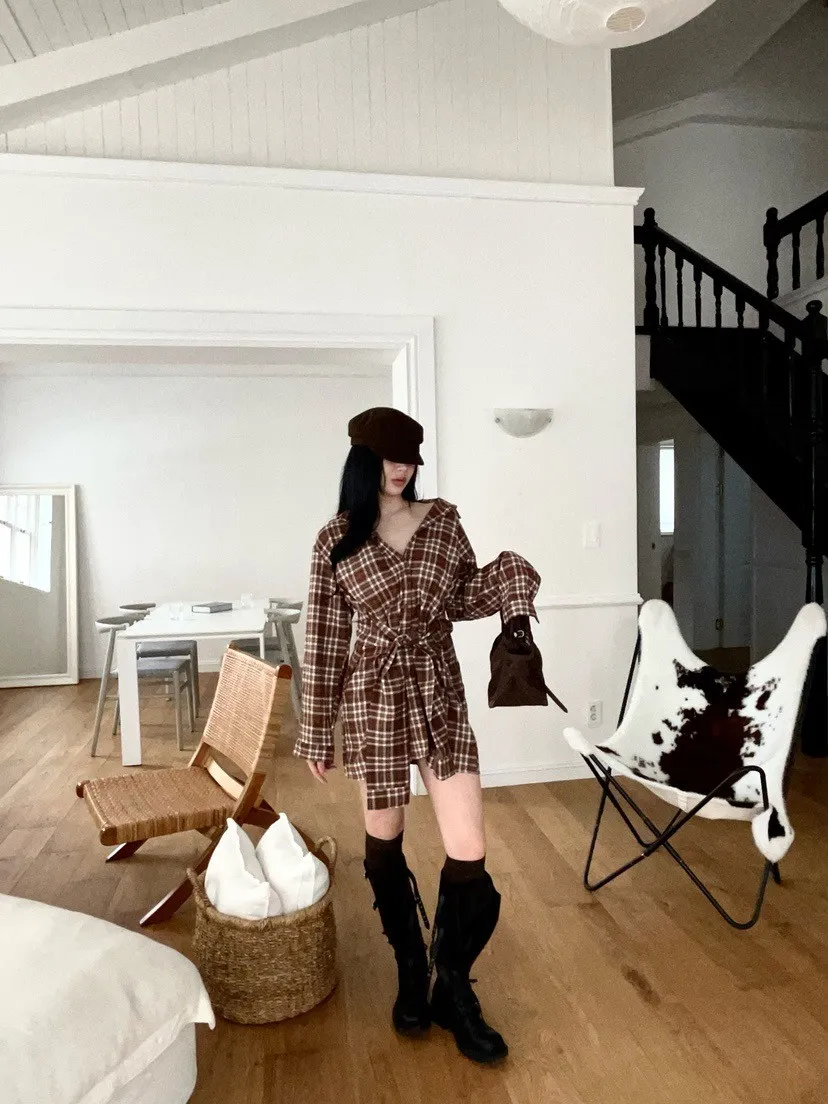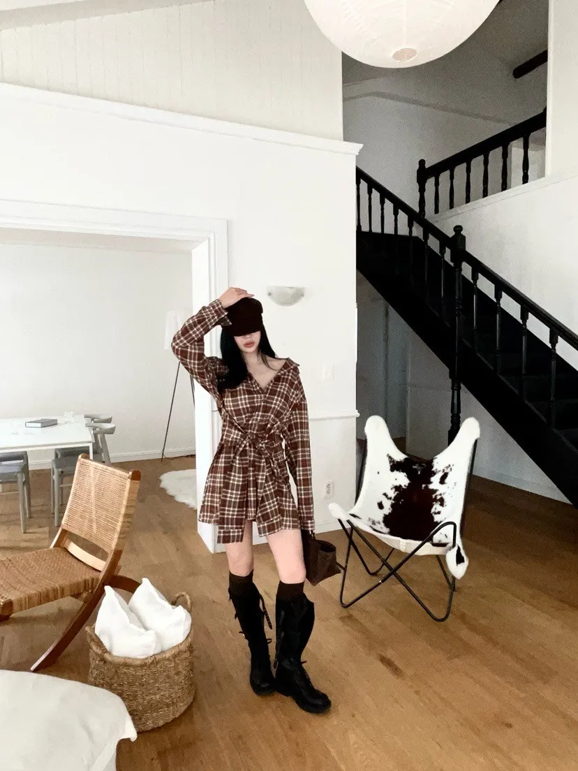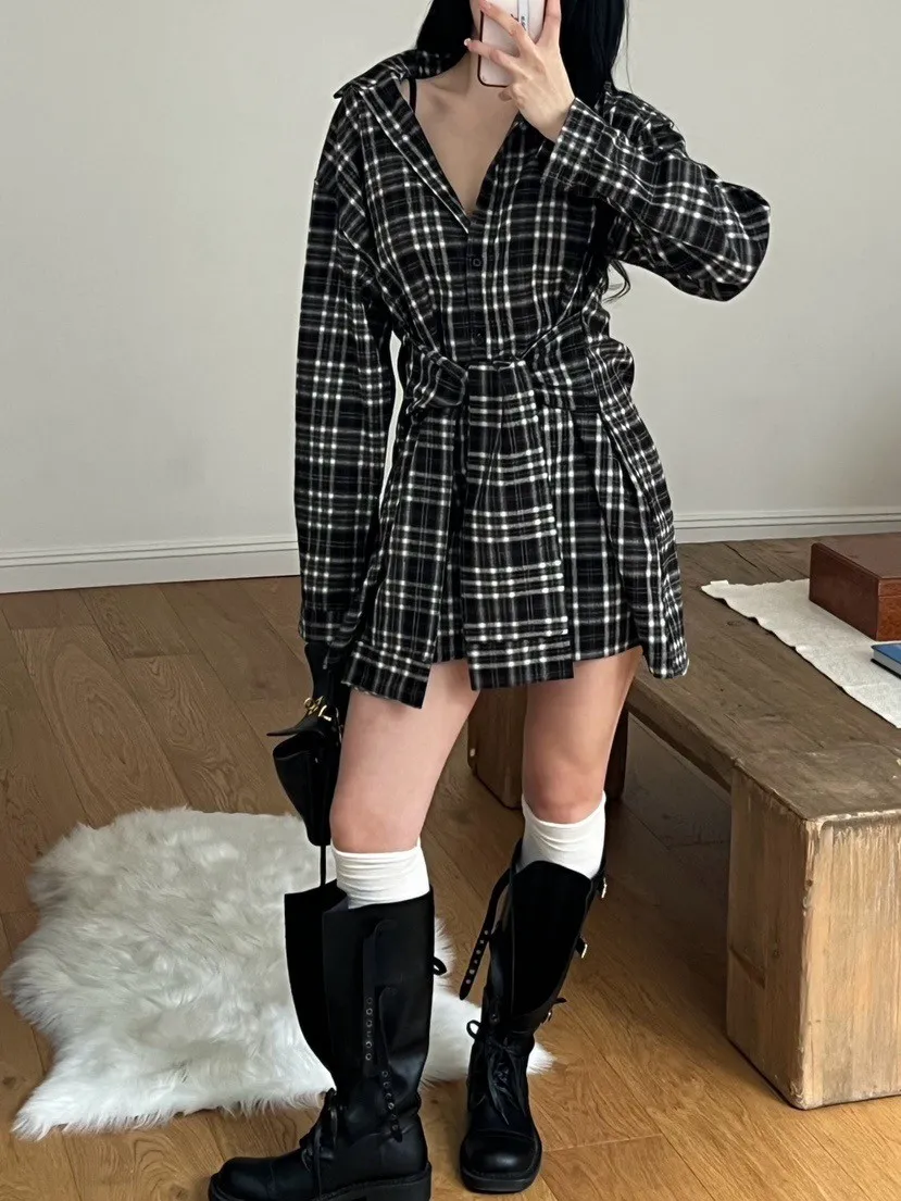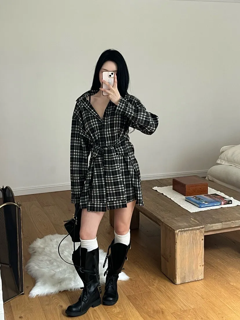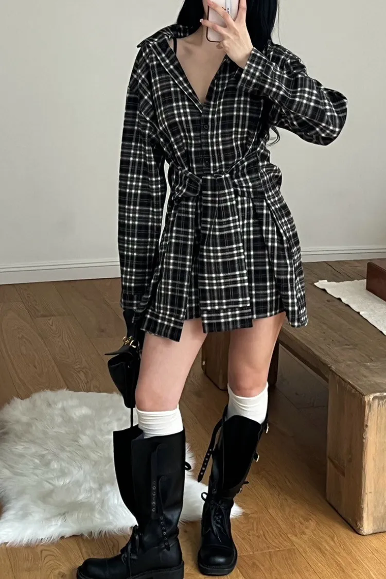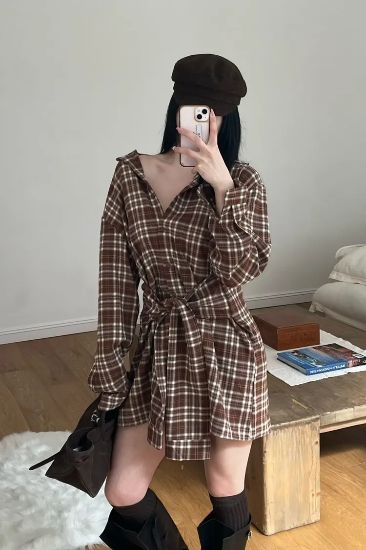 格紋綁帶襯衫連身裙