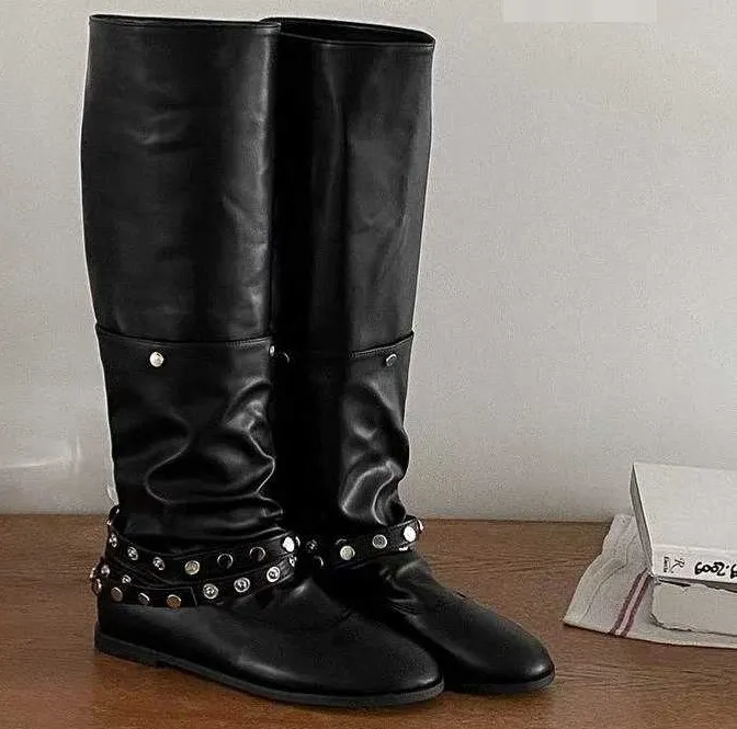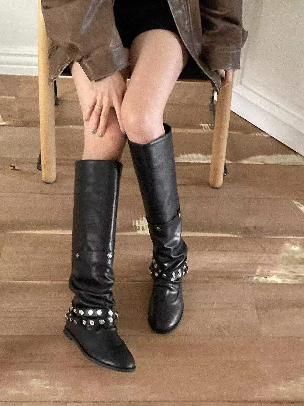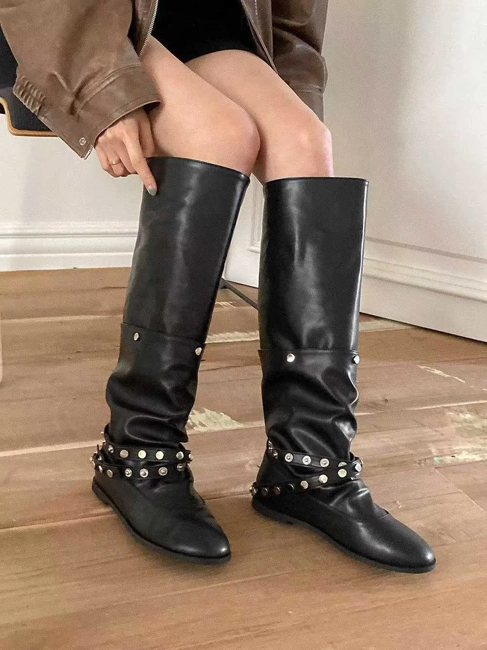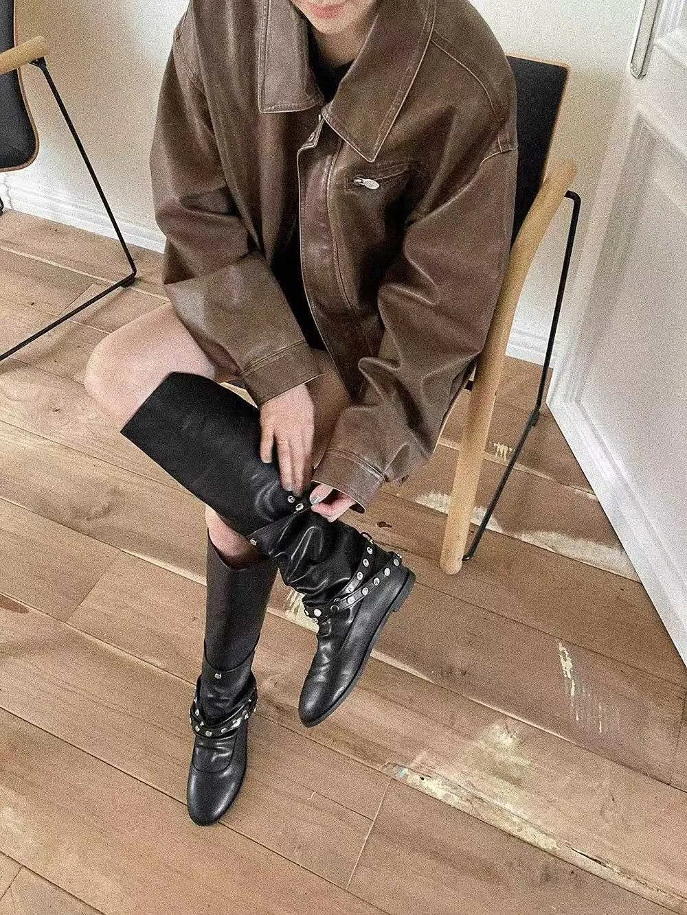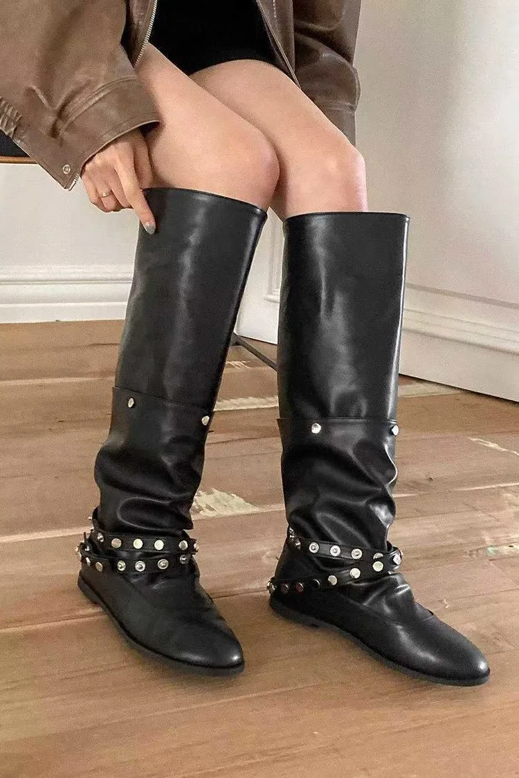 帥氣銀釦皮革長靴