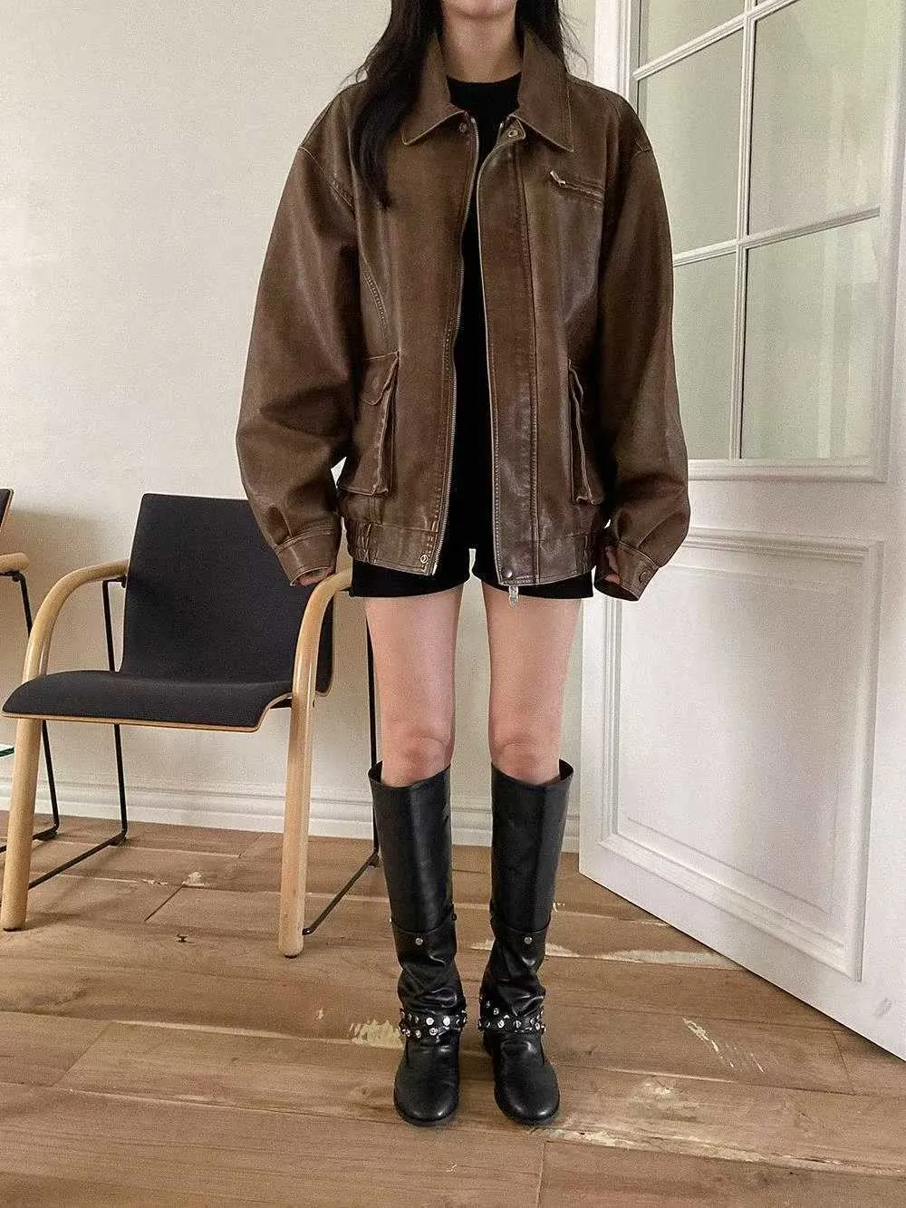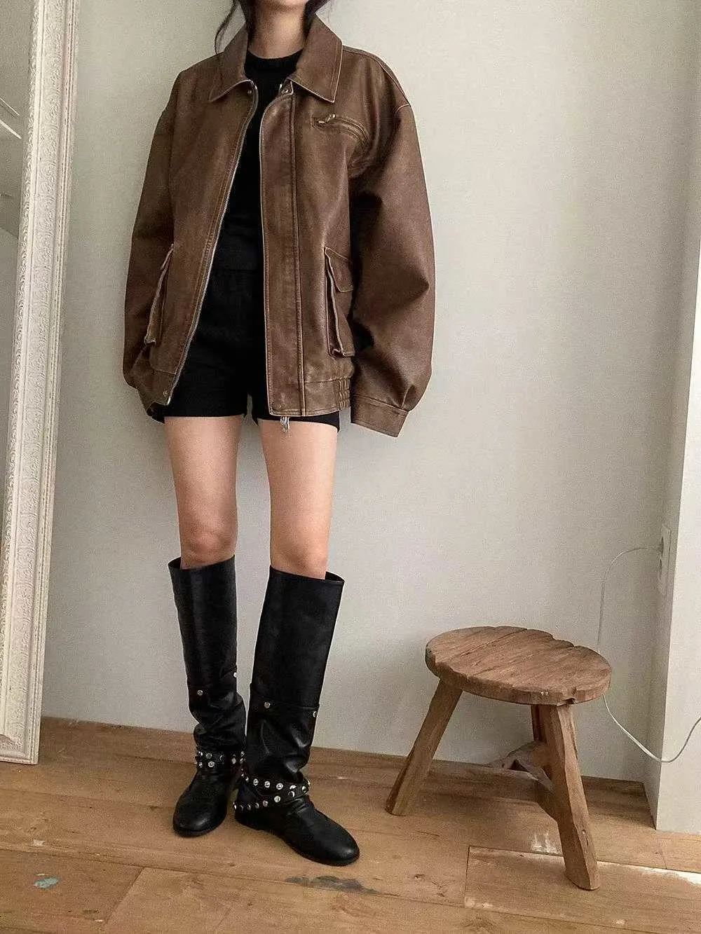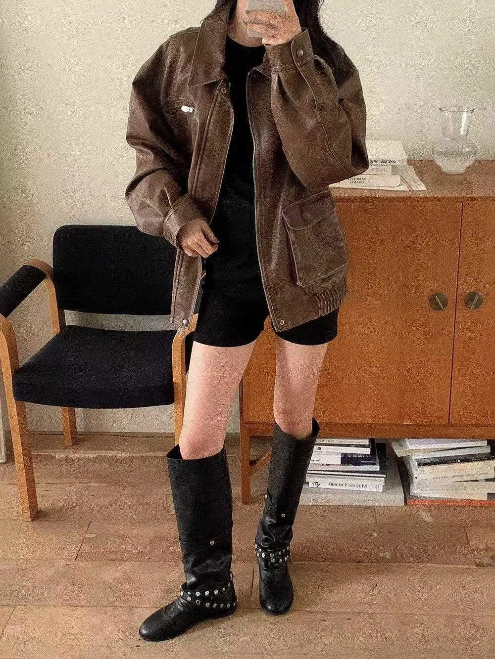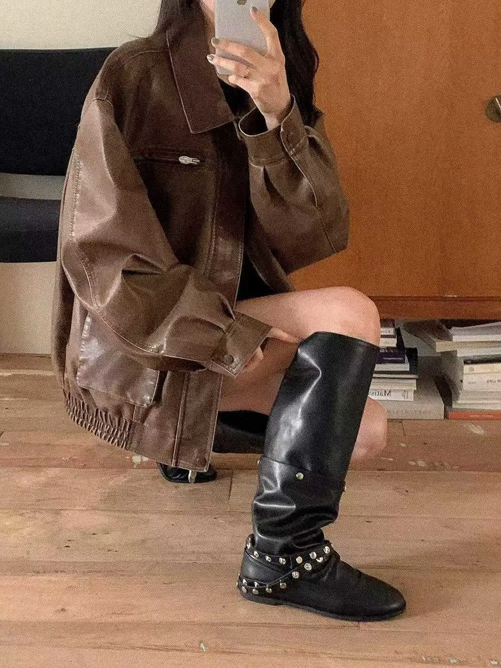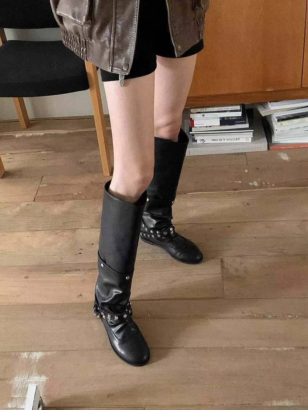 帥氣銀釦皮革長靴
