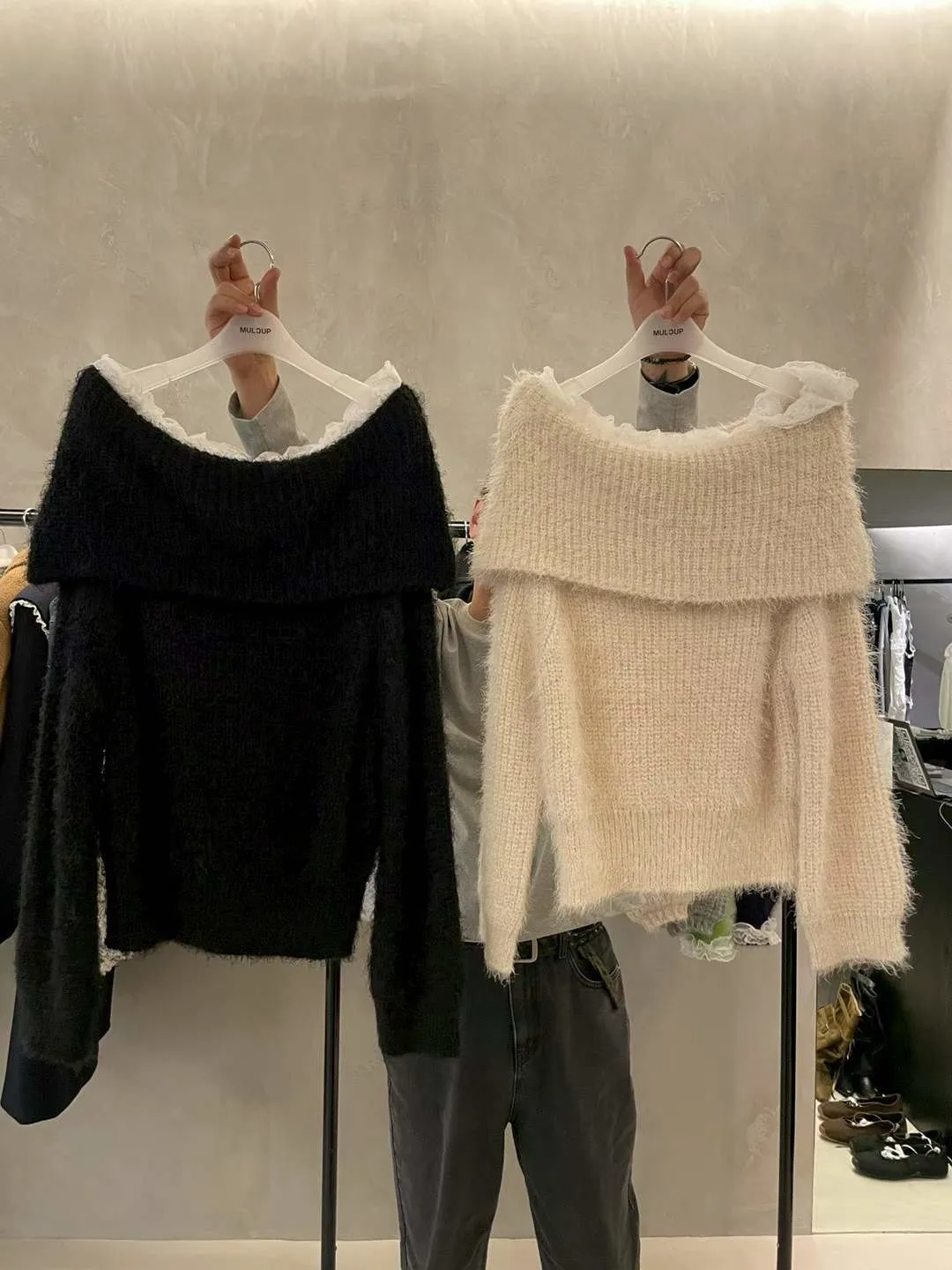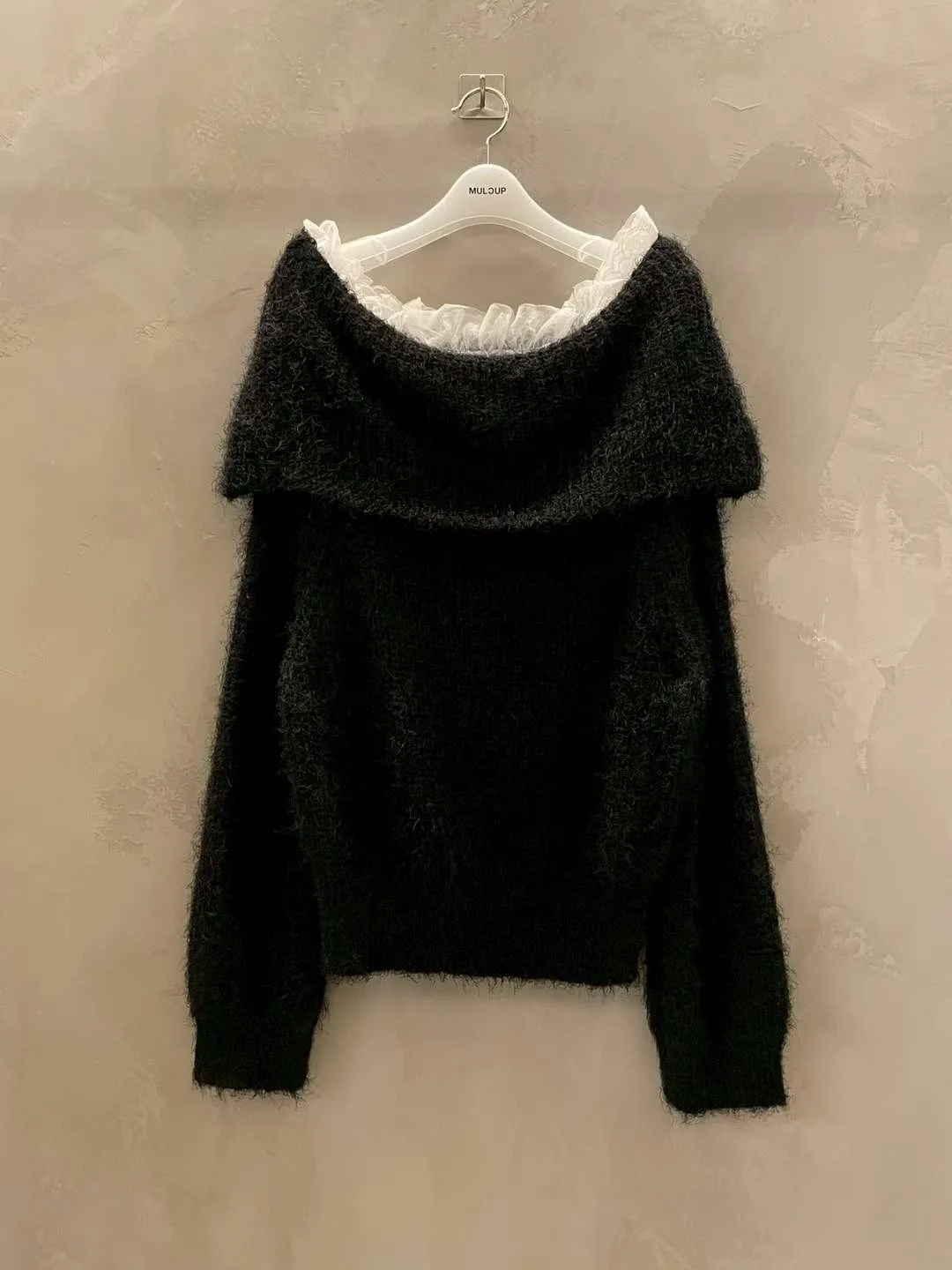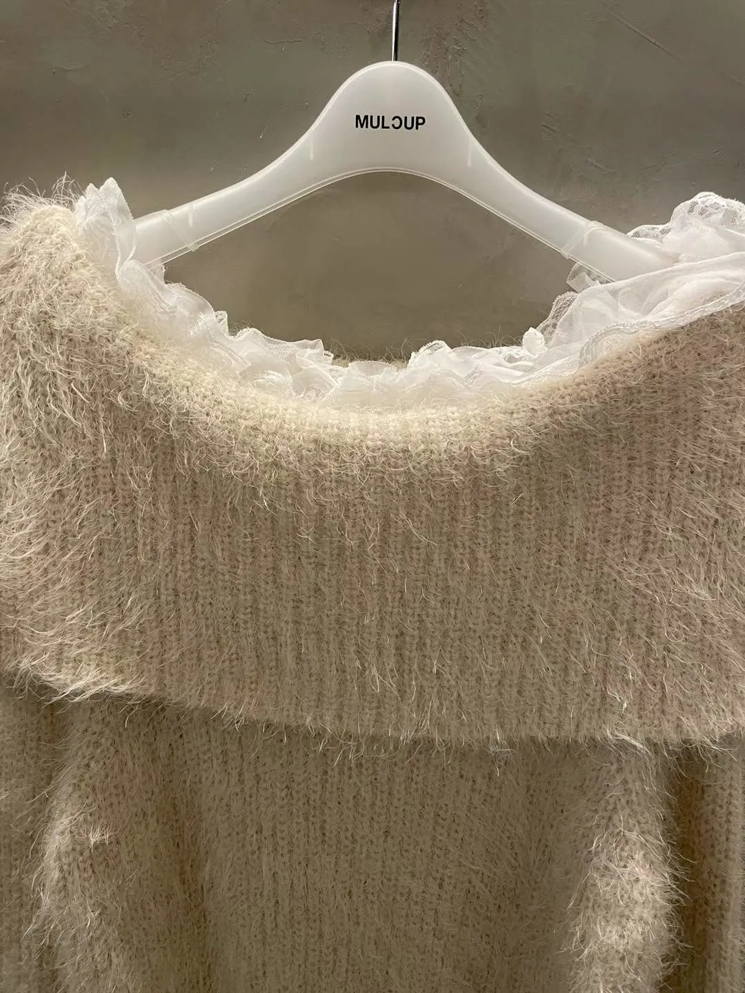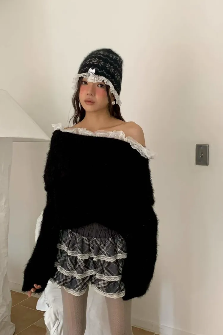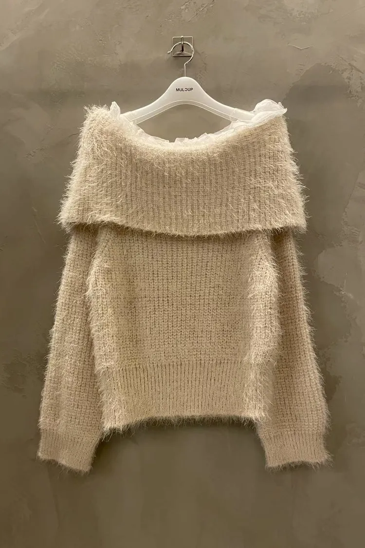 蕾絲一字領針織毛衣