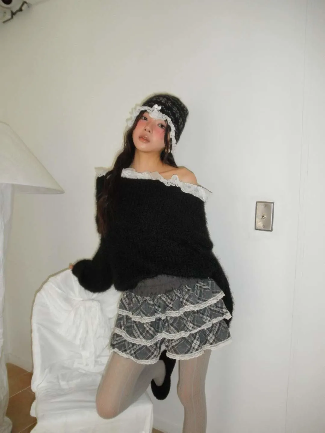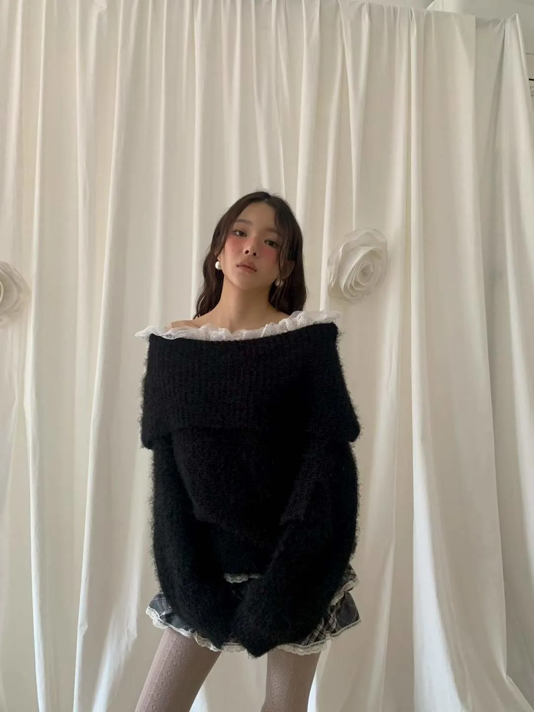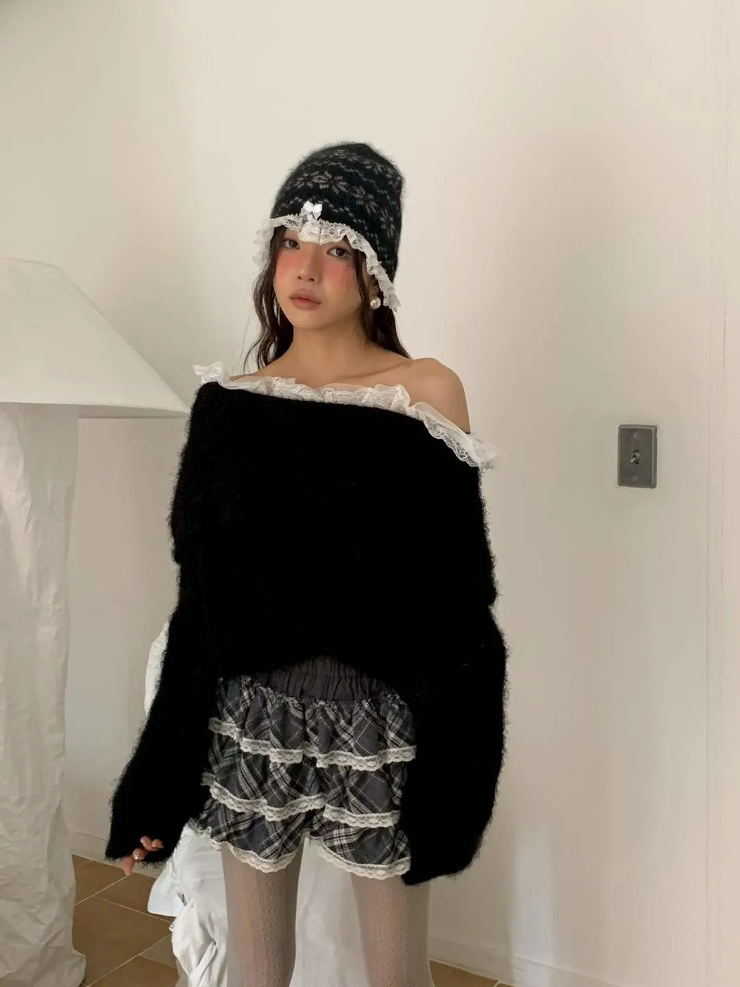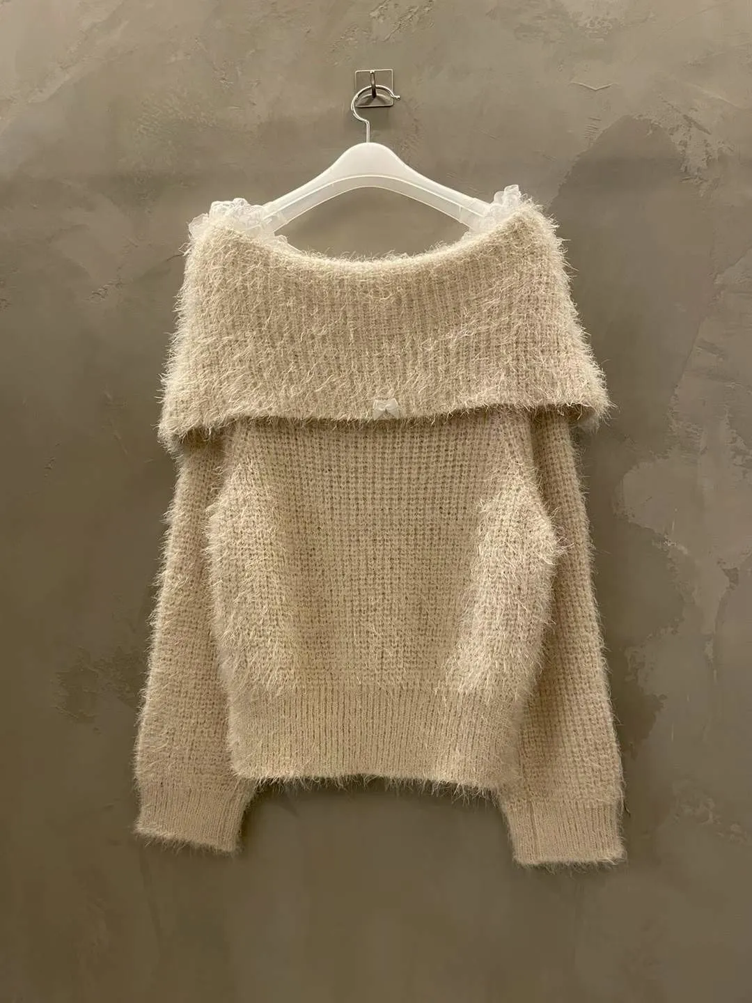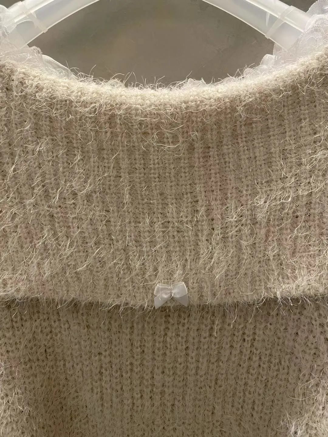 蕾絲一字領針織毛衣