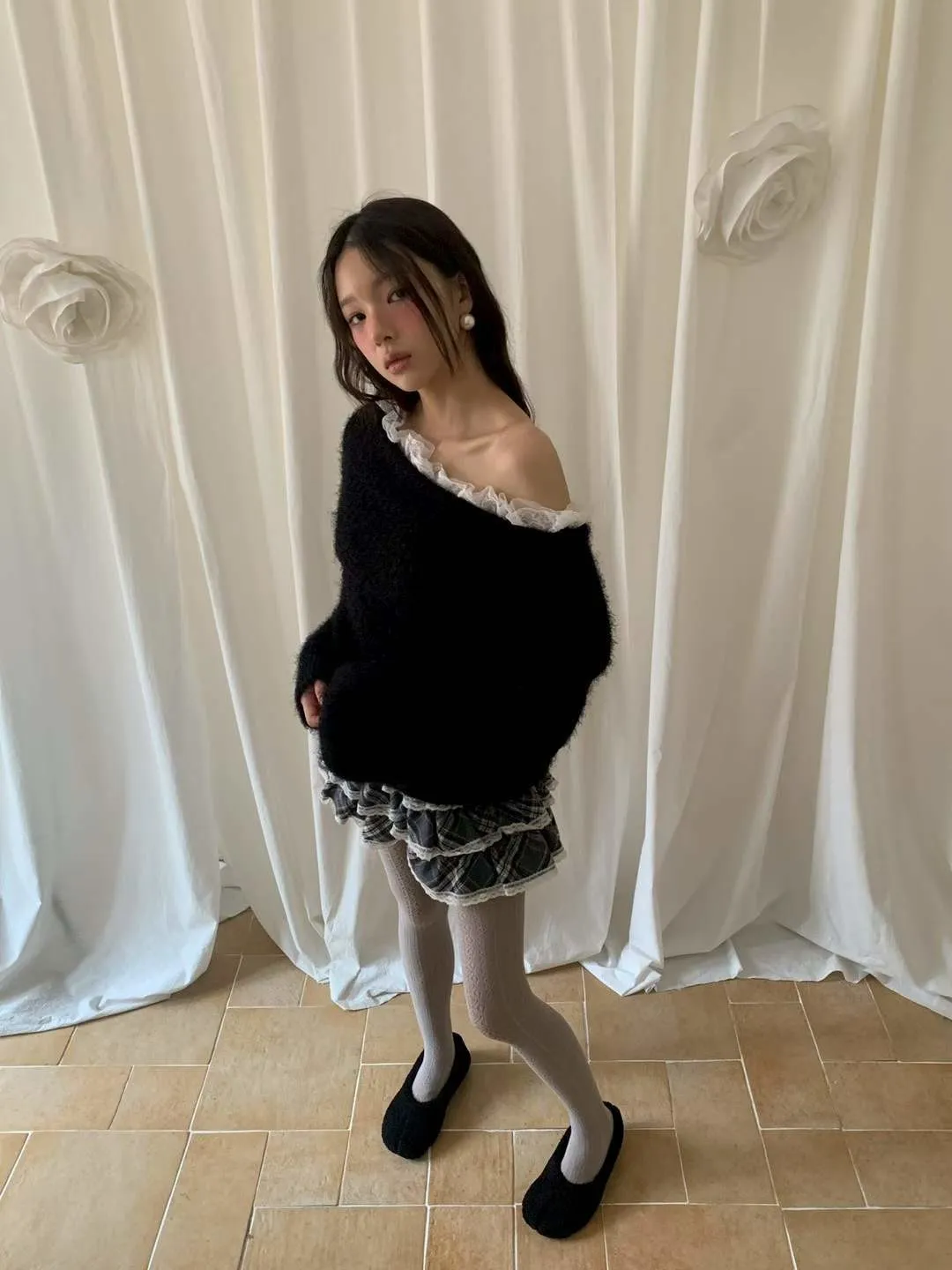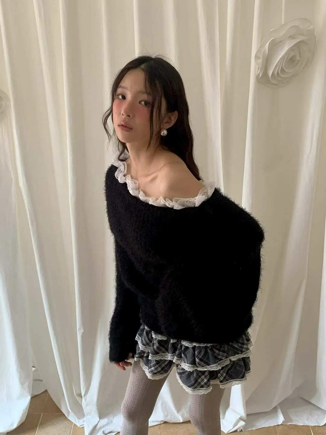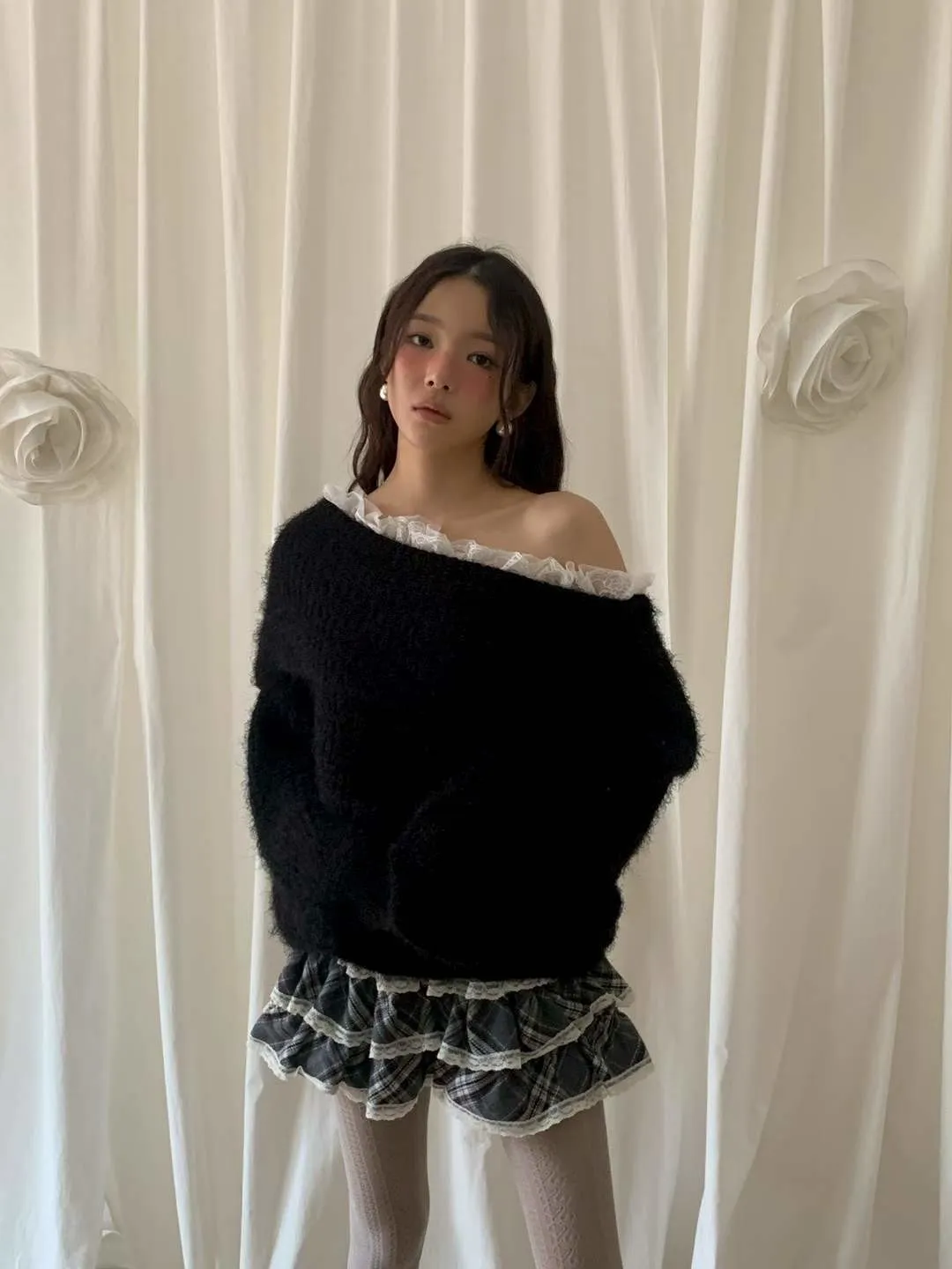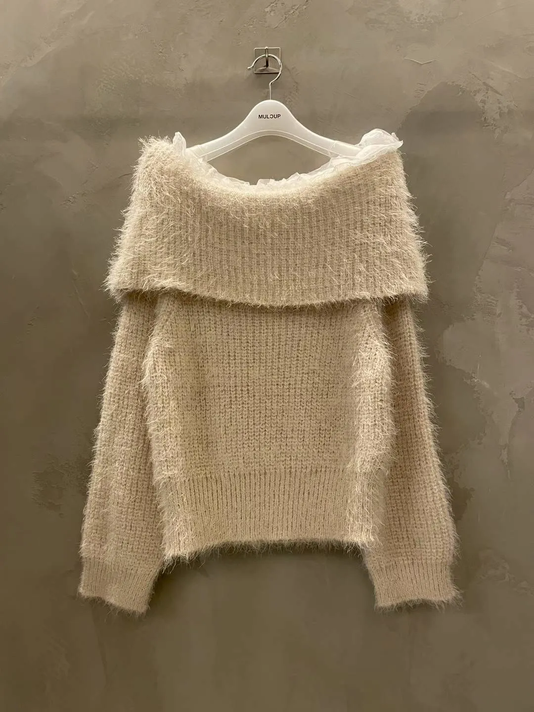 蕾絲一字領針織毛衣