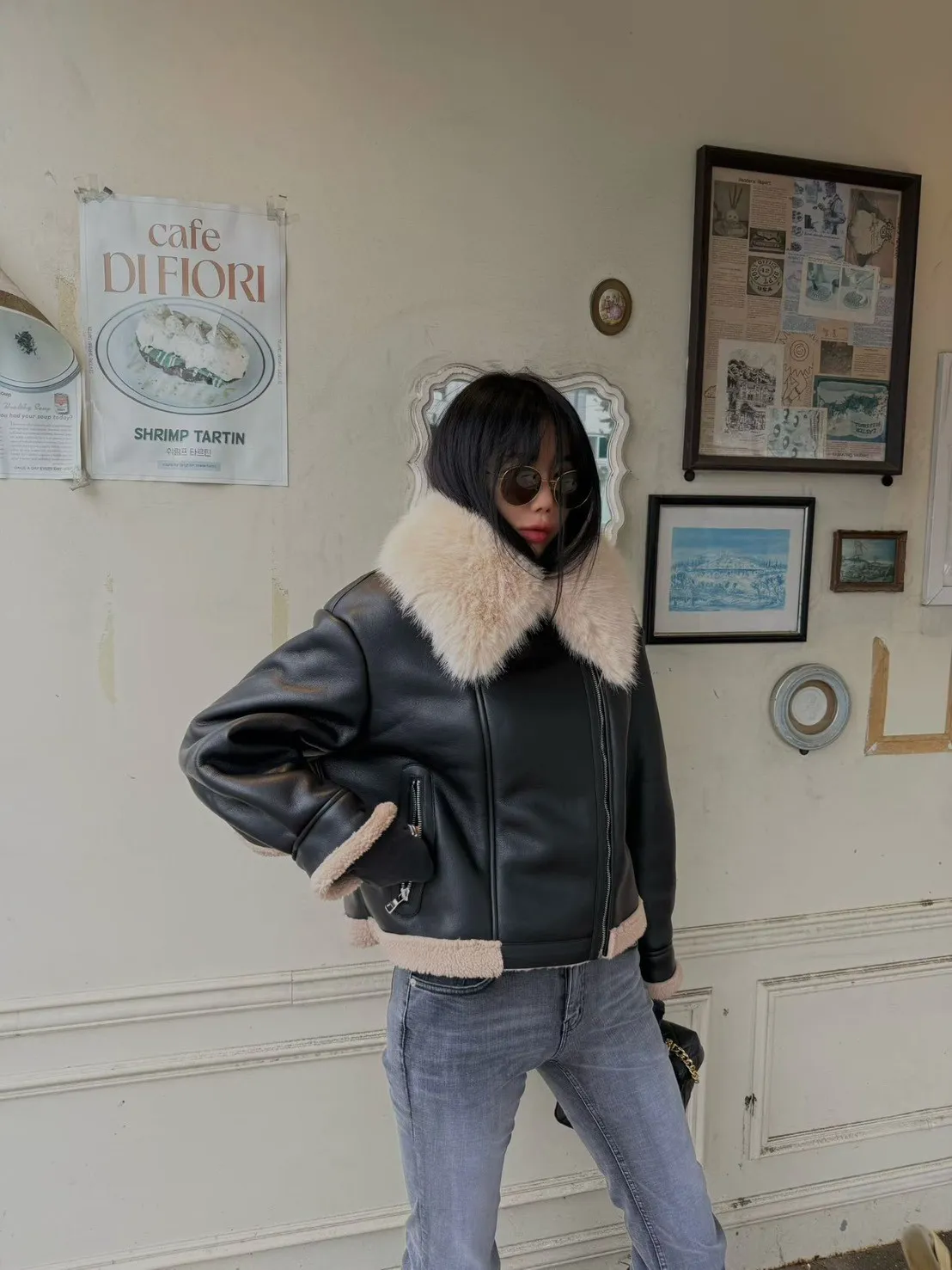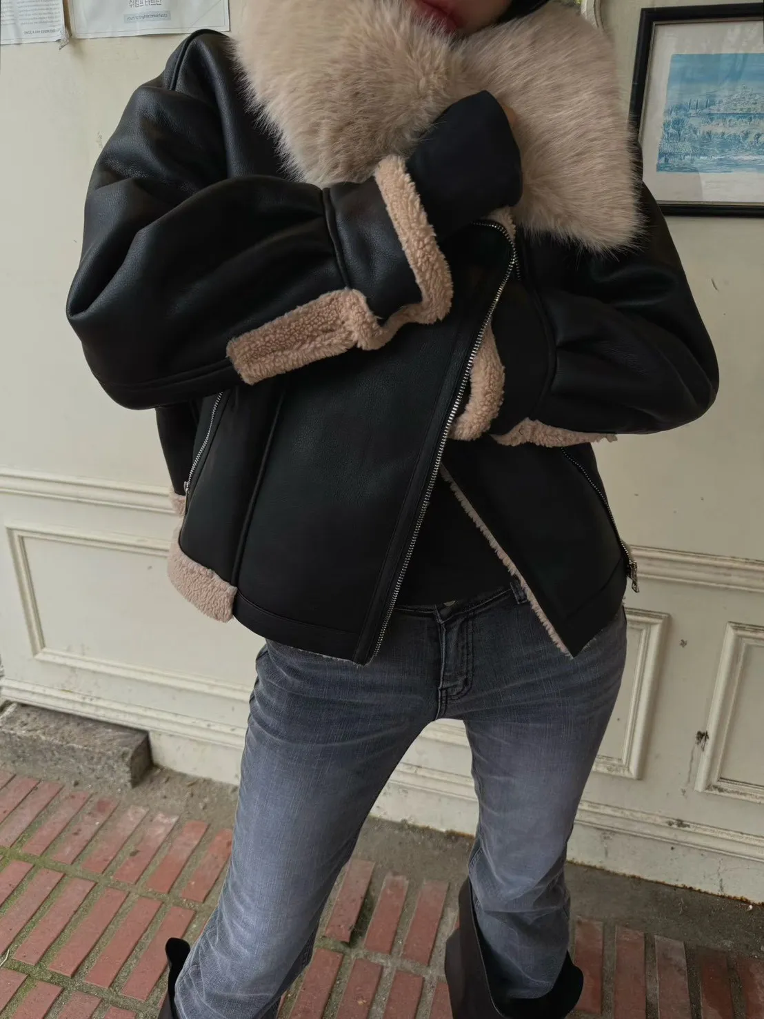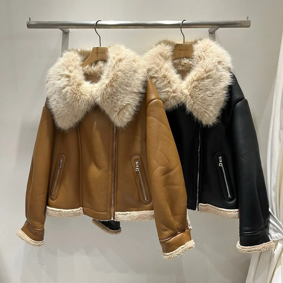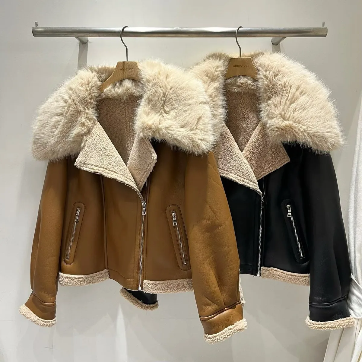 大翻領羊羔毛皮革外套