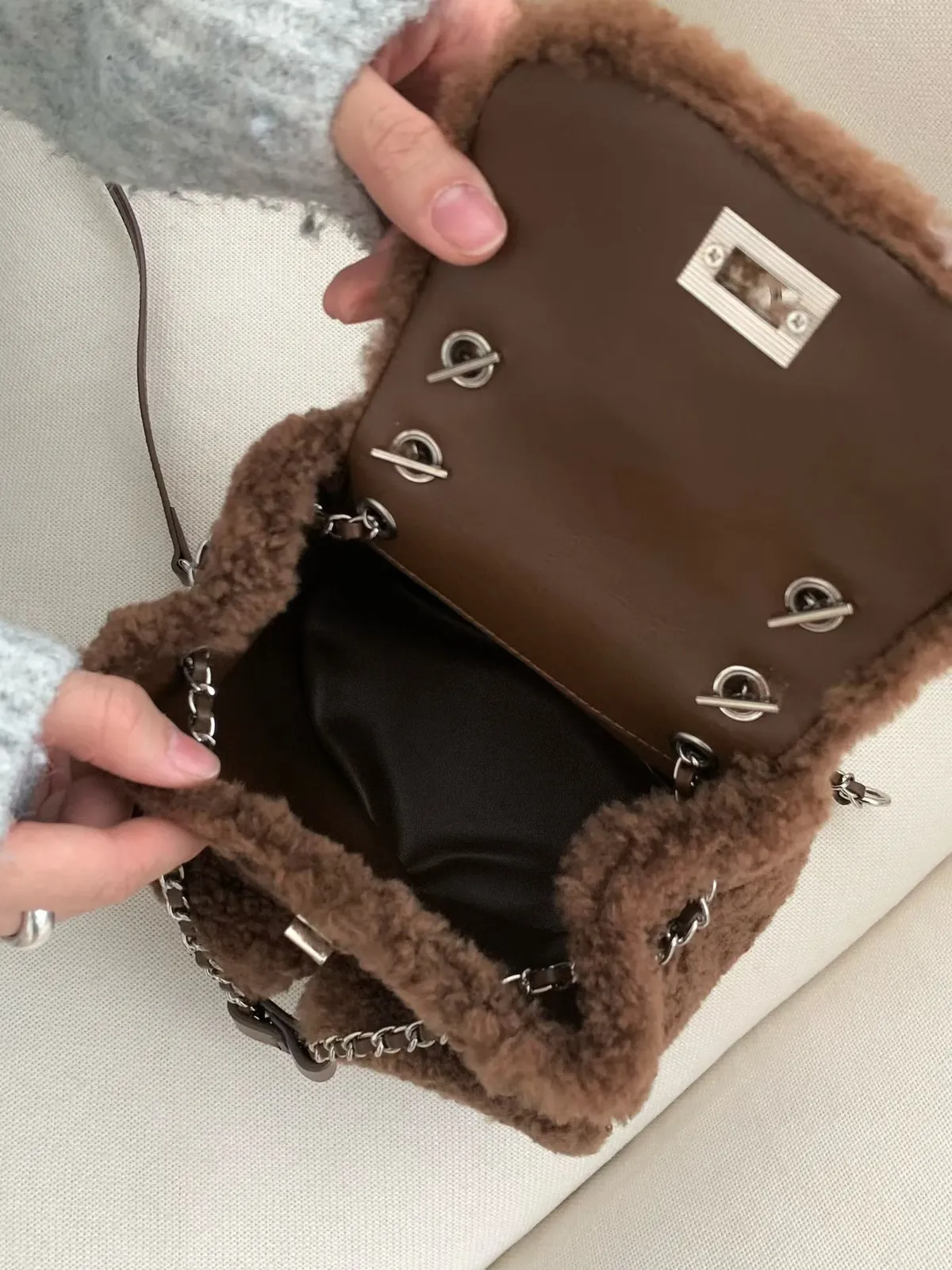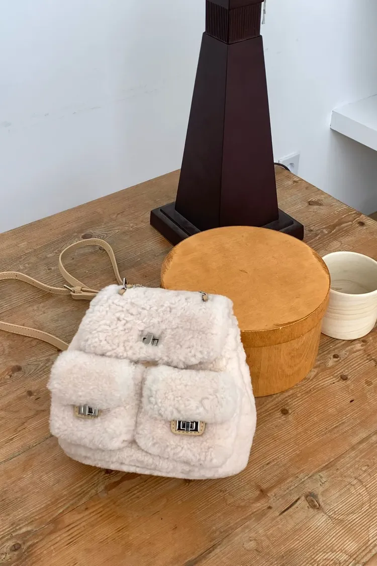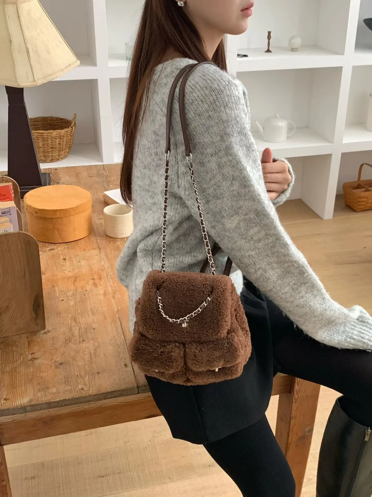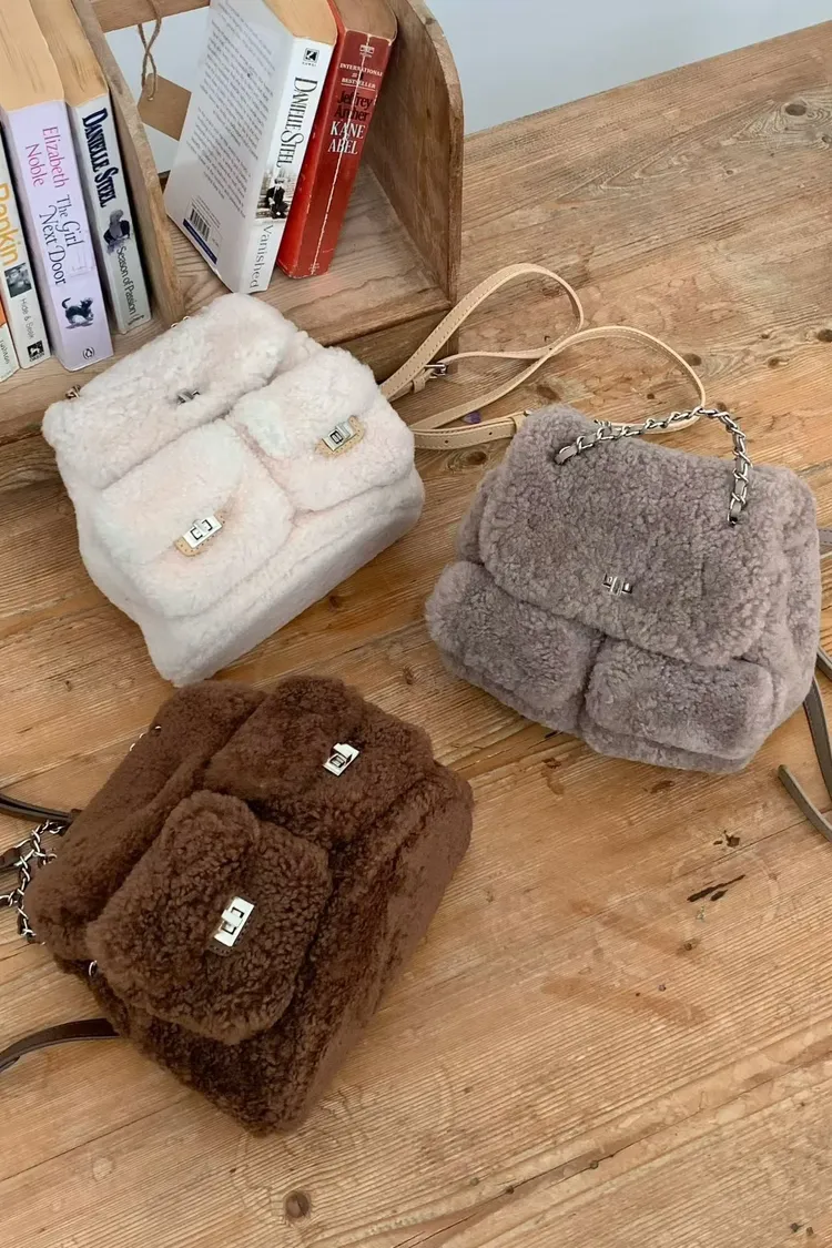 毛茸茸雙口袋翻蓋鏈條雙肩包