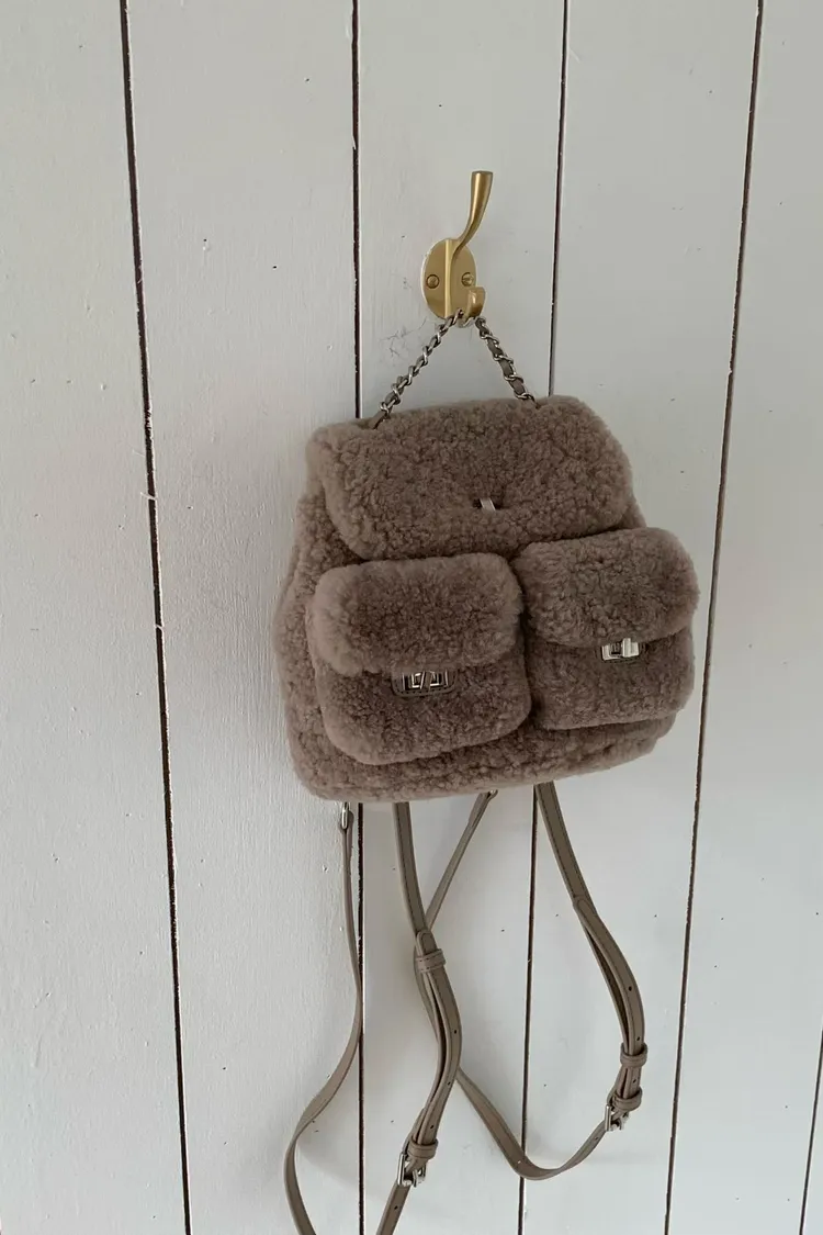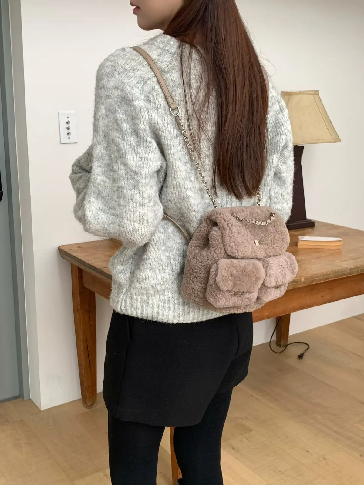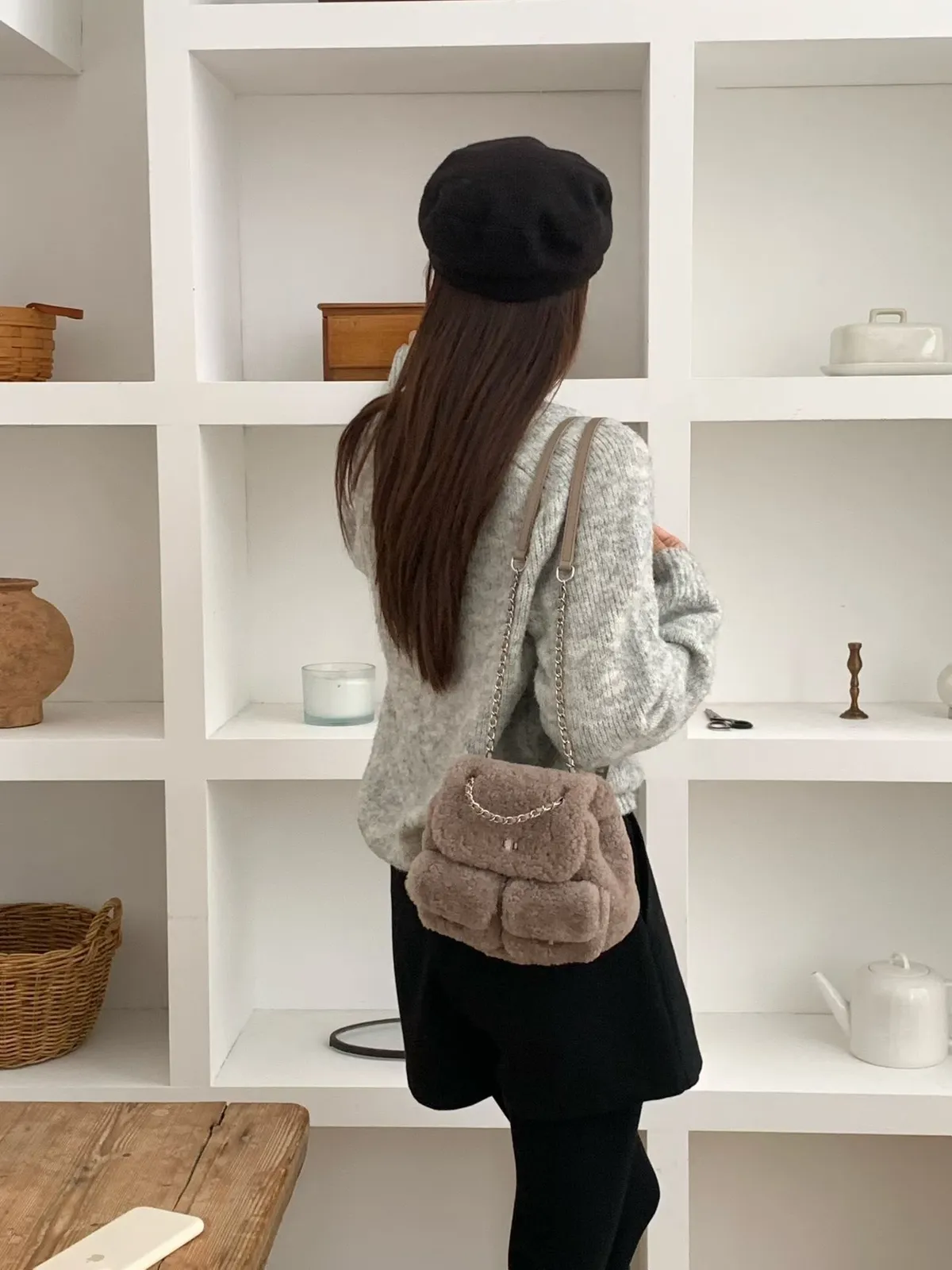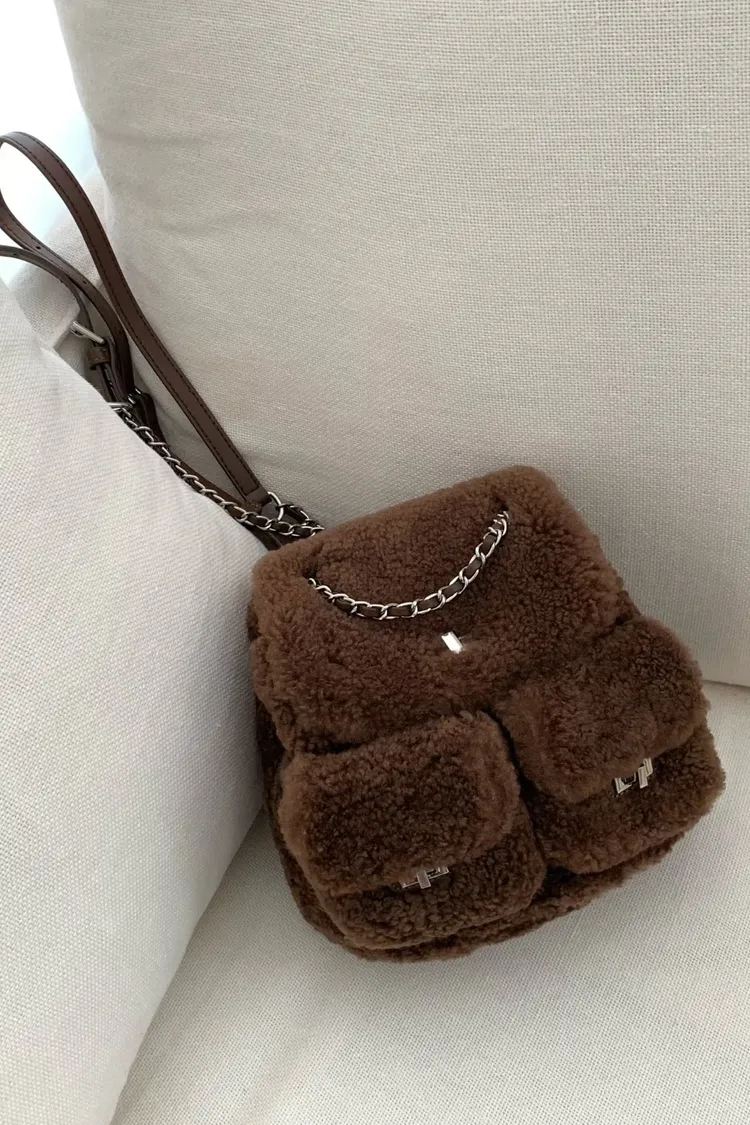 毛茸茸雙口袋翻蓋鏈條雙肩包