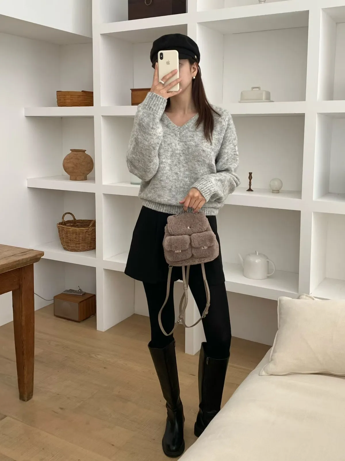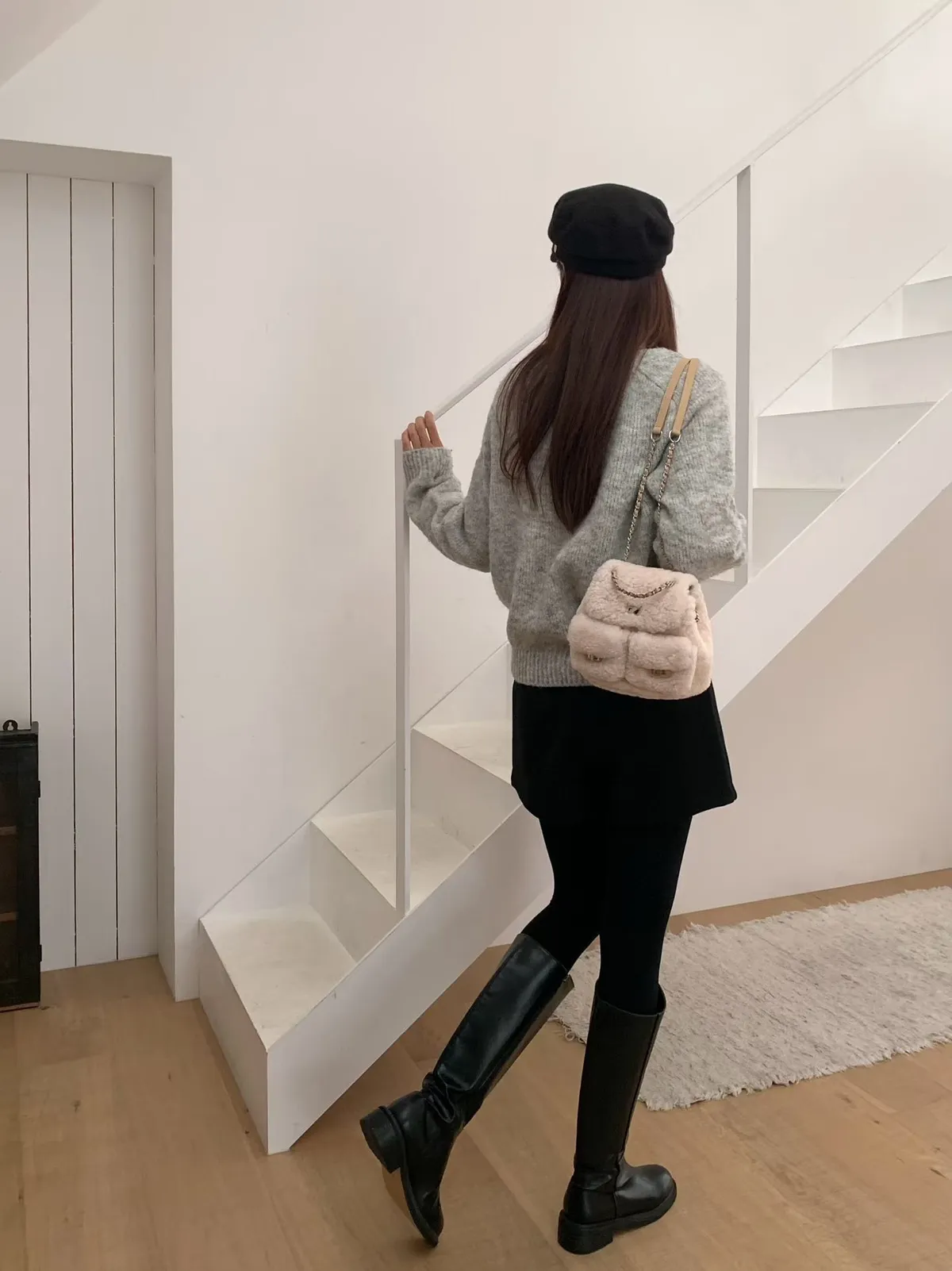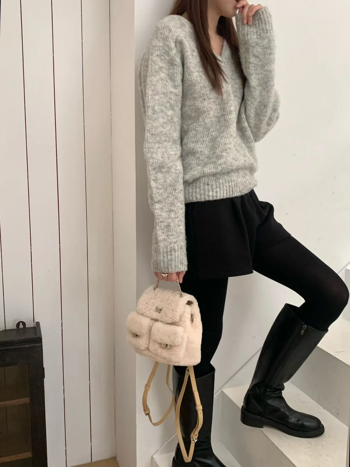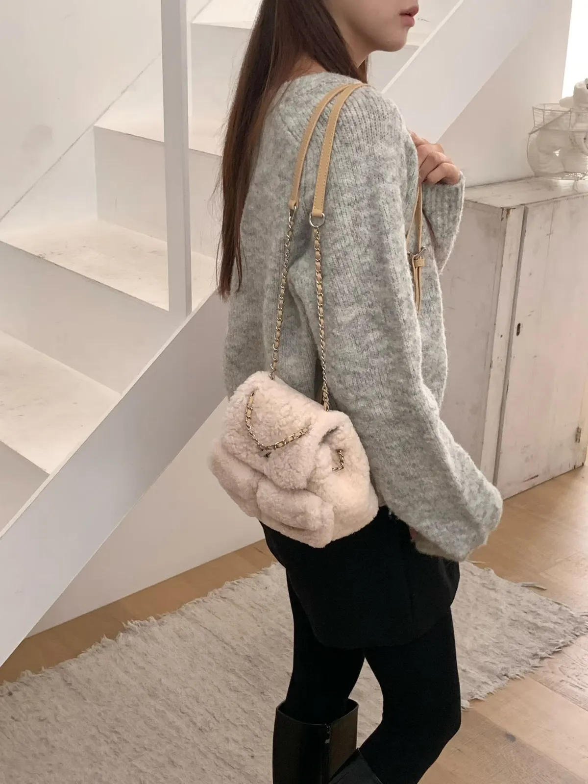 毛茸茸雙口袋翻蓋鏈條雙肩包