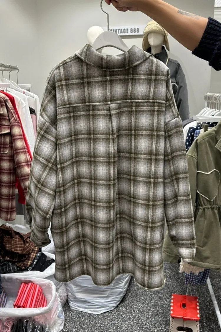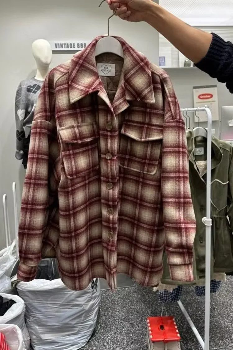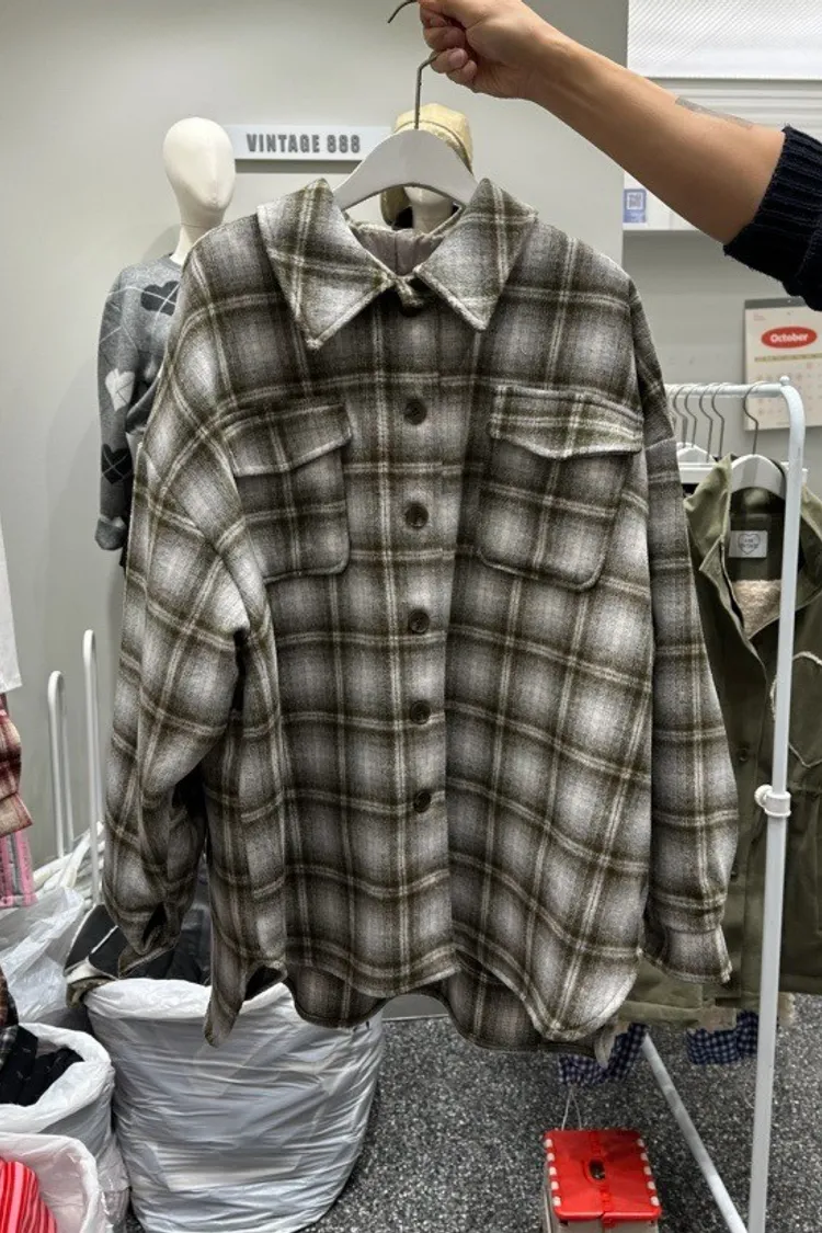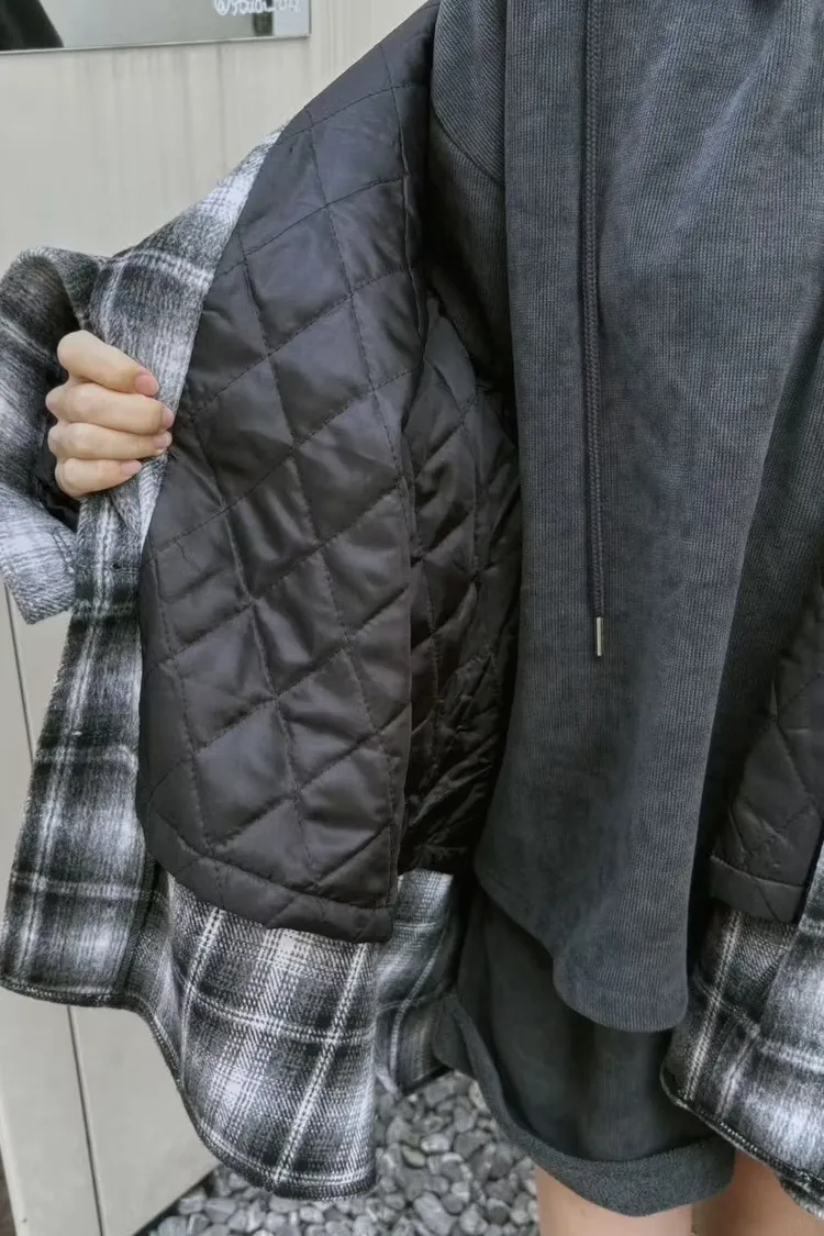 厚鋪棉復古感寬鬆格紋外套襯衫