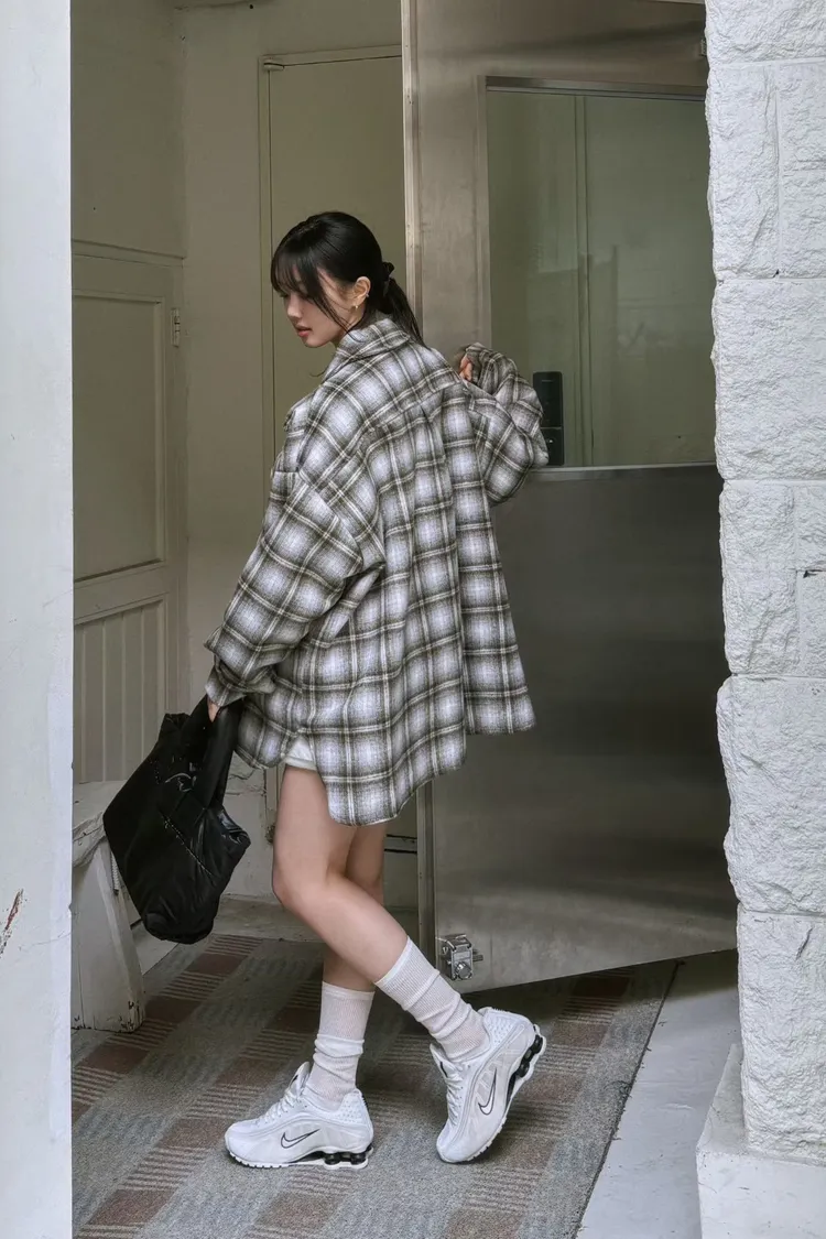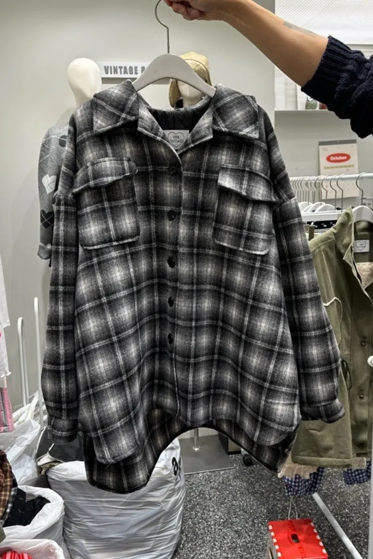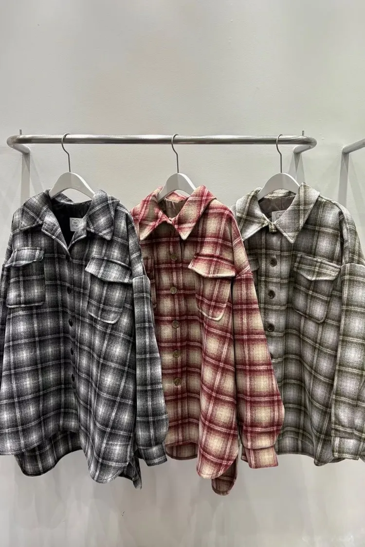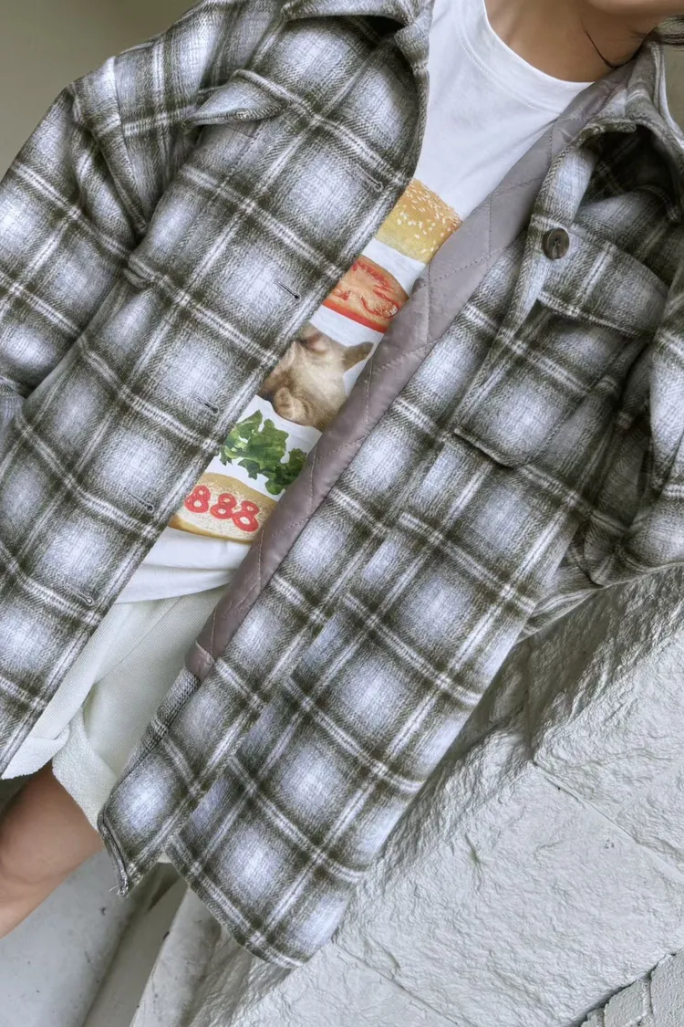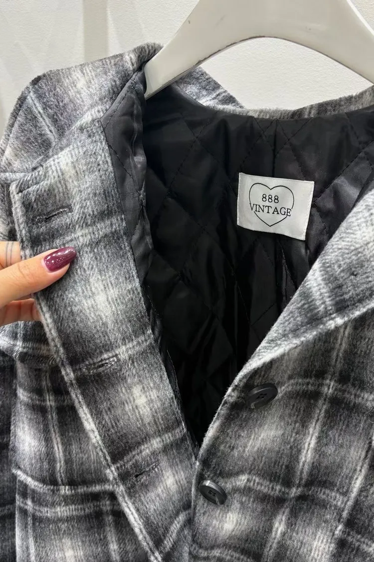 厚鋪棉復古感寬鬆格紋外套襯衫