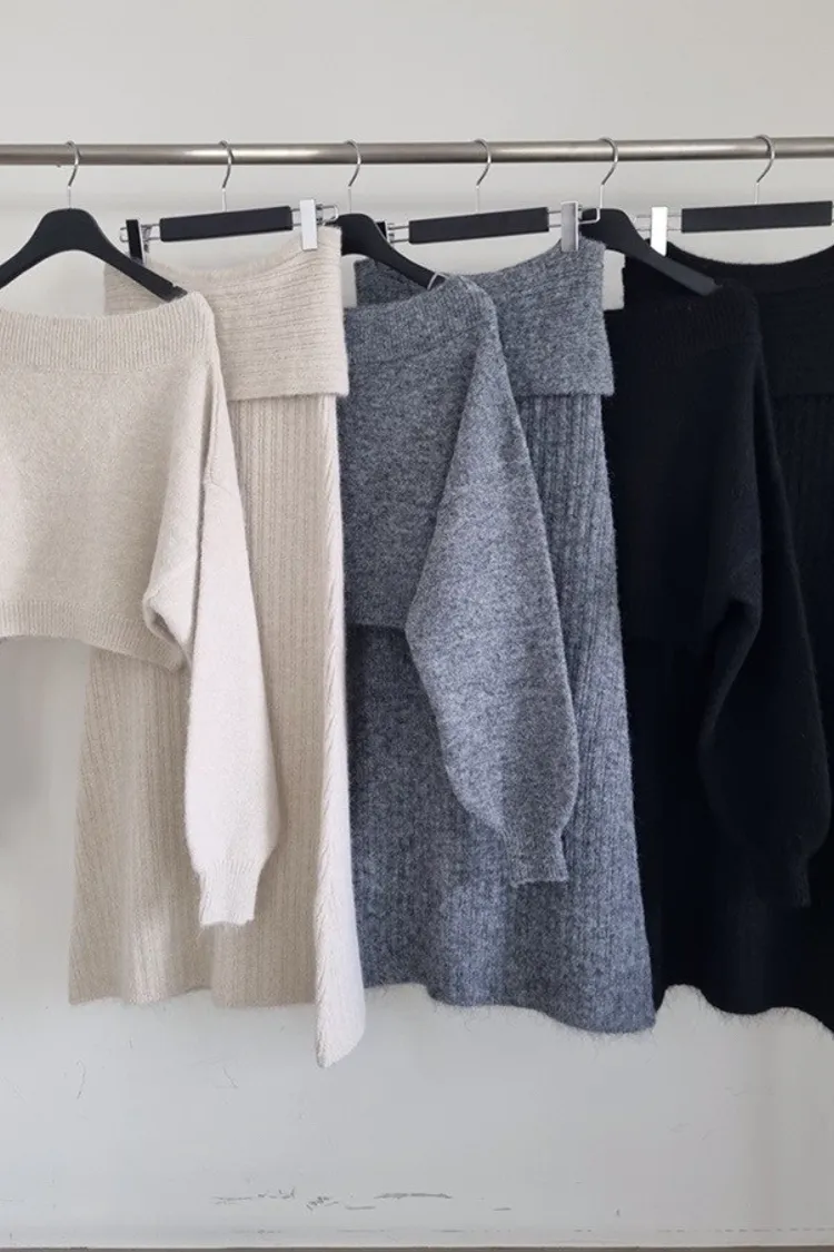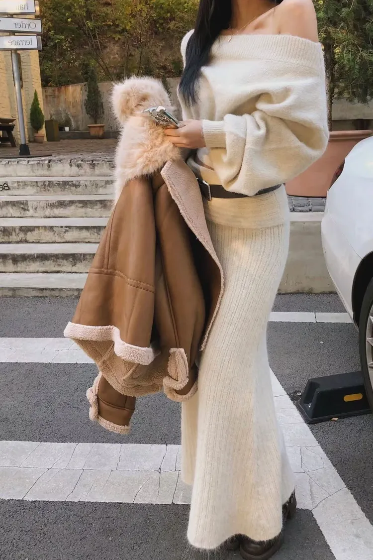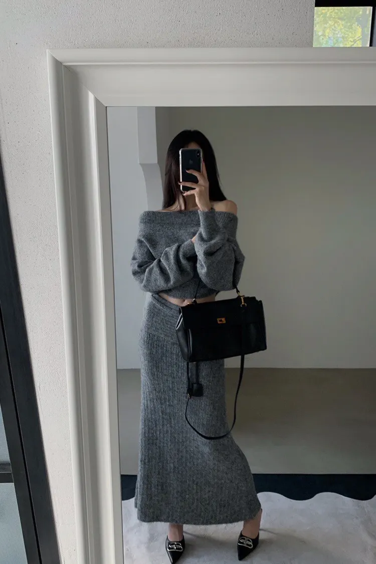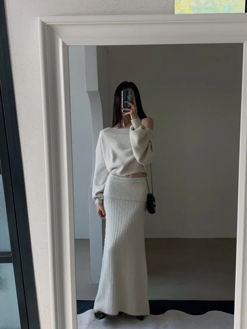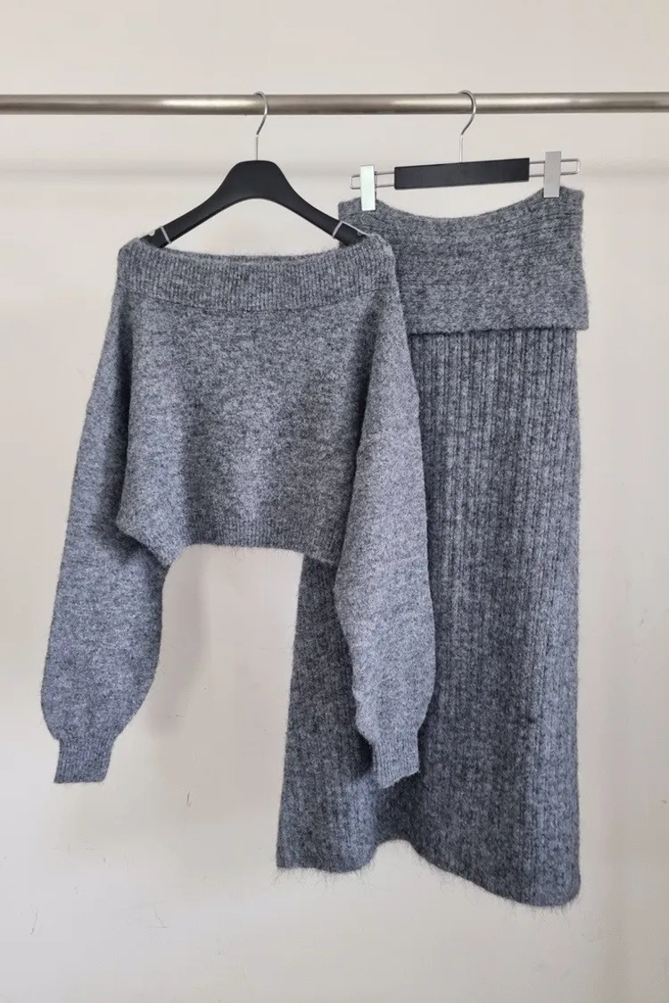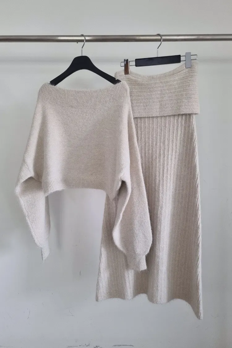 羊毛20%慵懶感一字領針織上衣+羅紋長裙套裝