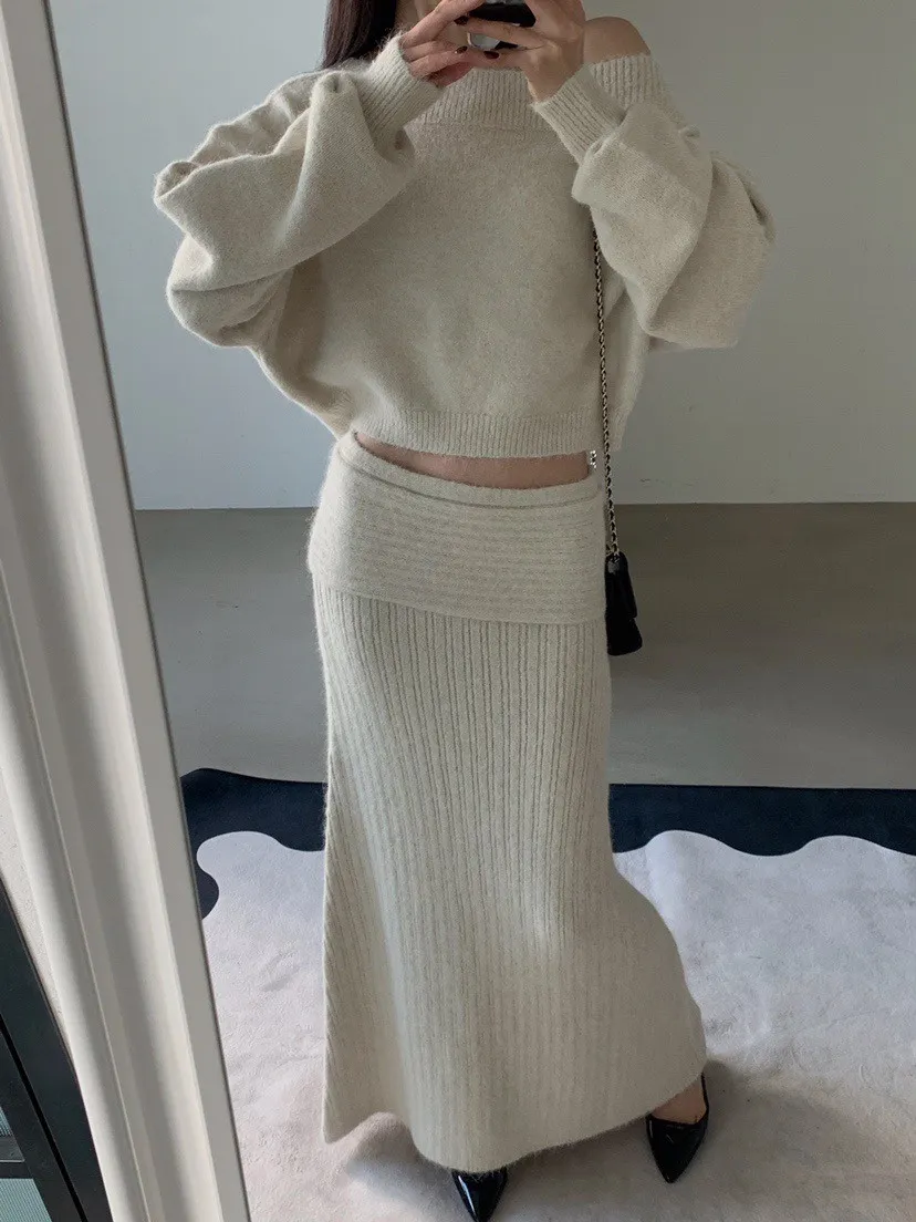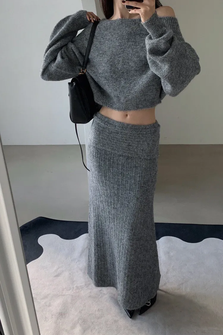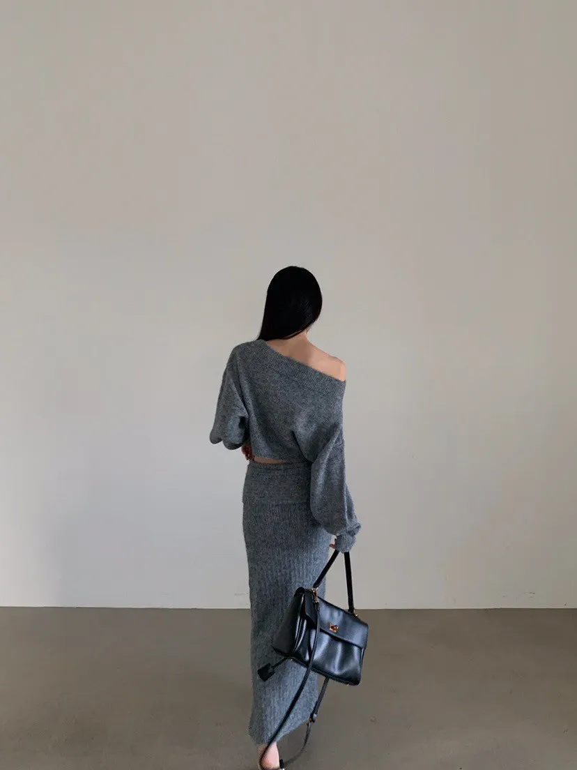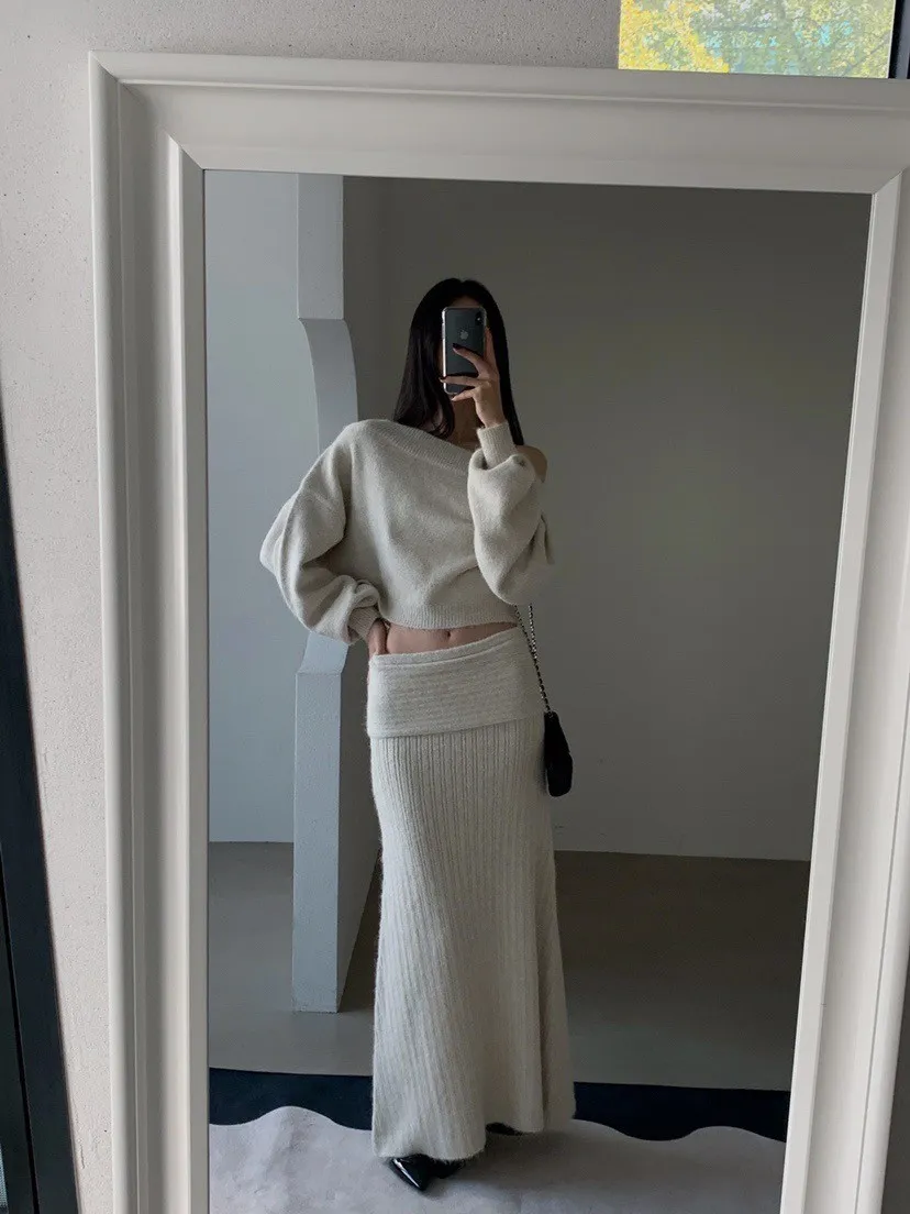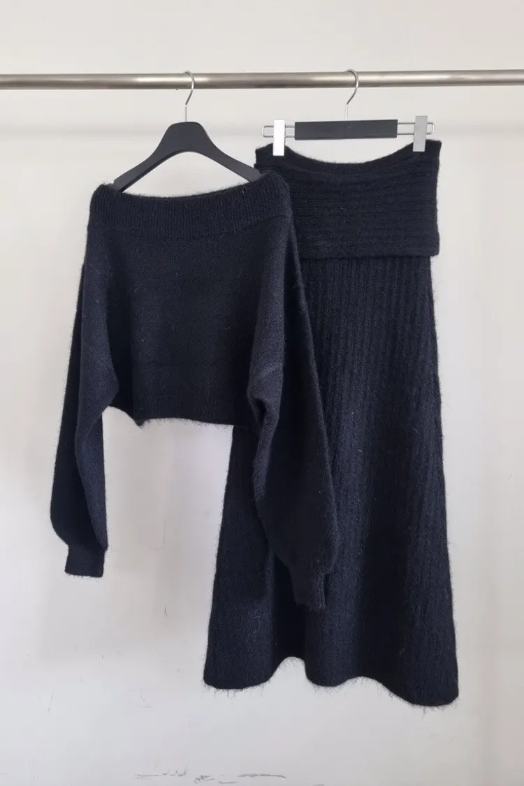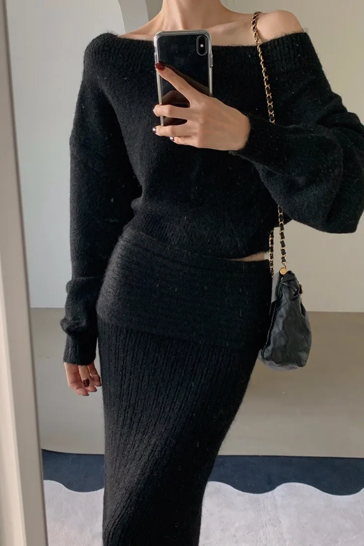 羊毛20%慵懶感一字領針織上衣+羅紋長裙套裝