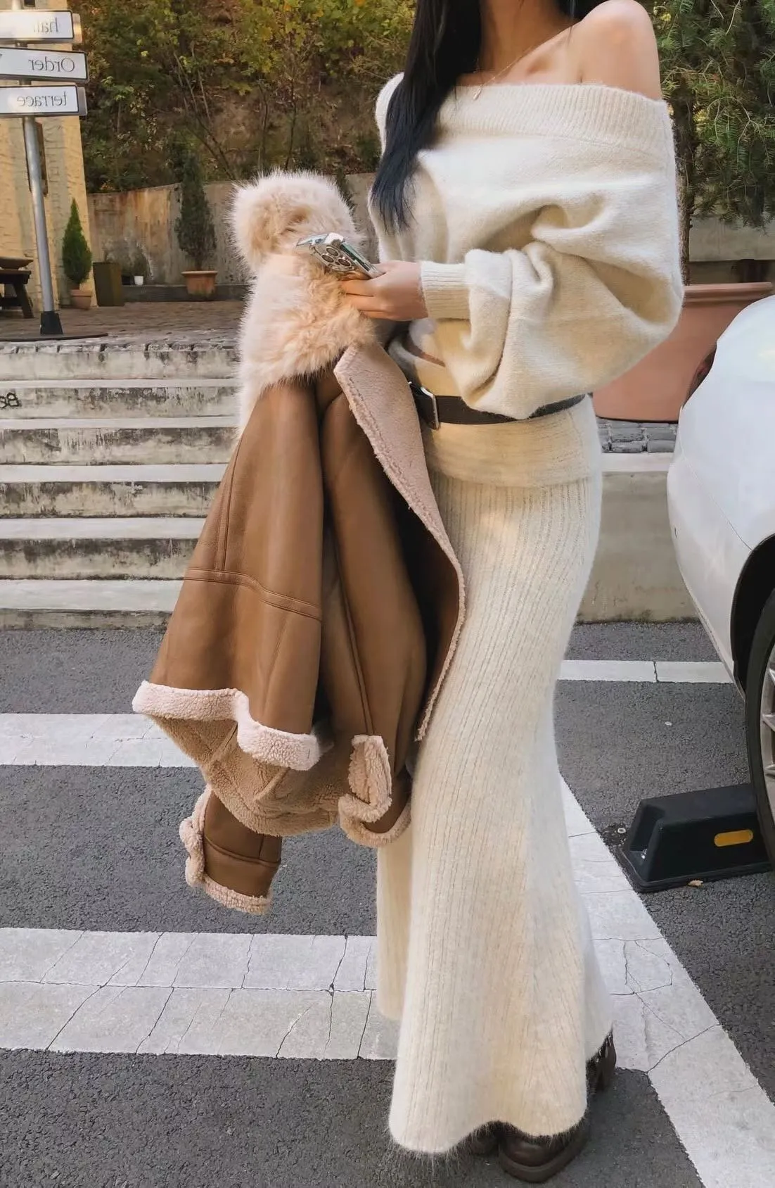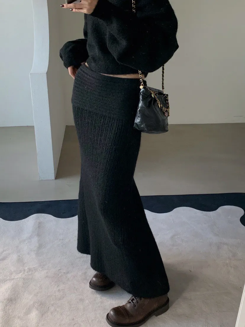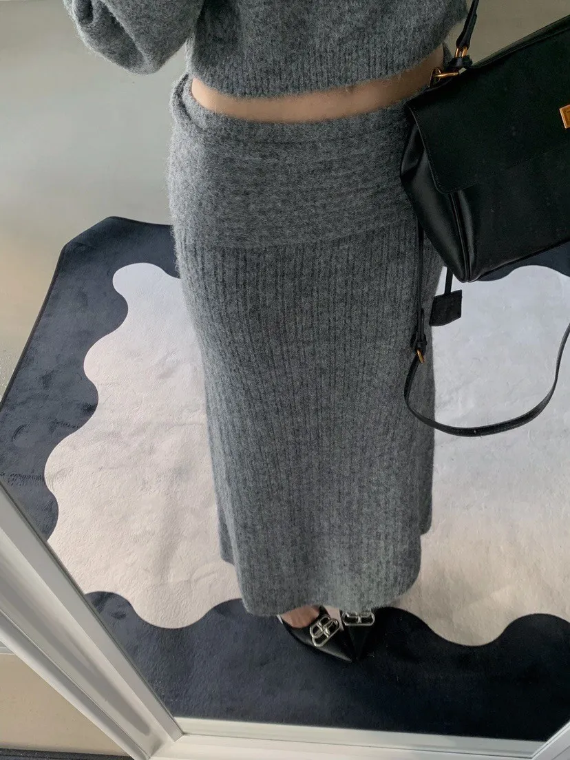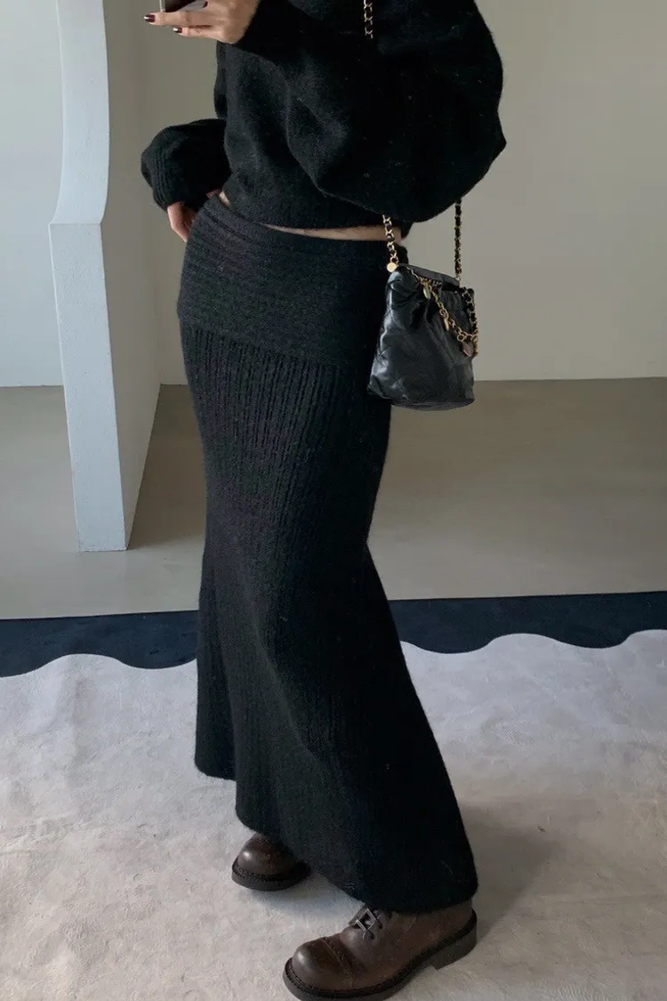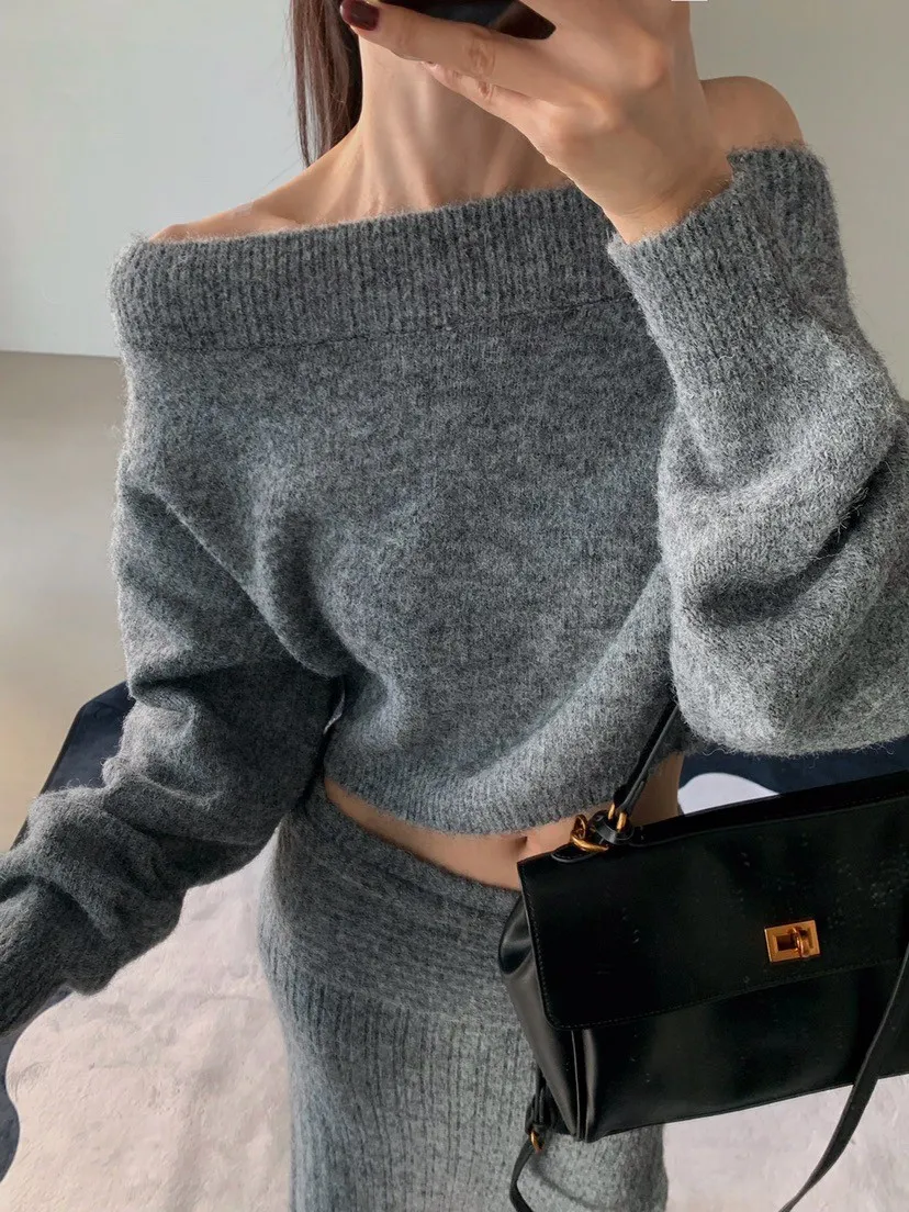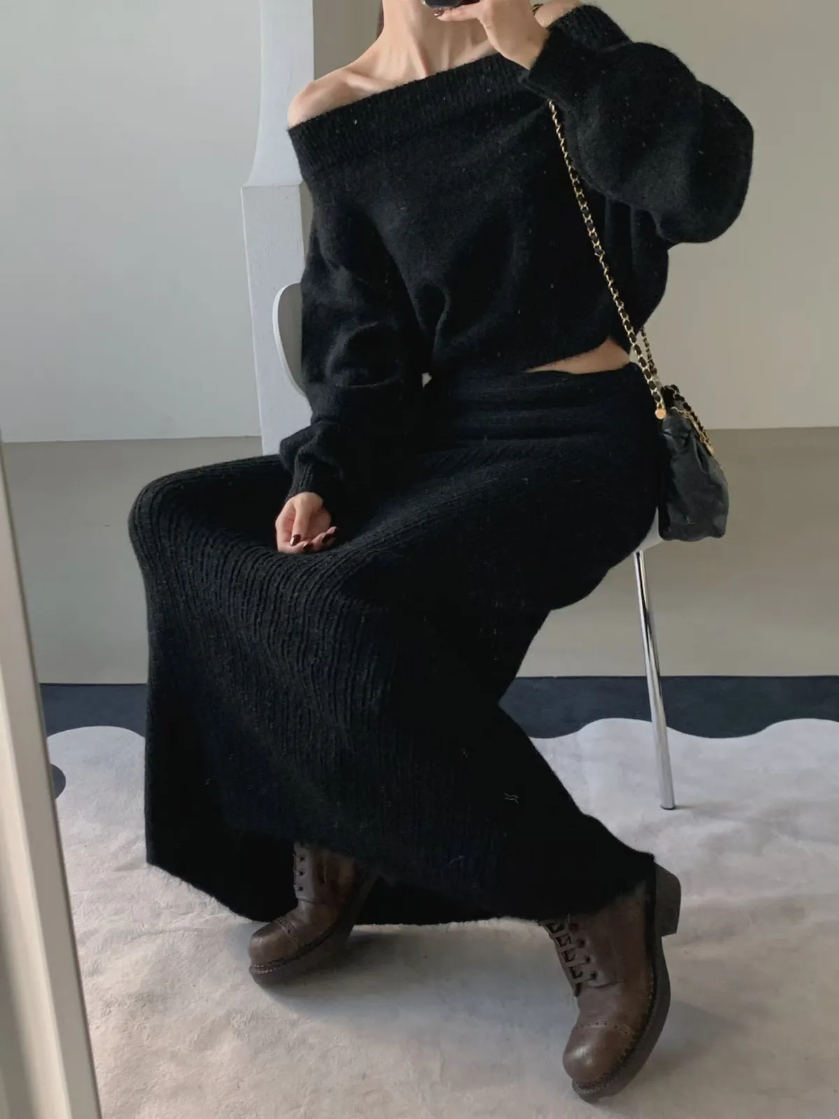 羊毛20%慵懶感一字領針織上衣+羅紋長裙套裝