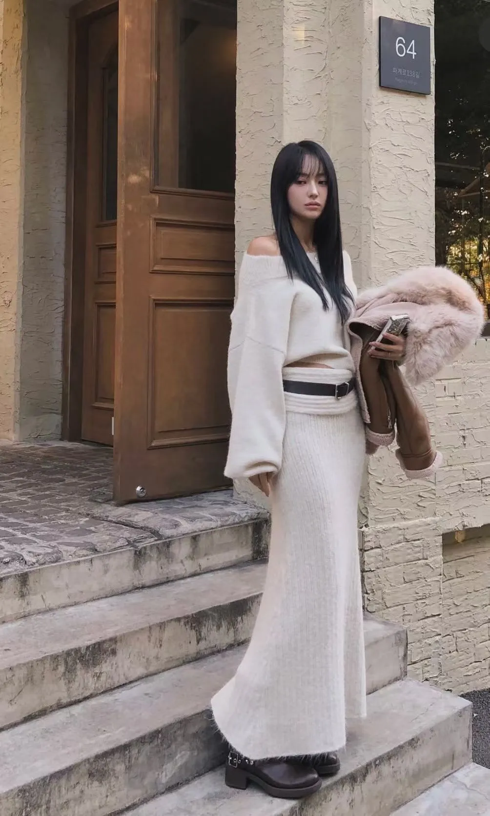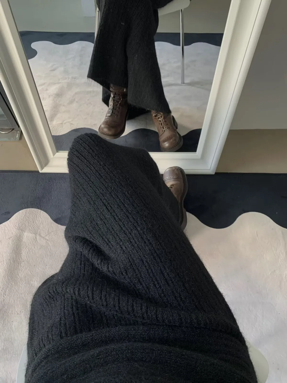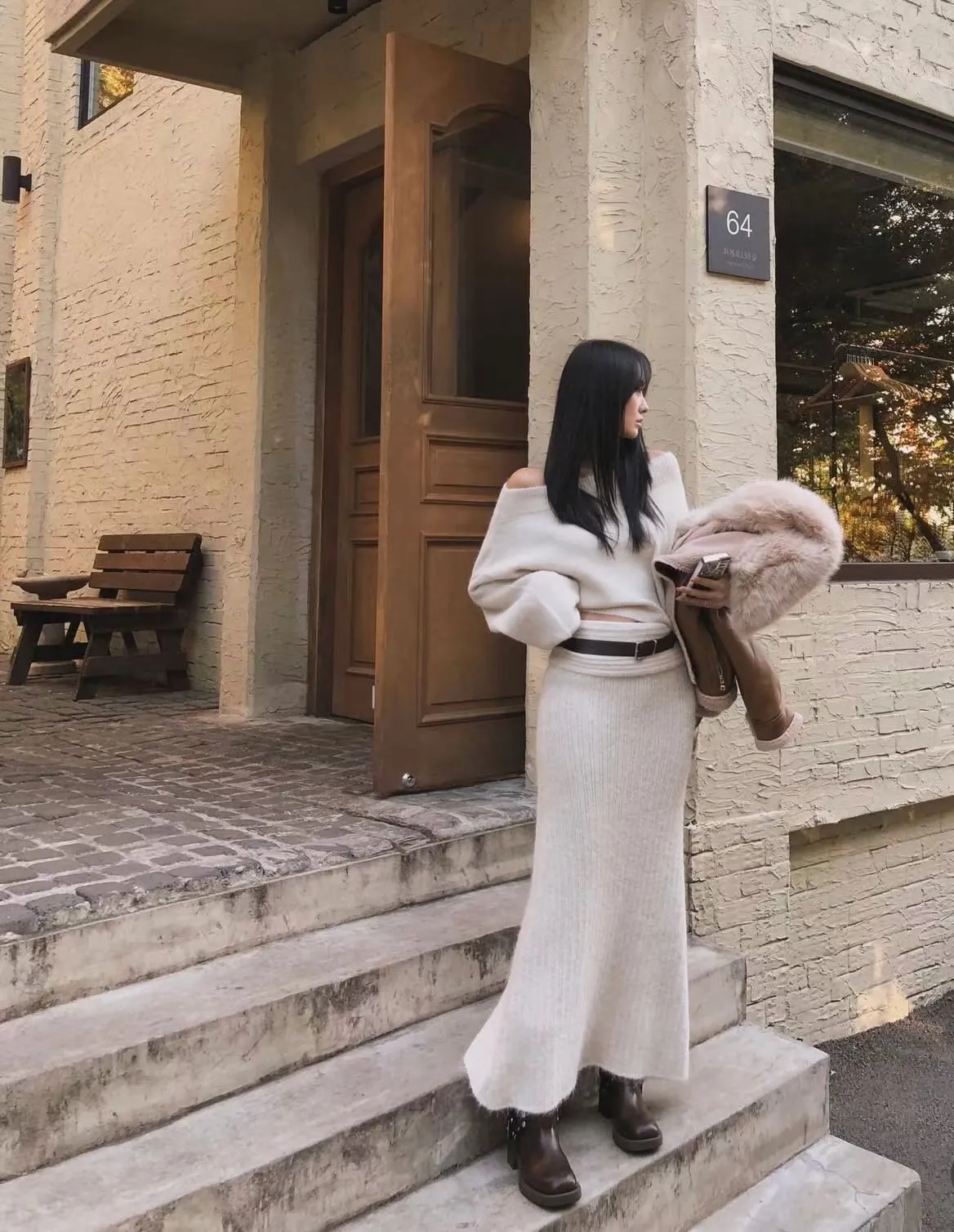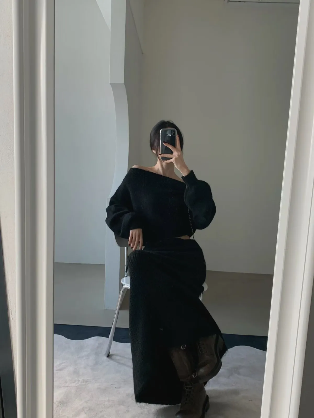 羊毛20%慵懶感一字領針織上衣+羅紋長裙套裝