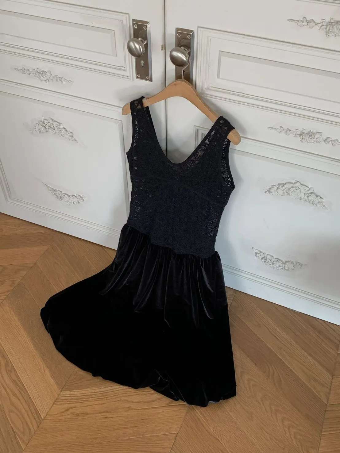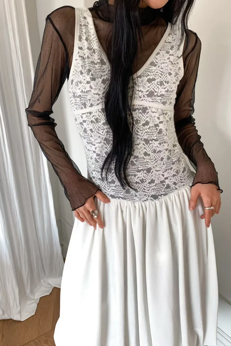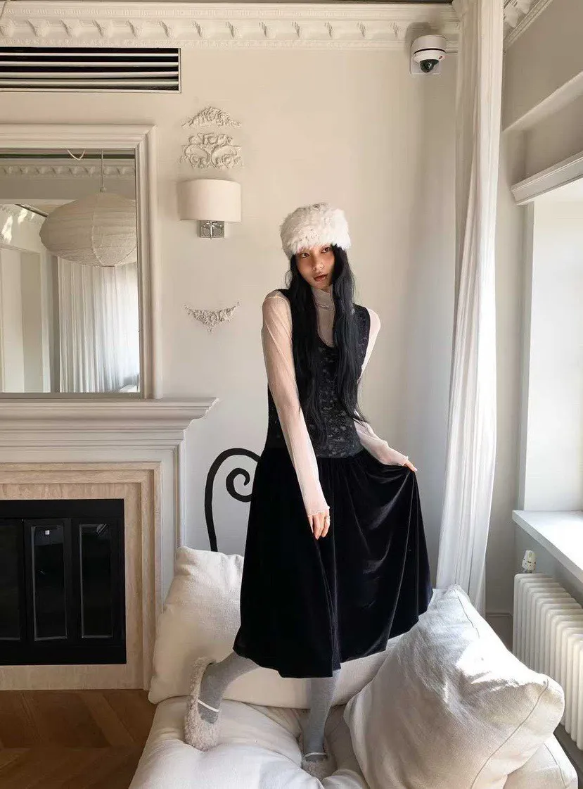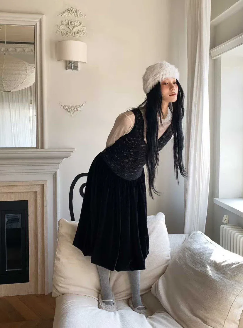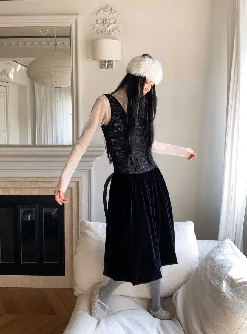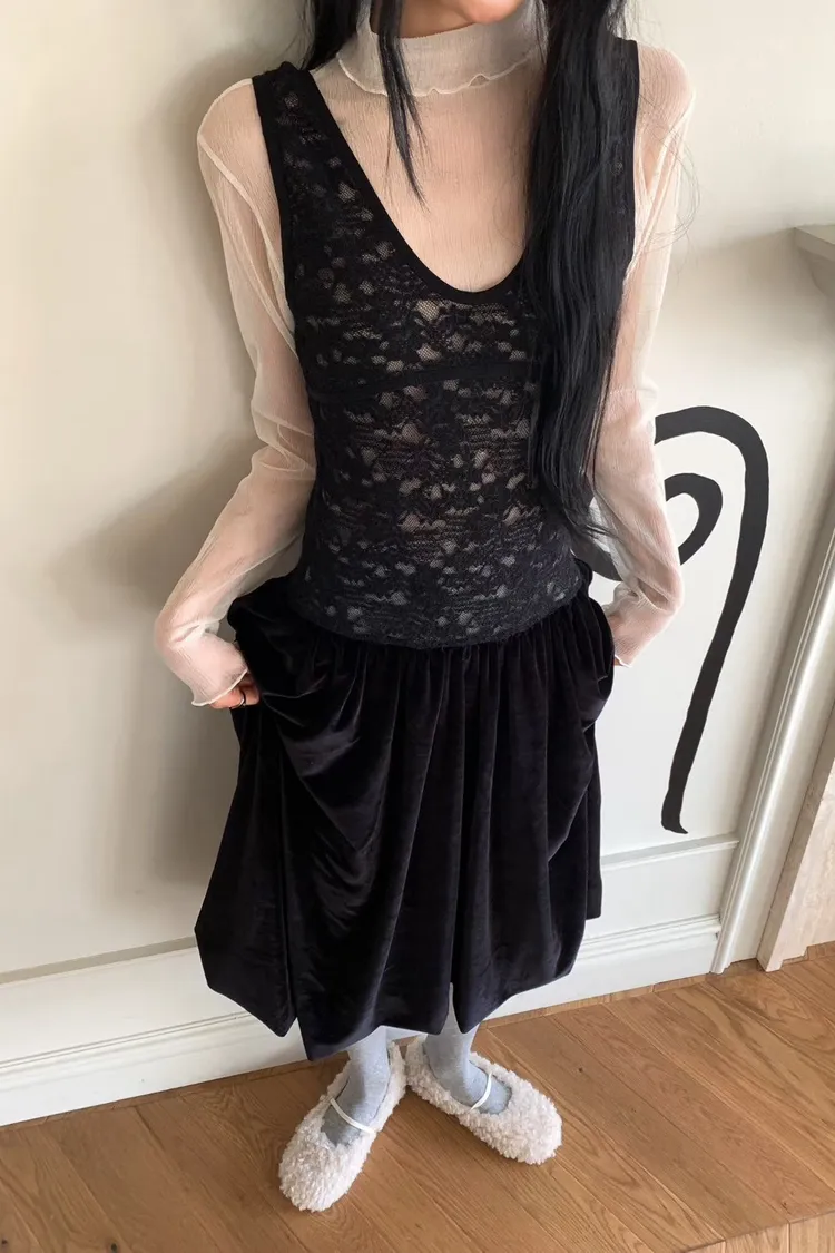 絨感蕾絲背心洋裝
