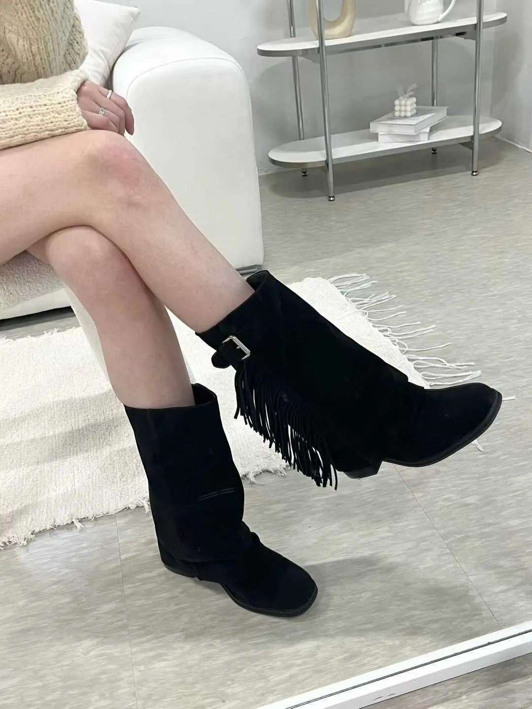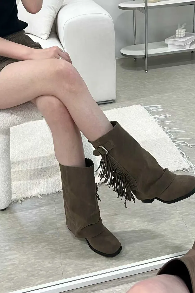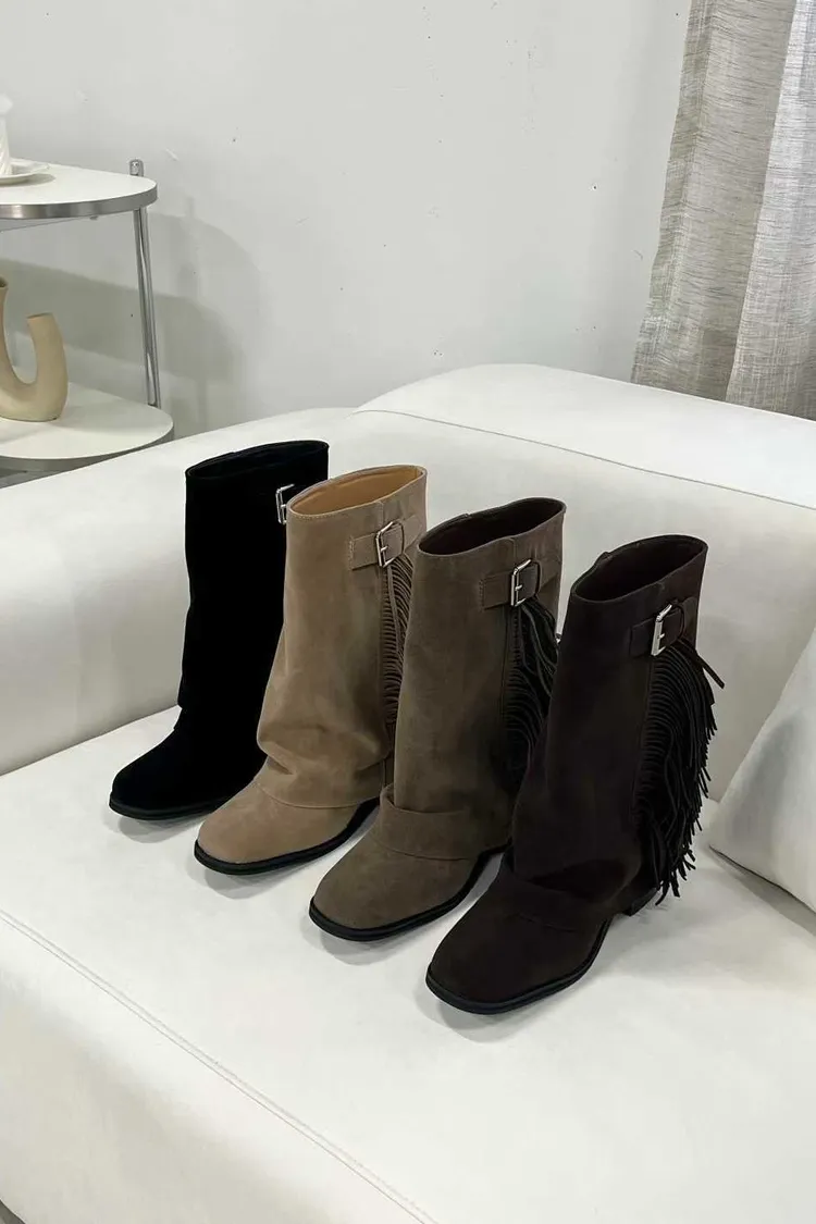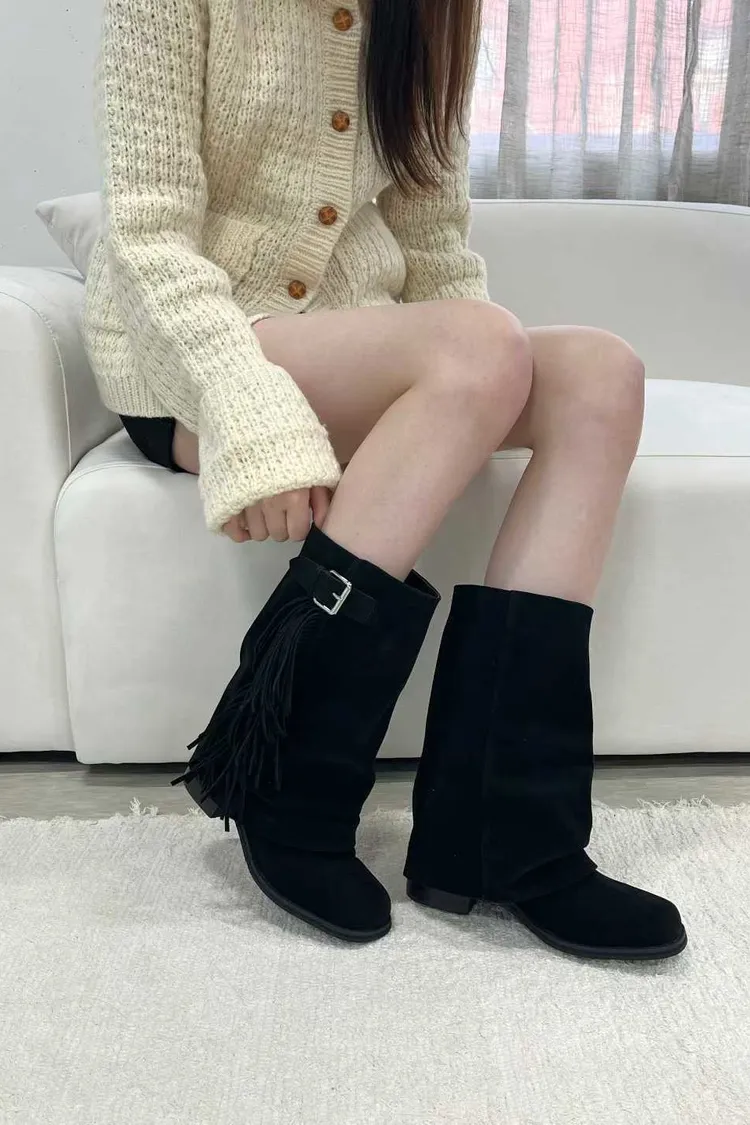 側流蘇麂皮一片靴