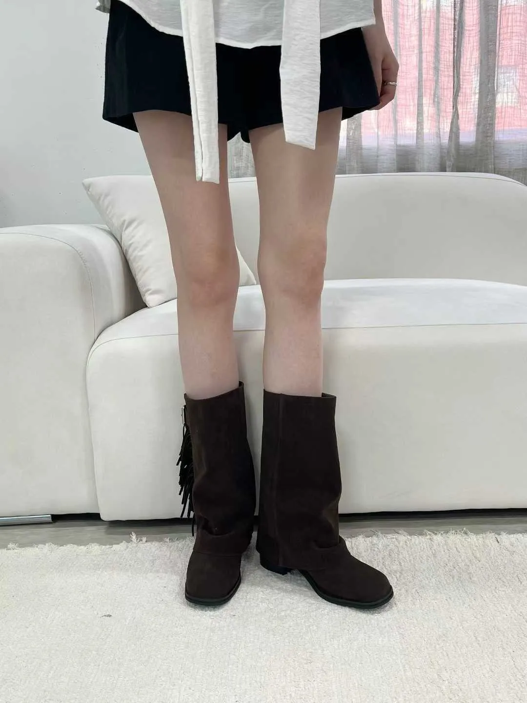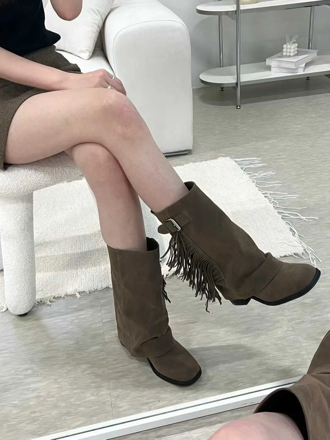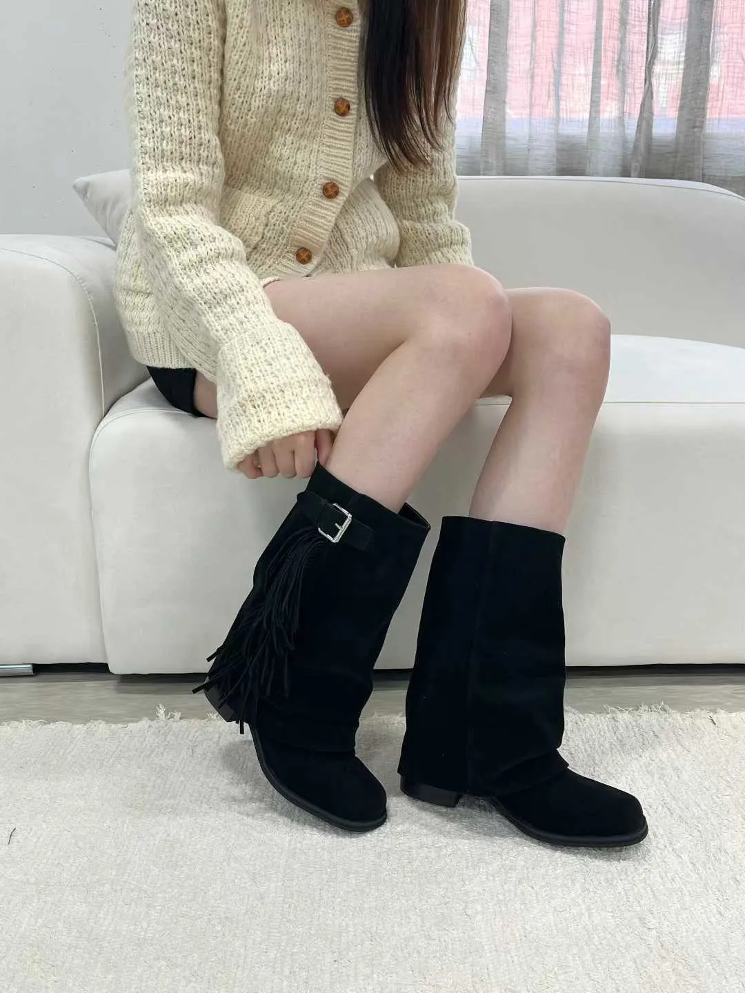側流蘇麂皮一片靴