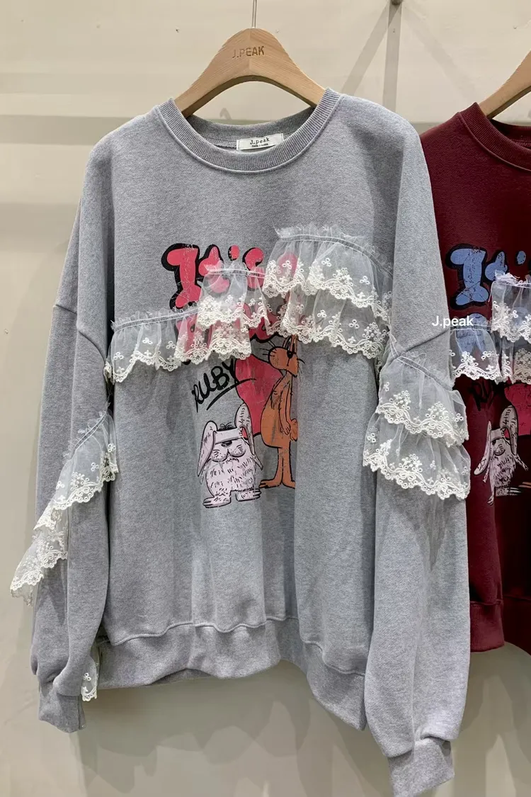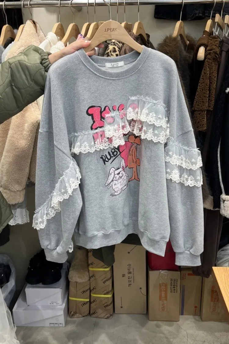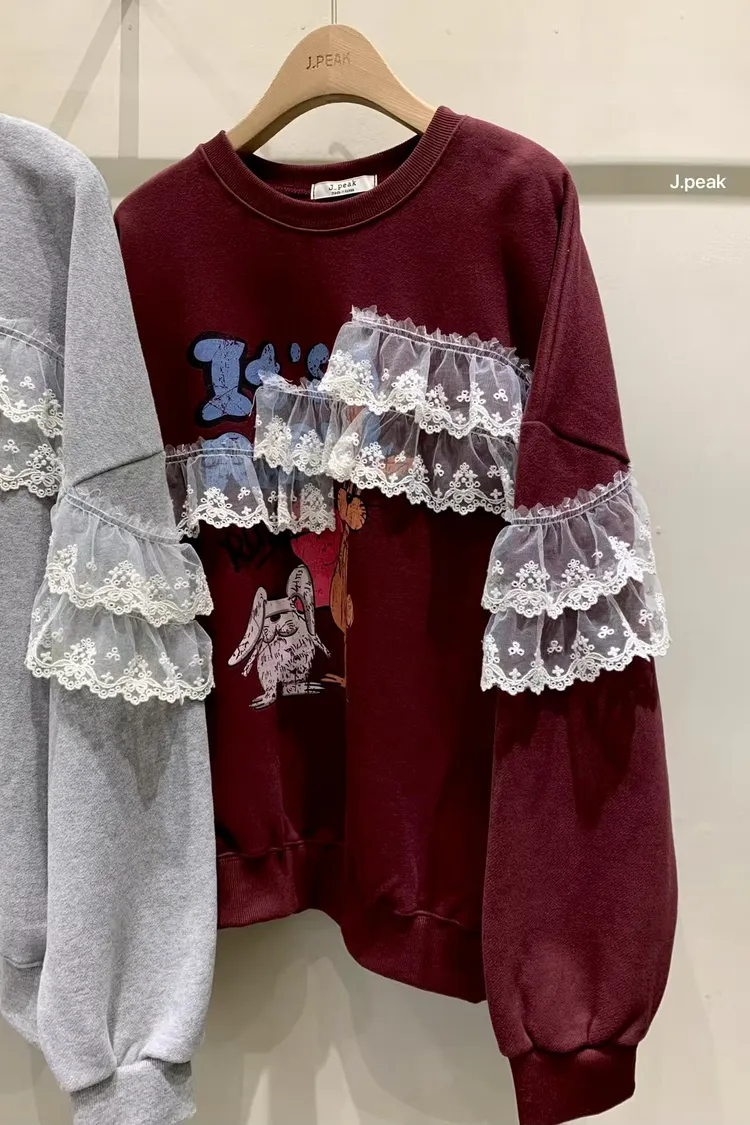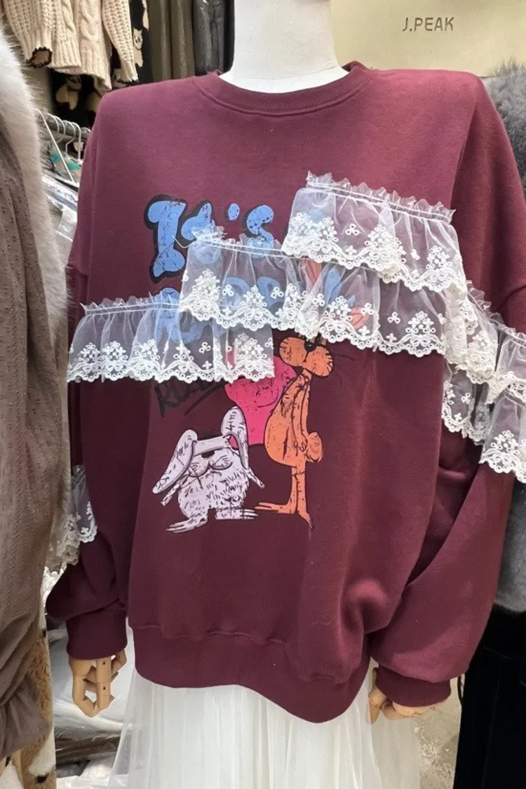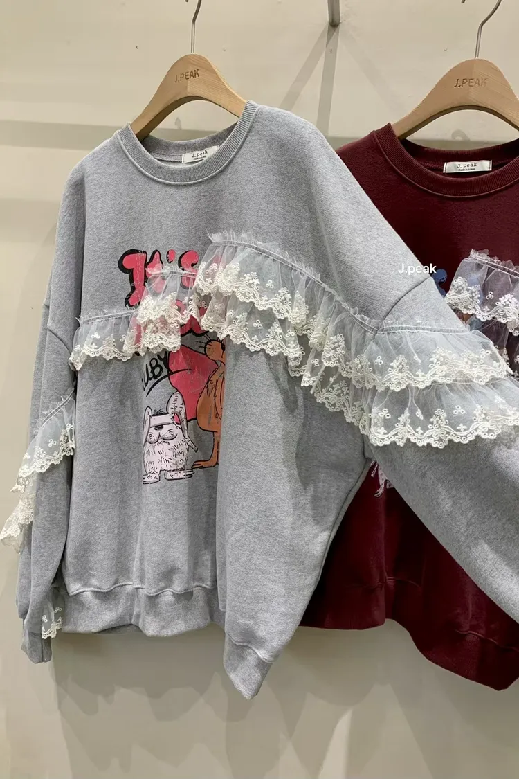 復古童趣蕾絲拼接印花加厚刷毛大學T