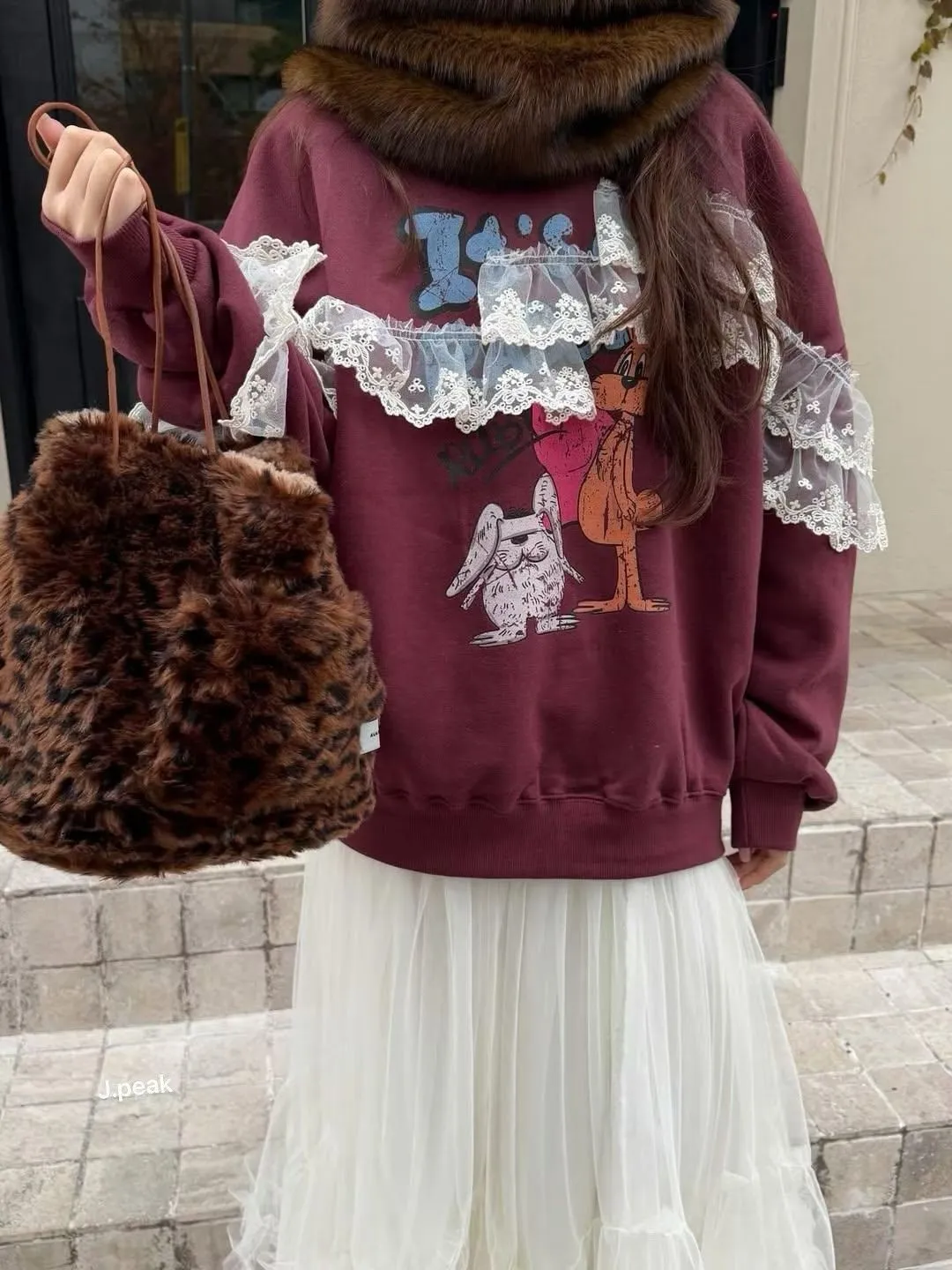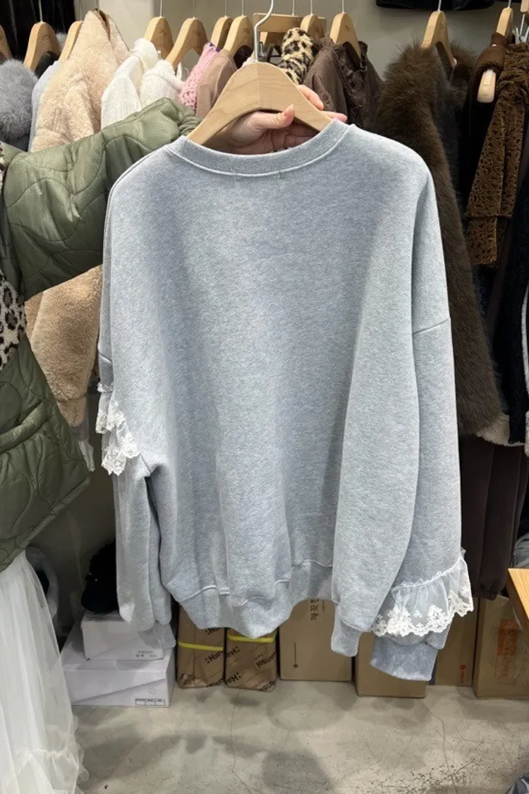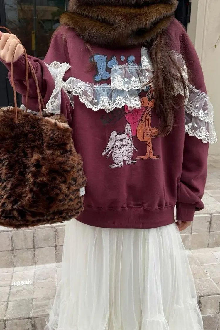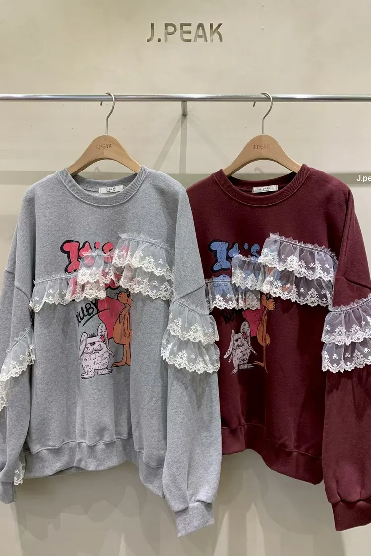 復古童趣蕾絲拼接印花加厚刷毛大學T