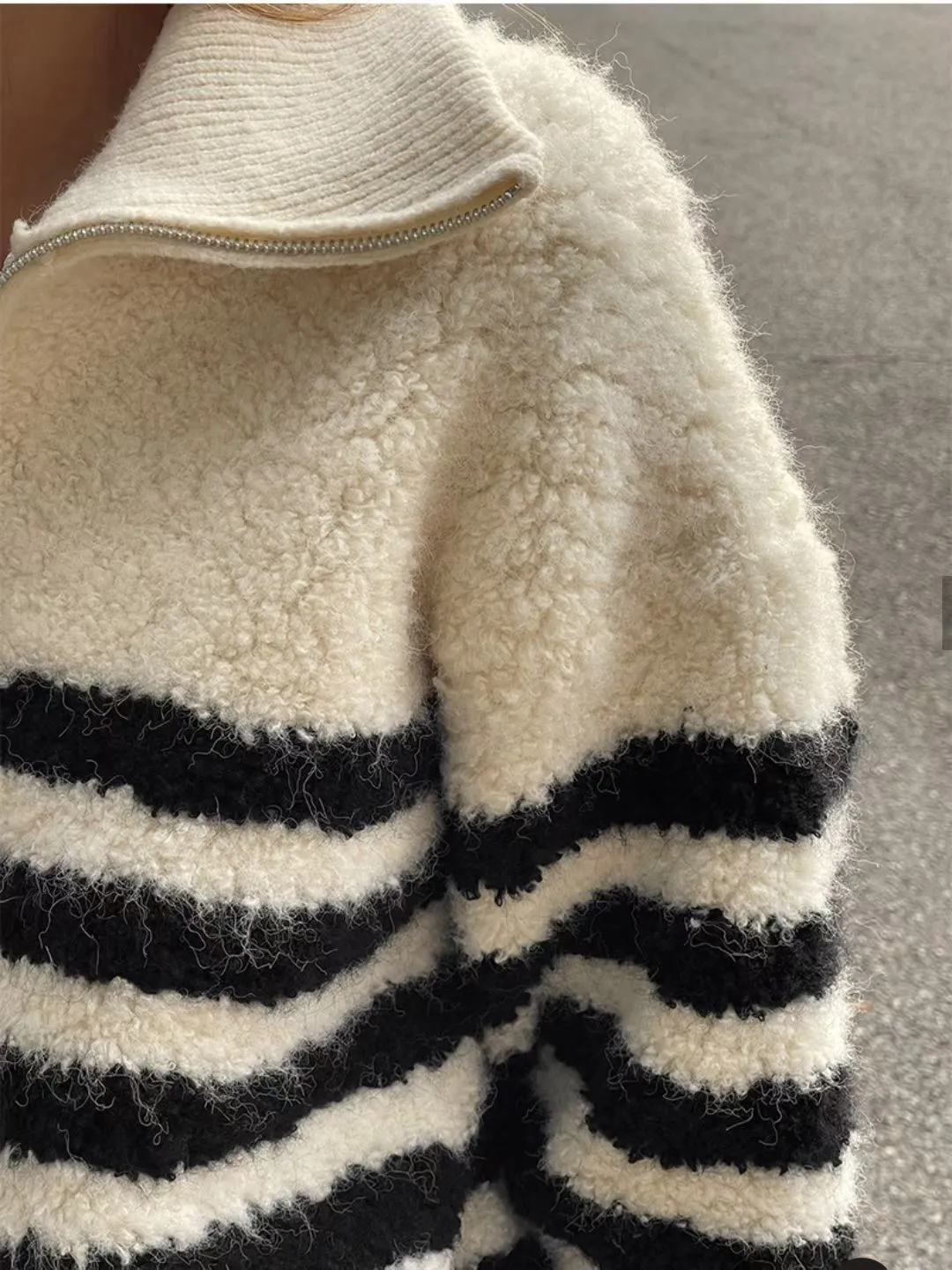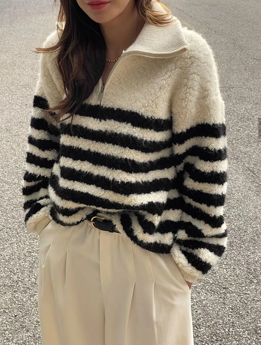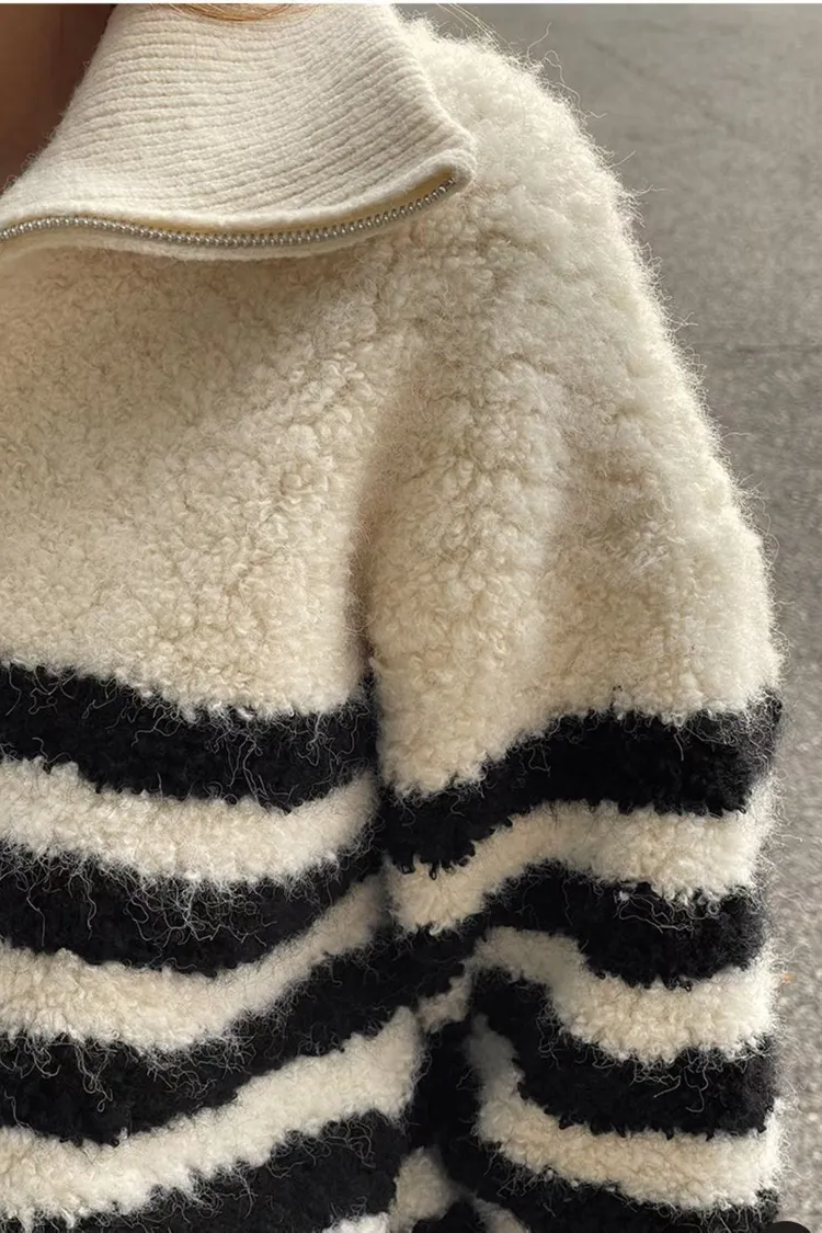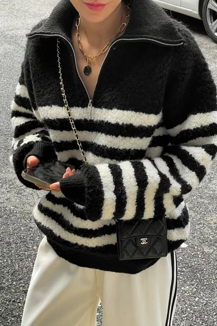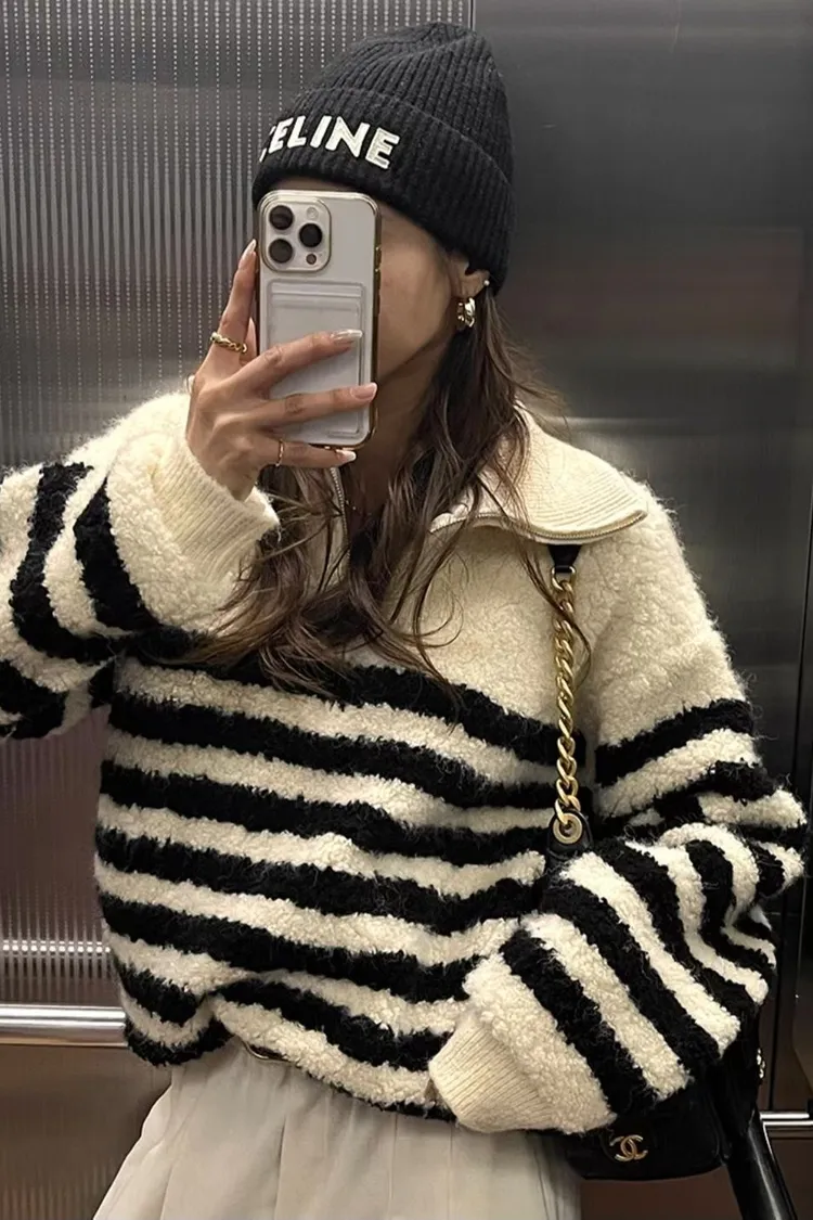 條紋羊羔絨半拉鍊保暖上衣