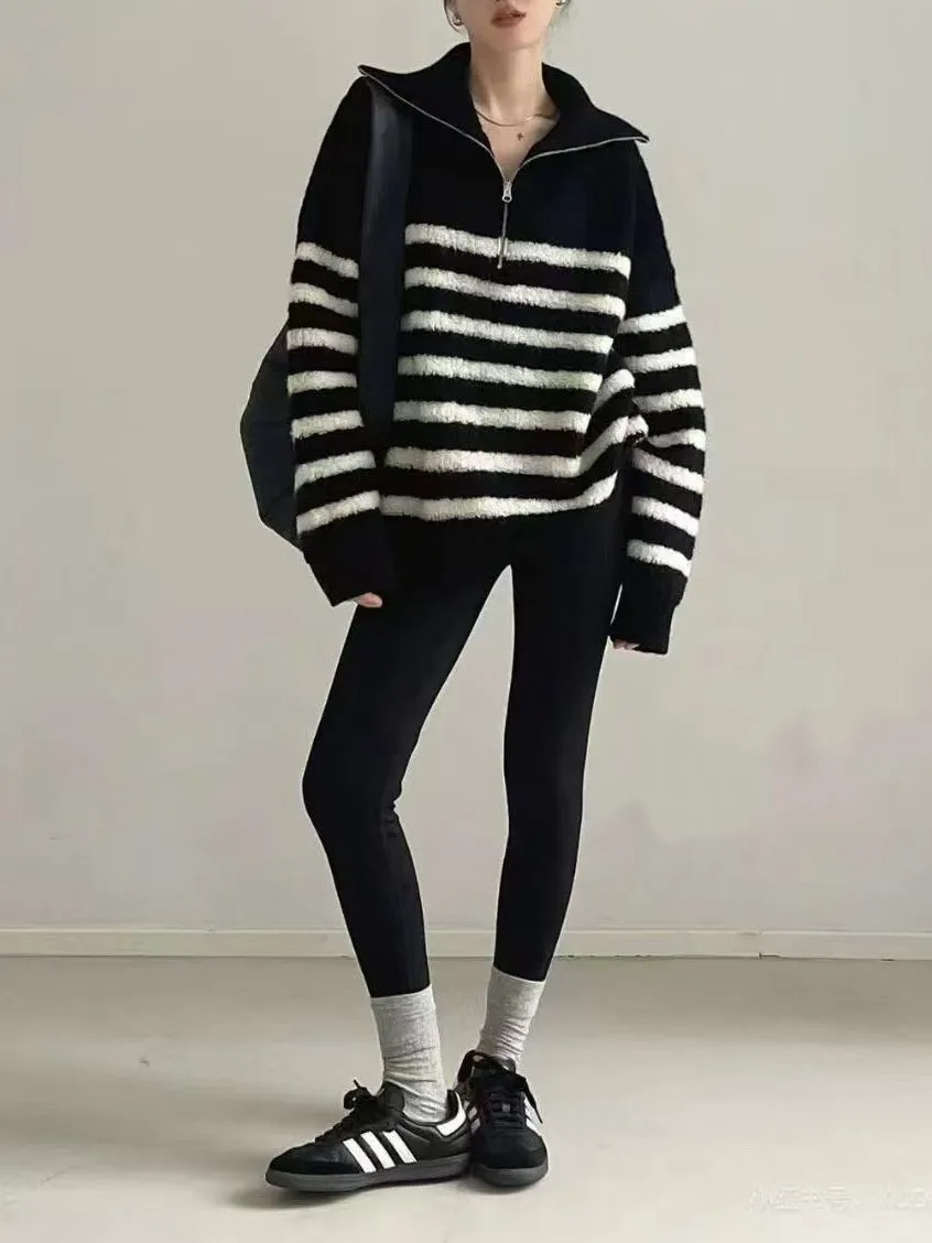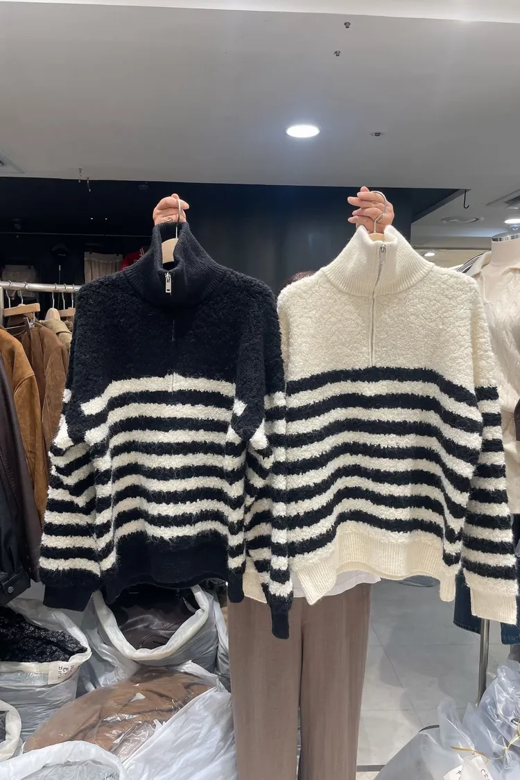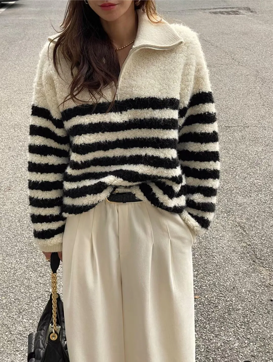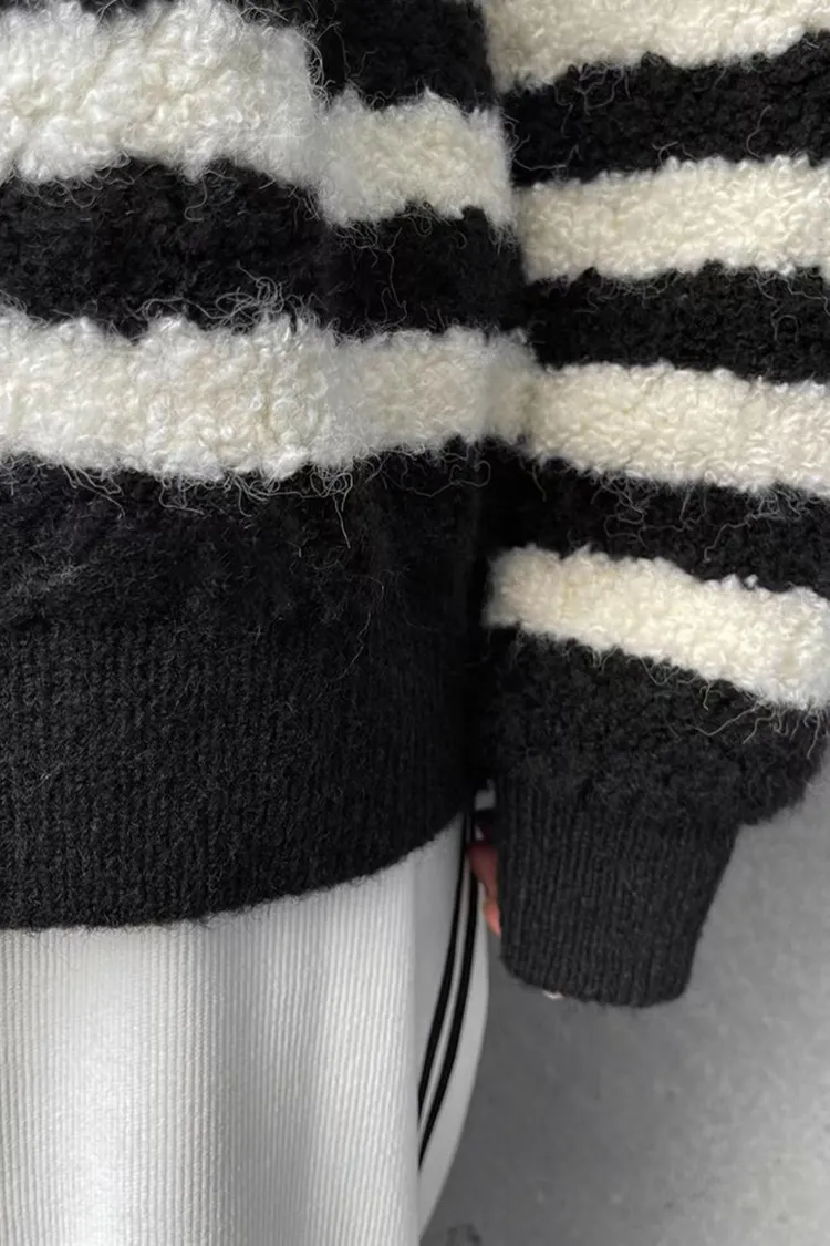條紋羊羔絨半拉鍊保暖上衣