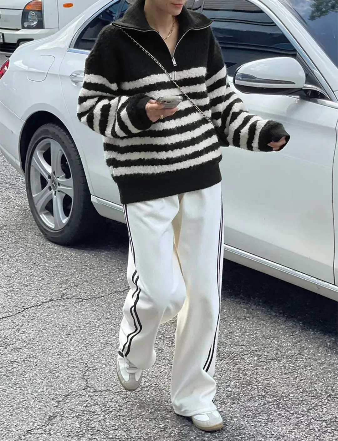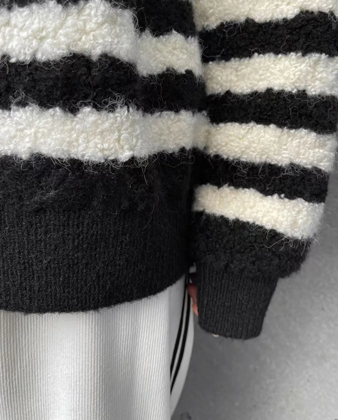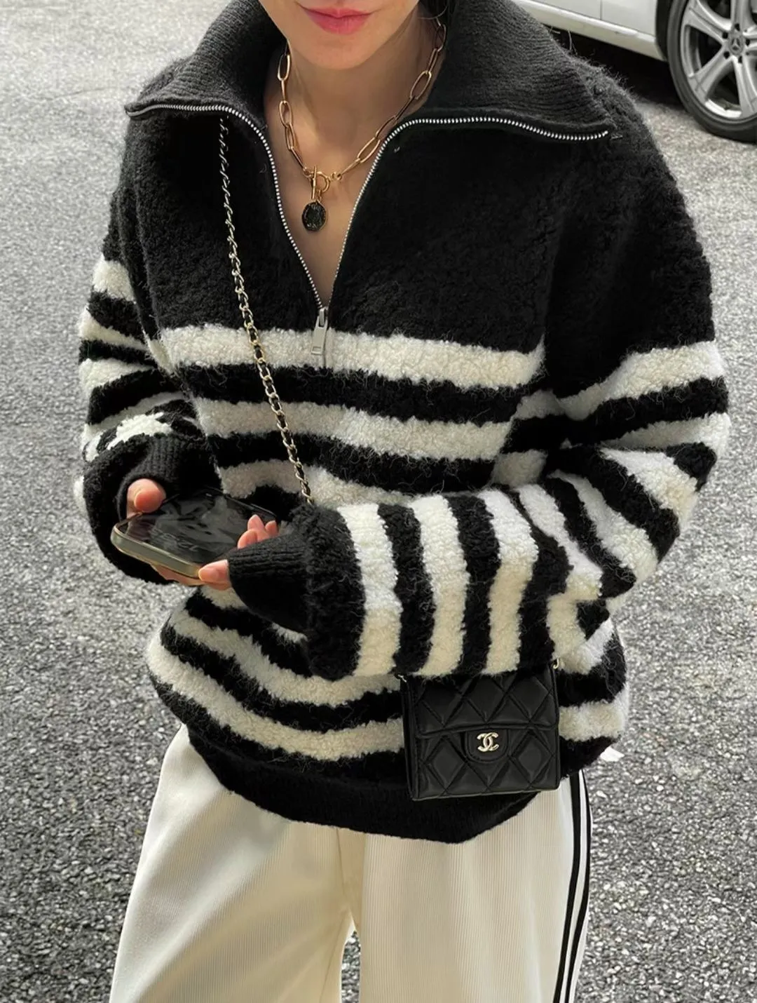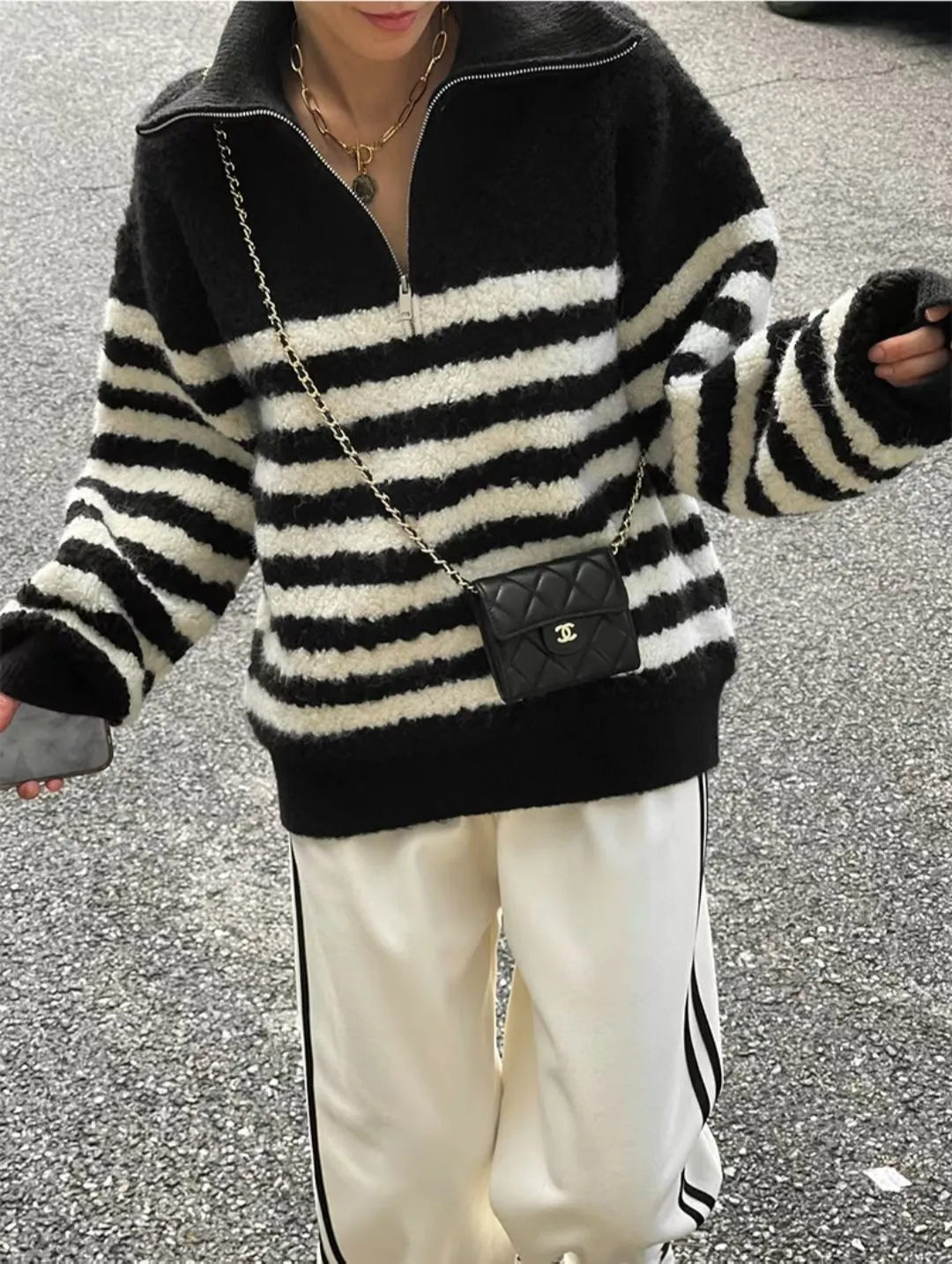 條紋羊羔絨半拉鍊保暖上衣